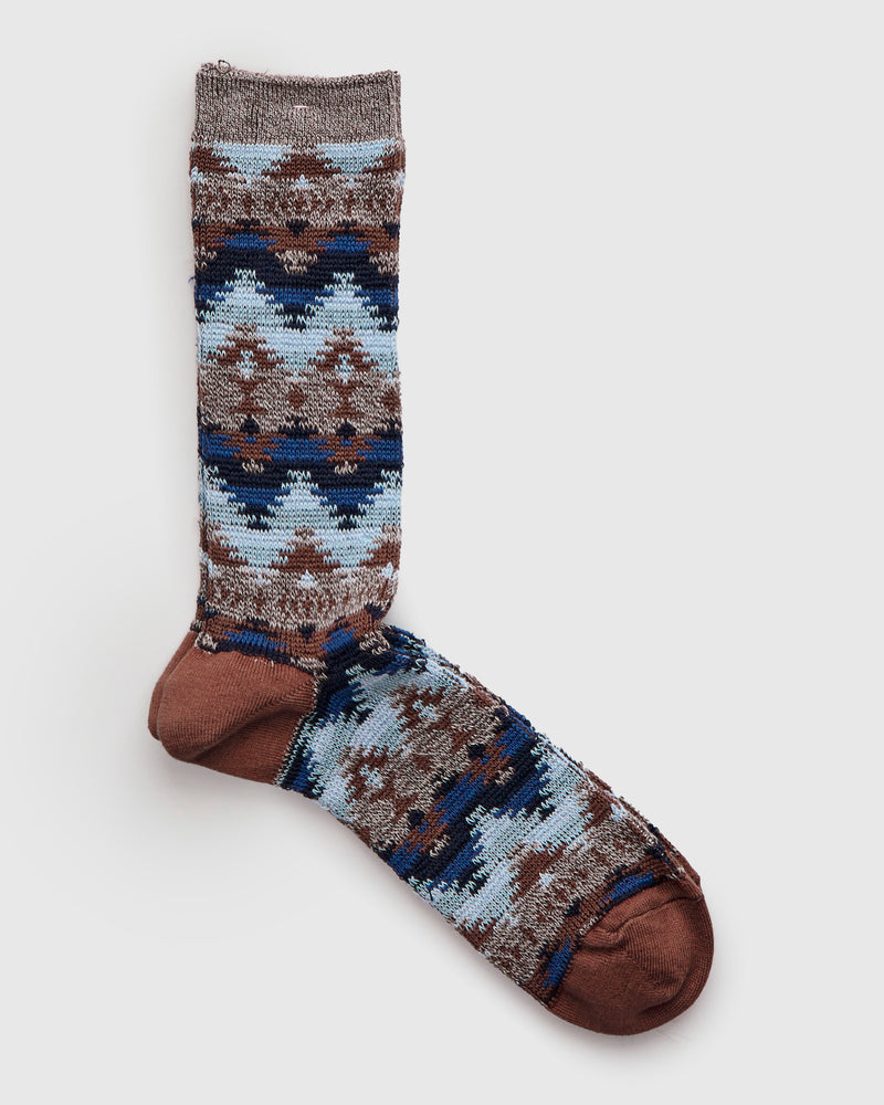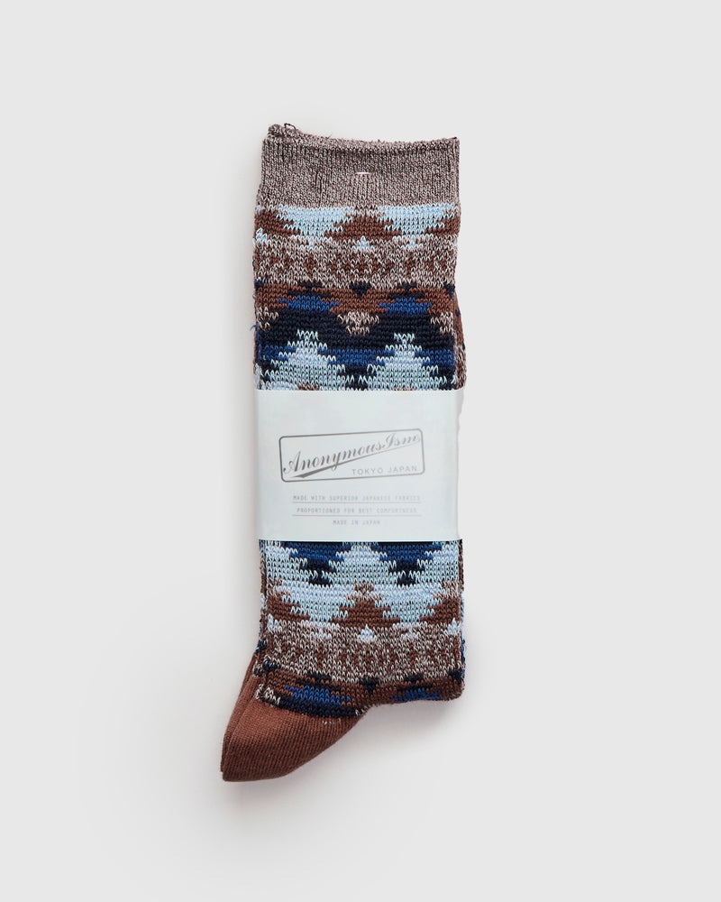 • The Apache crew socks from AnonymousIsm are a soft full-length sock that feature a repeating Southwestern-style pattern throughout. Each pair of AnonymousIsm socks are expertly crafted by their team in Tokyo, Japan.
