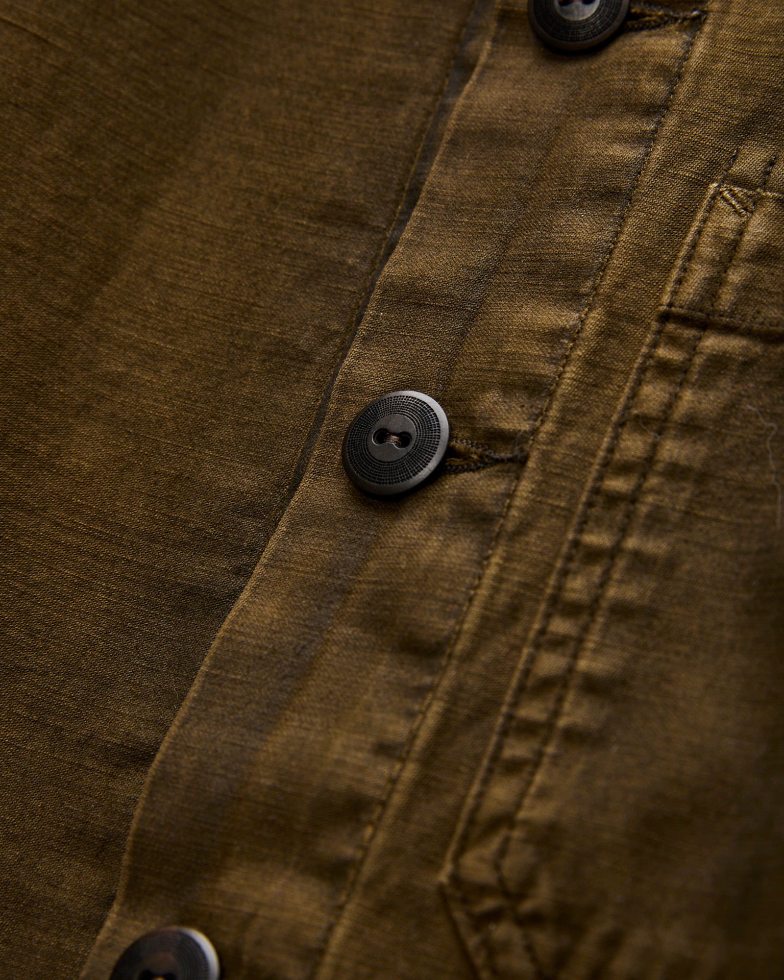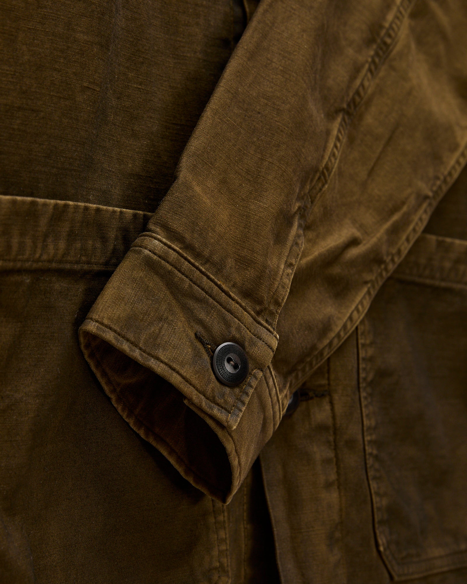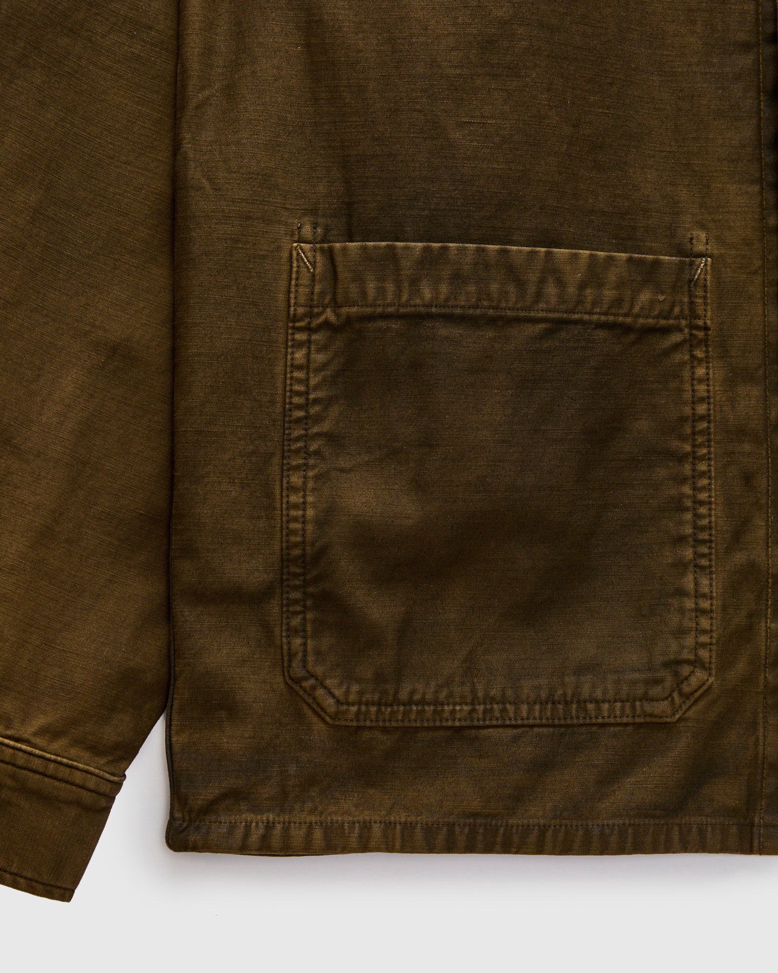 • This overshirt style from RRL is built using a textured Japanese cotton sateen fabric with the reverse side facing outward. The shirt has been overdyed a medium-brown color and heavily-laundered to create a vintage effect and soft feel across the garment. Detailed with three exterior pockets, corozo buttons, and a straight hem.