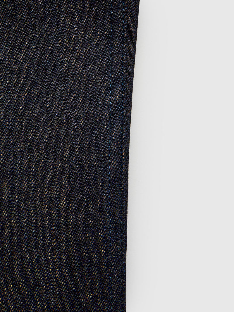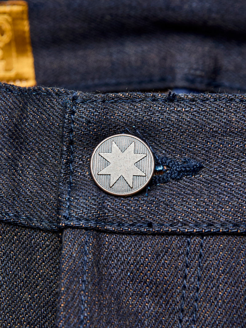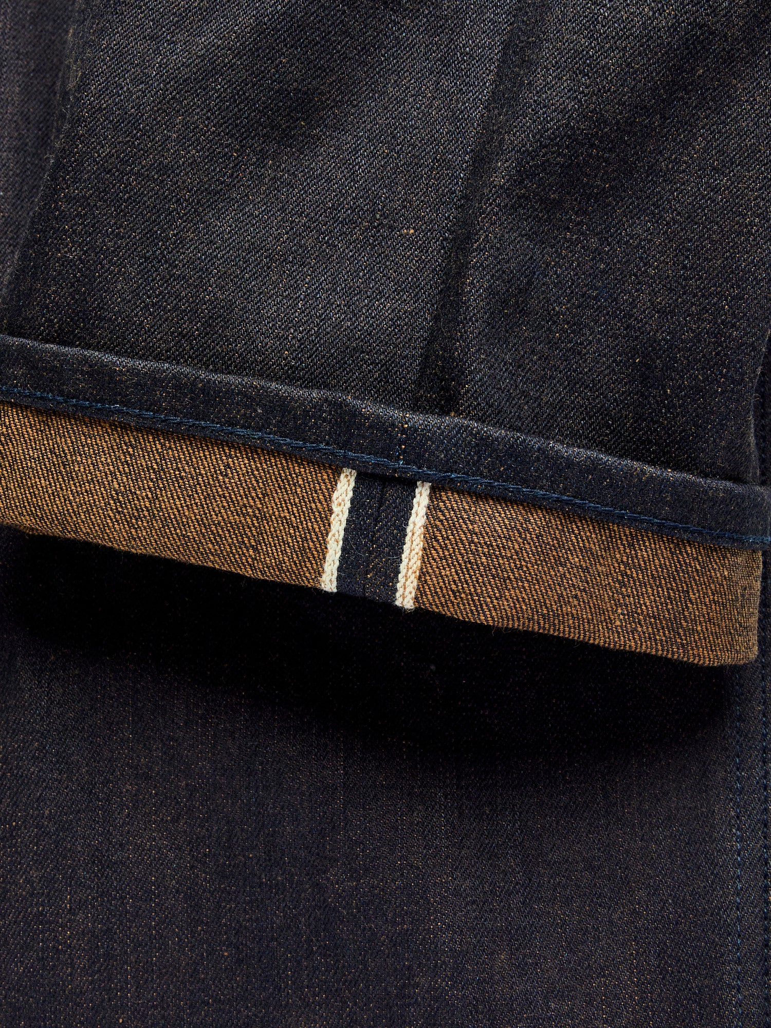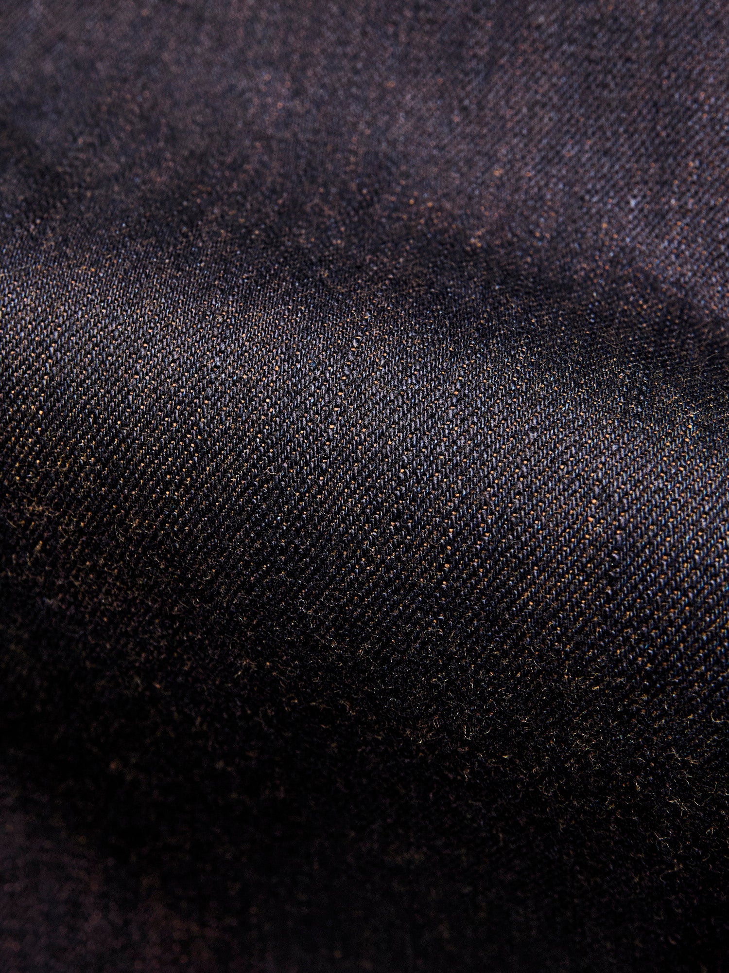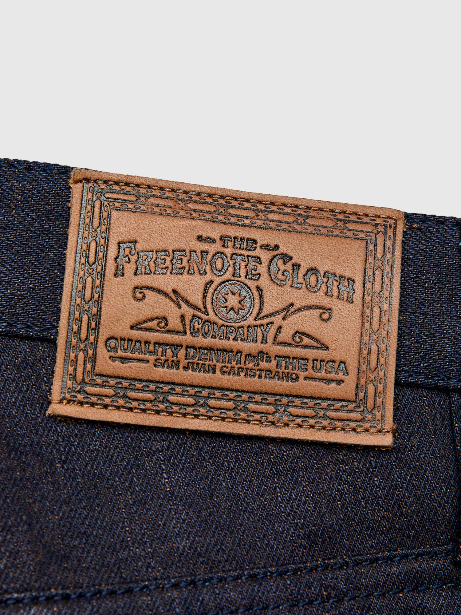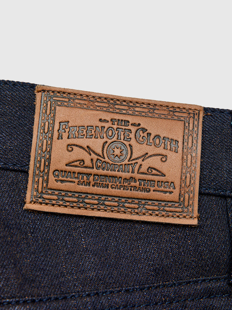 • Freenote Cloth introduces a new 16oz indigo brown denim, exclusively woven by Yoshiwa Mills in Japan. Featuring a deep indigo warp and brown interior weft, this denim showcases a rich dark blue exterior with golden-brown highlights subtly emerging through the fabric's surface. Woven at a substantial 16oz weight, the denim boasts a textured, shaggy surface that offers a softer hand feel and a unique character. Signature Freenote details include a sewn-in two-piece waistband, Japanese hickory stripe pocket bags, custom-branded hardware, and acorn-shaped rear pocket bags.