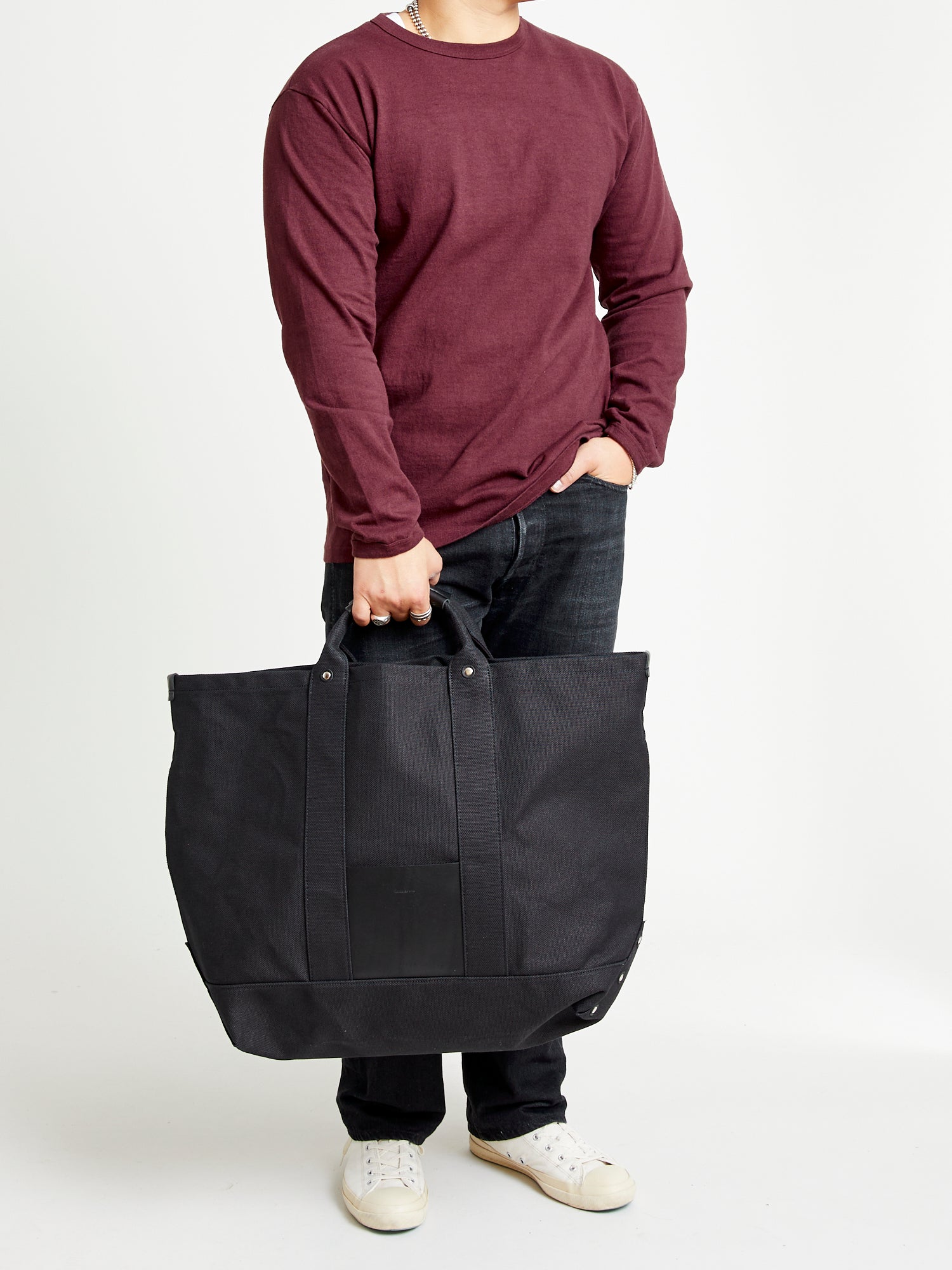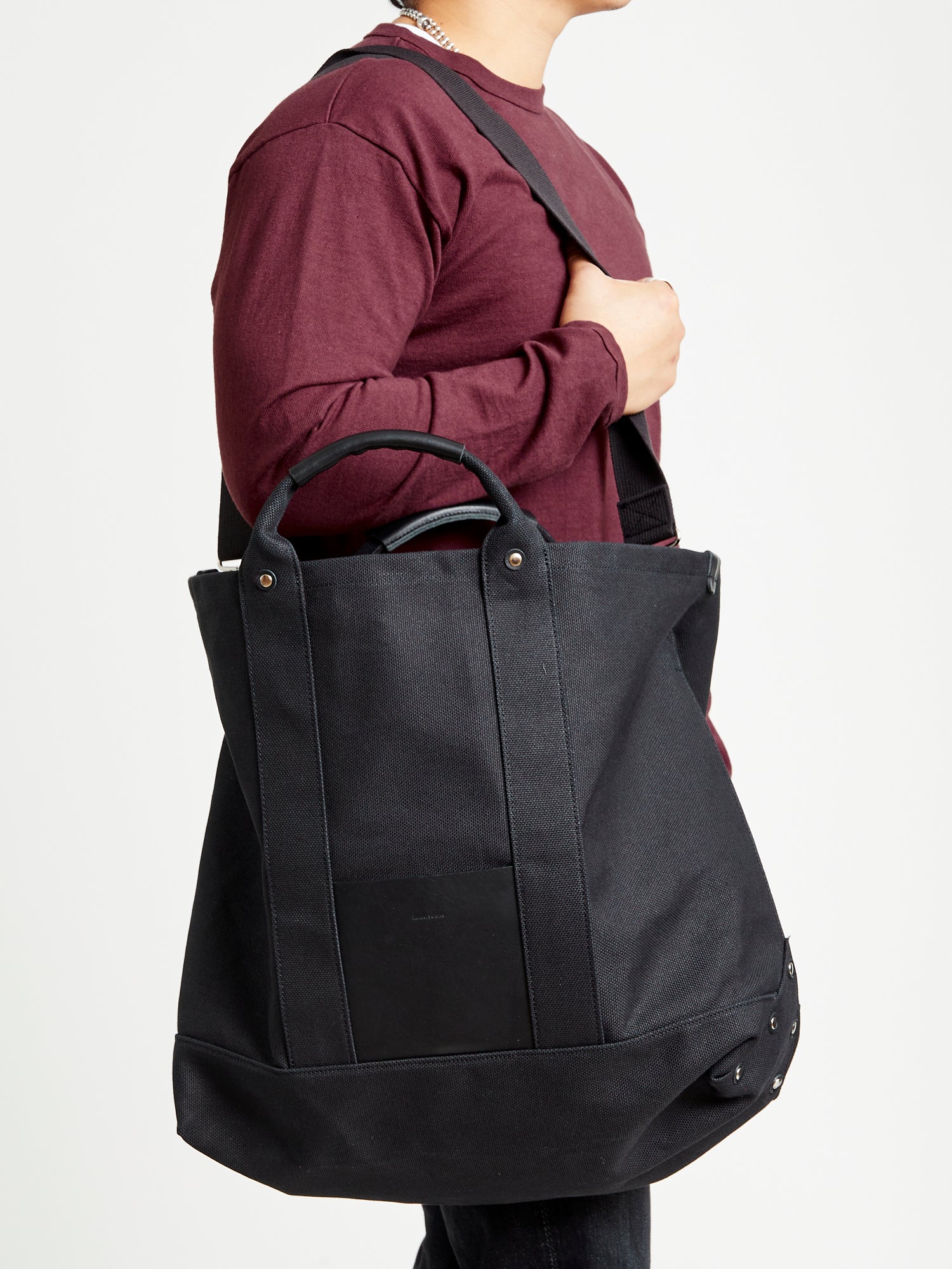 • This tote bag from Hender Scheme applies the brand's signature motifs to a highly-functional design. Made beautifully with a combination of vegetable-tanned cowhide and heavyweight canvas, this bag features an adjustable and removable shoulder strap in addition to carry handles decorated with leather. Reinforced with rivets at the bottom, this tote bag is designed to develop character and age with continued use; perfect for grocery runs or weekend getaways.
