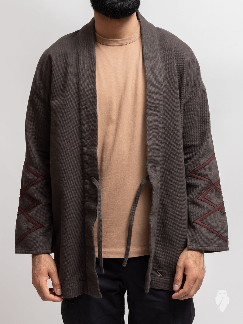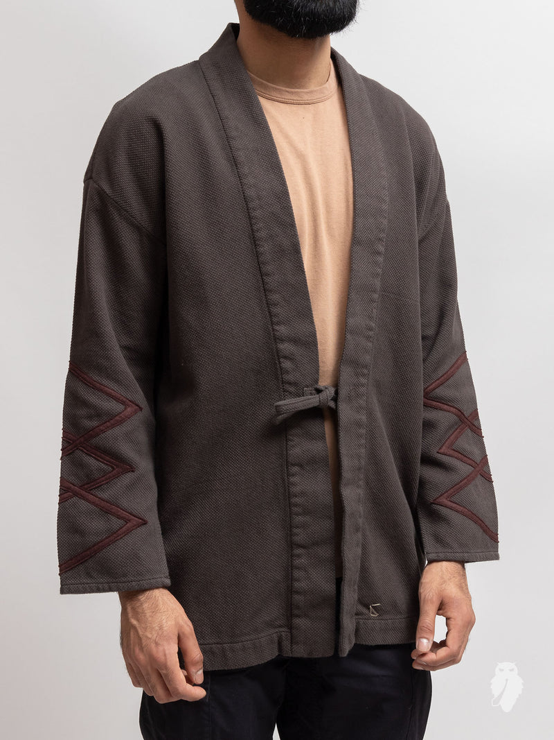 • The signature Haori Shirt from SOULIVE is the brand's contemporary take on the traditional Japanese haori jacket. Made from a lightweight sashiko fabric, the Caravan installment features tonal embroidery along the sleeves along with a waist tie and subtle SOULIVE logo stitching at the hem. Pigment-dyed for a rich color that will fade with wear.