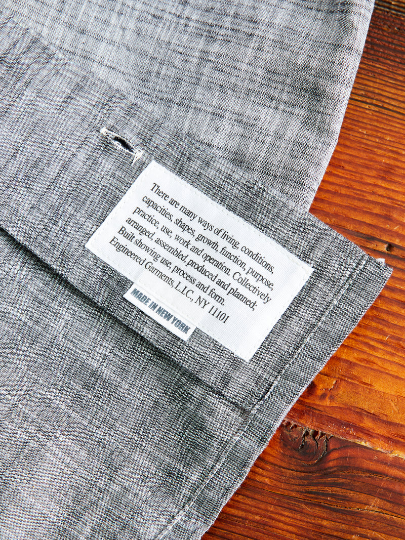 • Founded 1999 by Daiki Suzuki in New York City, the Engineered Garments mission statement is "to make garments that become more personal through the experiences you have with them." Drawing from years buying for Nepenthes stores, Suzuki values unique garment construction with attention to detail; realized through Engineered Garments. Each piece in the brand's ever-evolving catalog is designed with hidden qualities and meaning, straying from the idea of "perfect design."