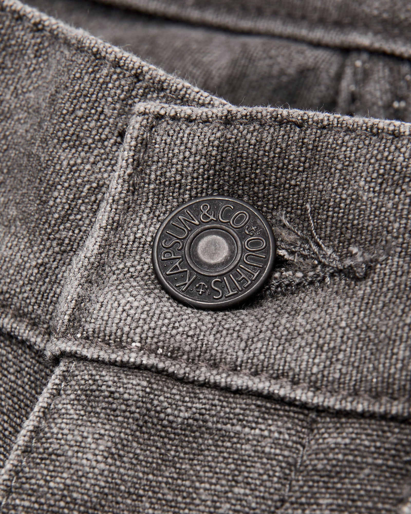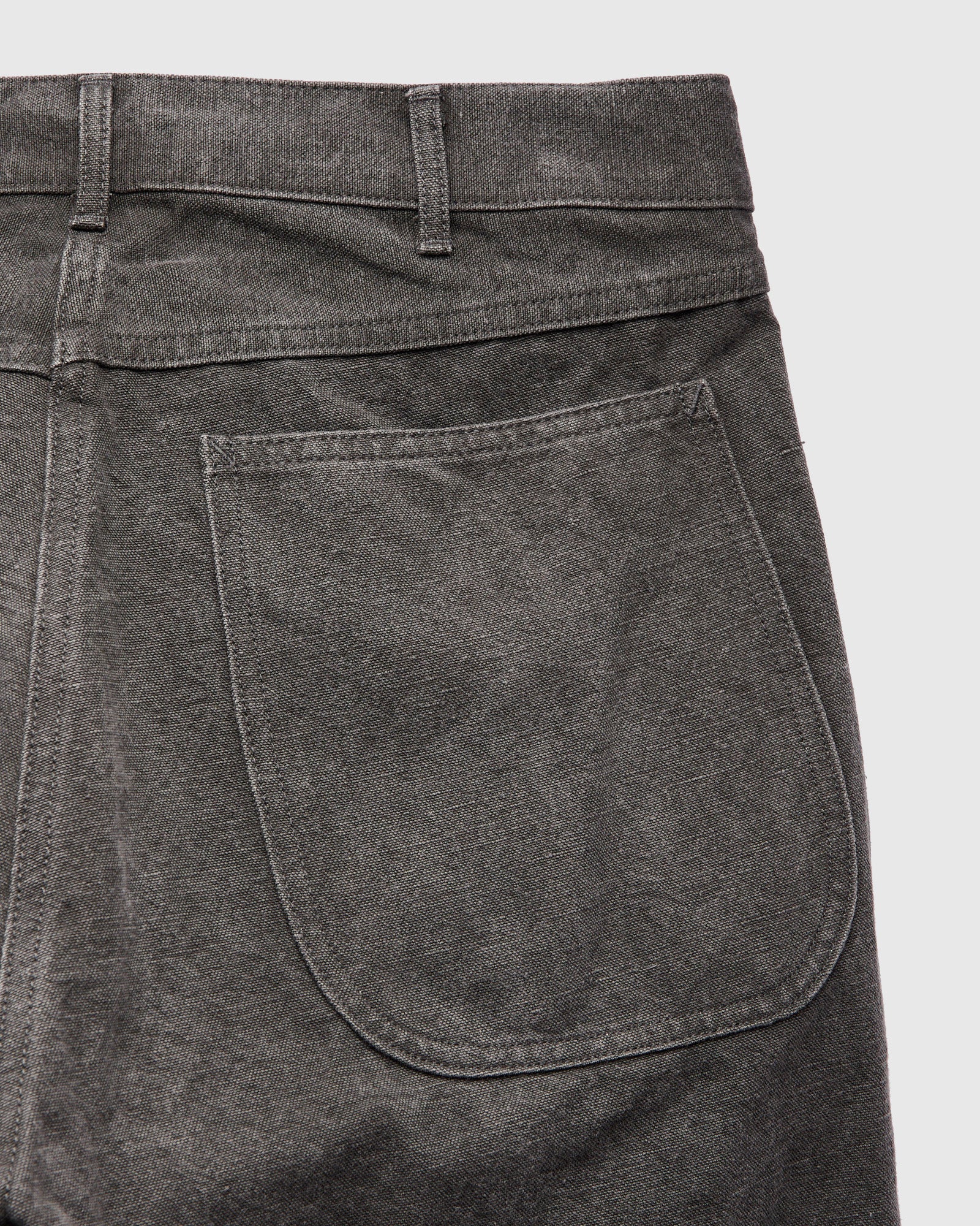 • Kaptain Sunshine's Painter Pants are crafted from a heavyweight oxford fabric, densely woven using cotton yarn at the warp and thick hemp at the weft. The result is a hard-wearing fabric with a varied surface texture and breathable weave. Dyed a rustic-black using Japanese sumi ink, the pants have undergone a rinse process to bring out the fabrics texture and reduce shrinkage. Fitted with canvas pocket bags, metal button fly, and large patch pockets at the rear.