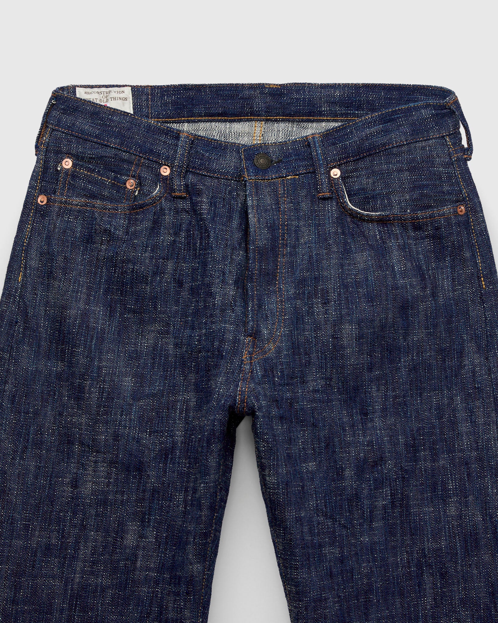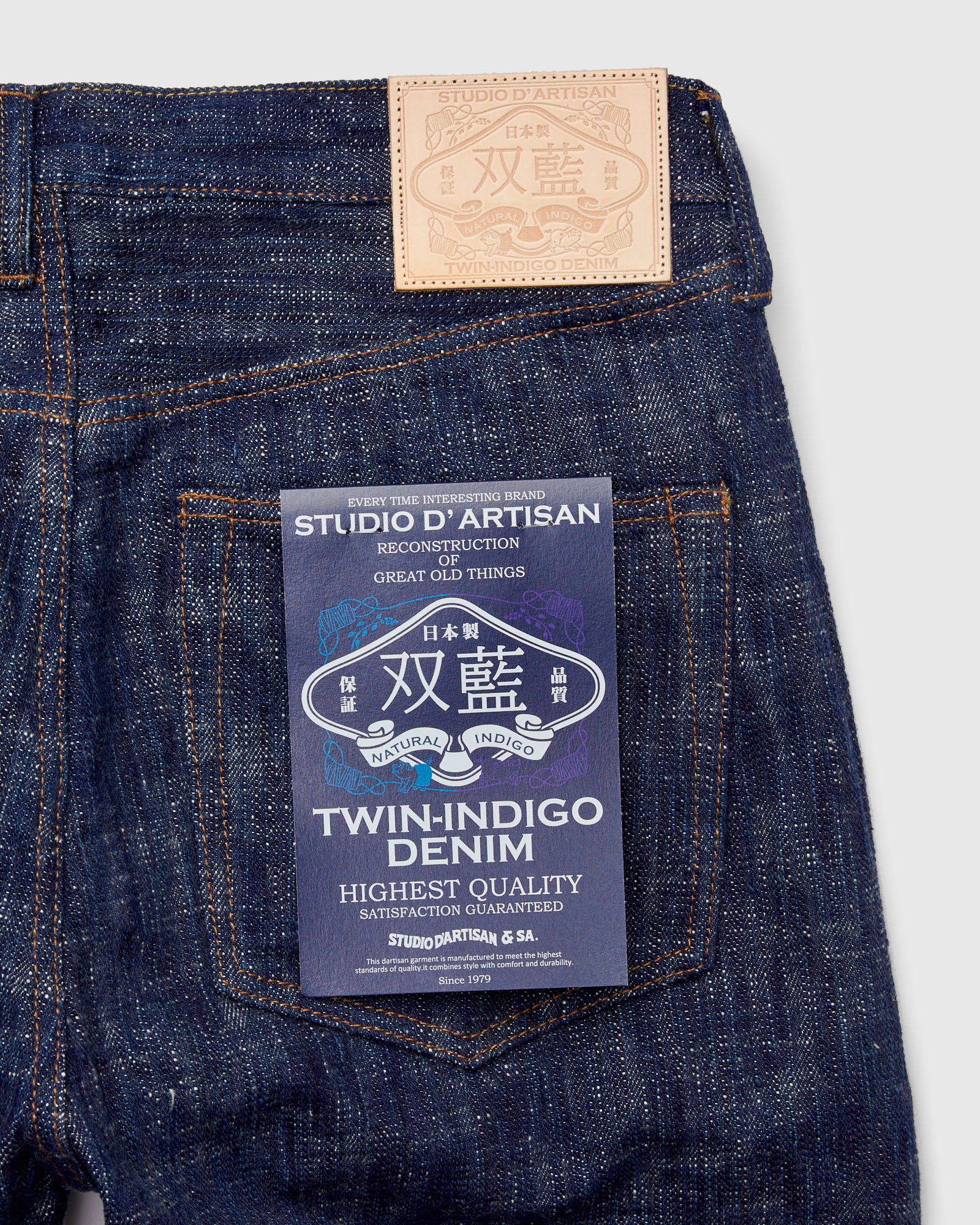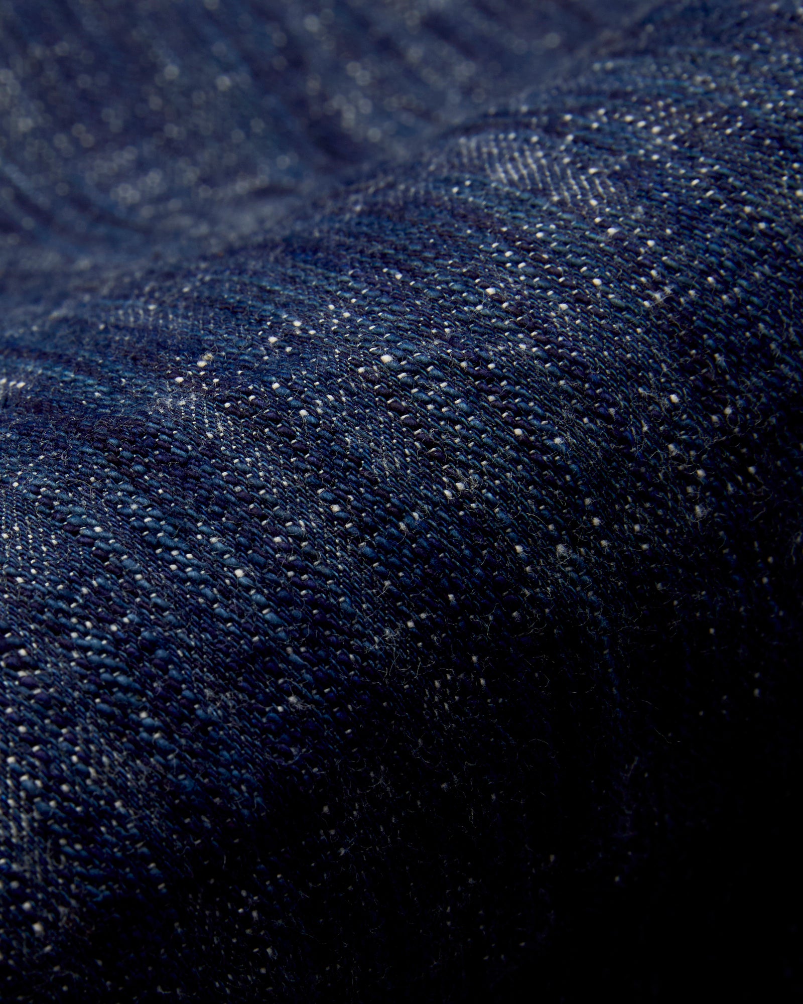 • Studio D’Artisan’s “Sou-Ai” (Twin Indigo) denim blends two distinct indigo dyeing techniques to create a fabric rich in texture and tonal depth. The warp is kase-dyed using a mix of Tokushima Natural Indigo and Pure Indigo (featuring both redcast and greencast hues), while the weft is left a natural ecru to preserve contrast. The traditional kase-zome technique retains the yarn’s natural slub and irregularity, giving the denim a layered appearance and signature “rain” streak pattern associated with Tokushima dyeing. Woven at 16oz with a super low-tension weave, the denim is heavily textured and fades with high contrast over time thanks to the combination of natural and synthetic indigo yarns. Rinsed once to eliminate shrinkage, this limited-edition release features custom anniversary details exclusive to the collection.