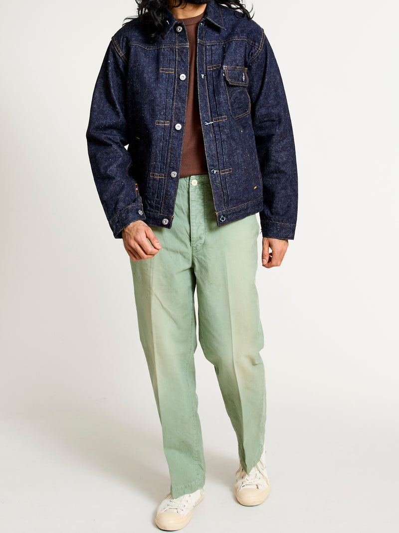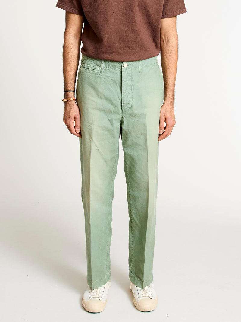 • The Field Chinos are a utilitarian style receiving influence from military baker pants. Custom woven with super long staple cotton, the chinos sport a sleek, fine texture with a soft to touch hand-feel. The pants have undergone a garment dye and feature a distressed finish with subtle oil detailing for a uniquely rustic look. Cut in a straight leg fit, the pants are fitted with original metal button, welt pockets at the rear, and slant pockets at the waist.