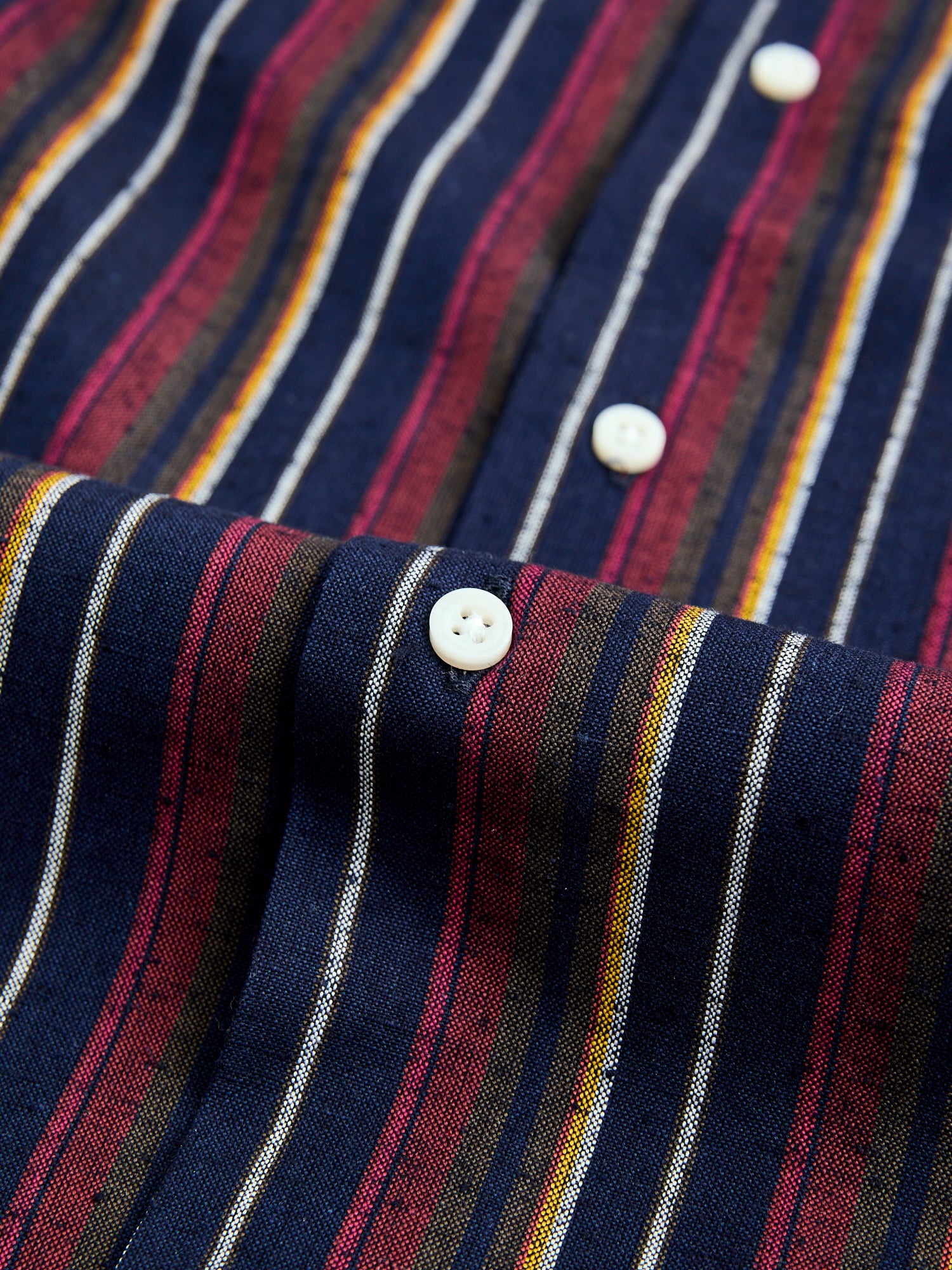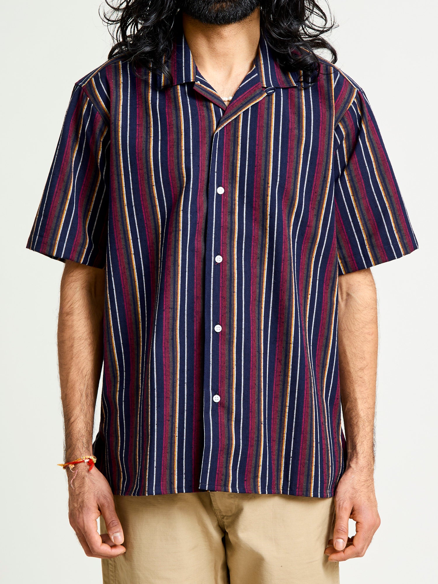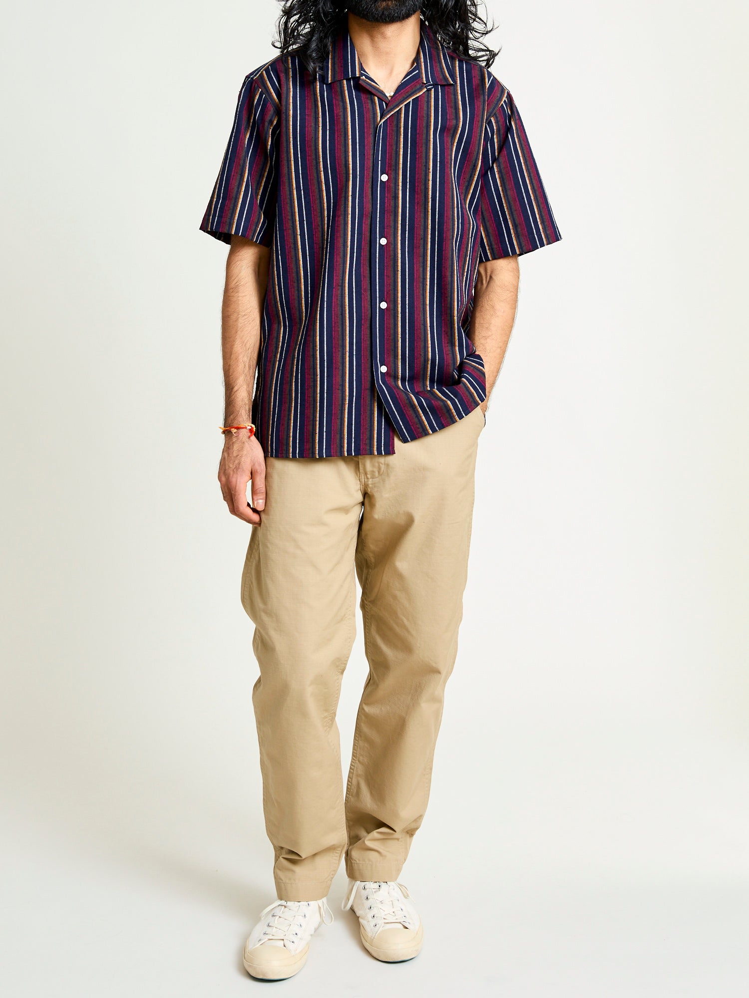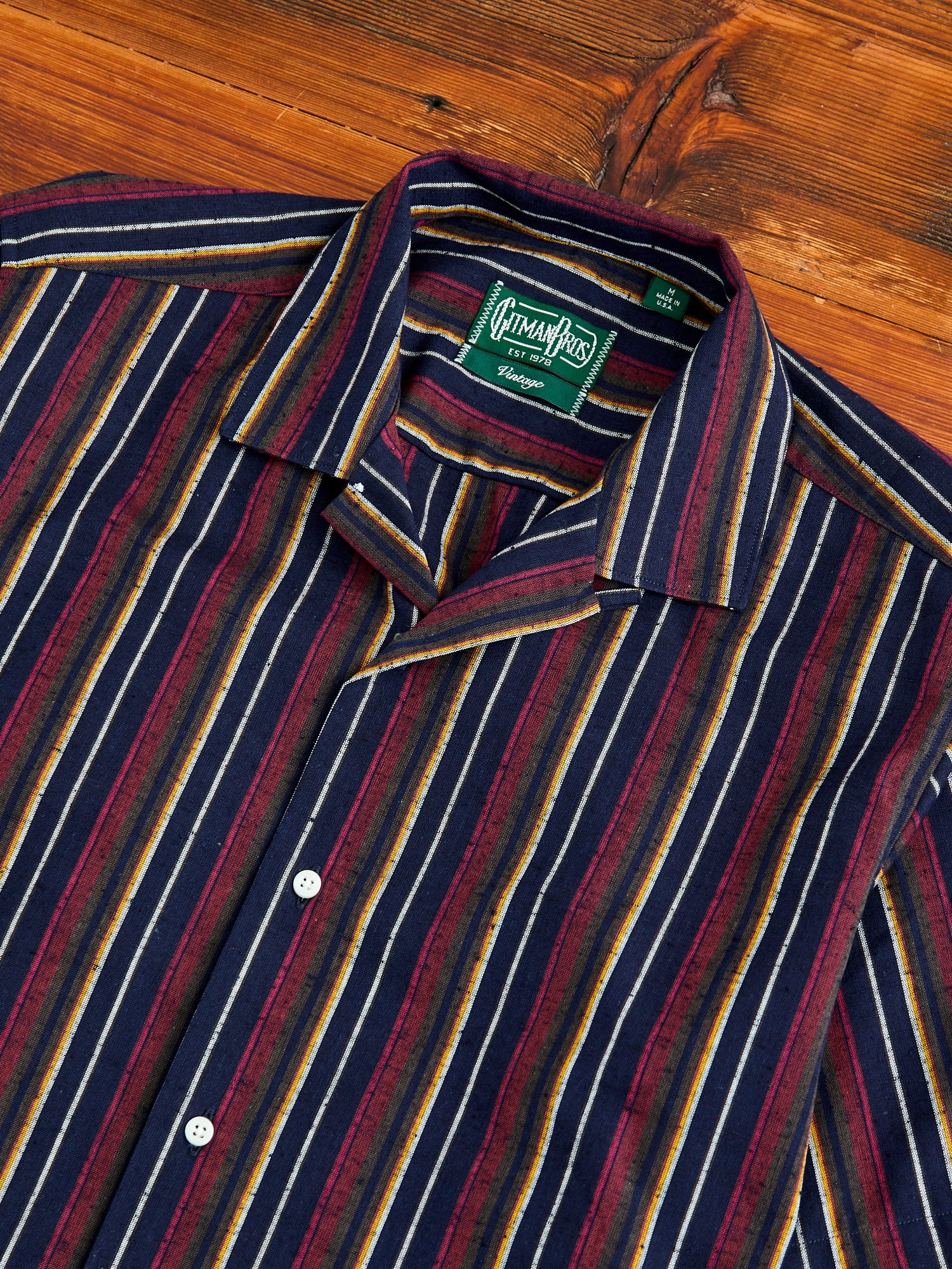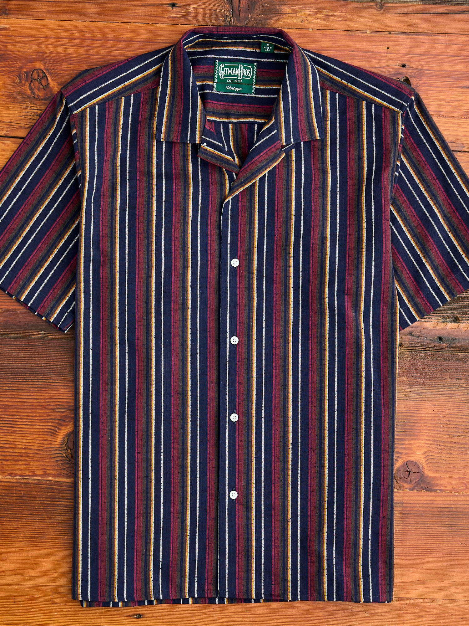 • This camp shirt from Gitman Vintage is made from a unique fabric at their Lafayette, Tennessee factory. This shirt features a deadstock Japanese Cabana stripe fabric. Finished with minimal detailing and sewn in the camp shirt style - a relaxed fit, straight hem cut designed for more breathability in warm weather.