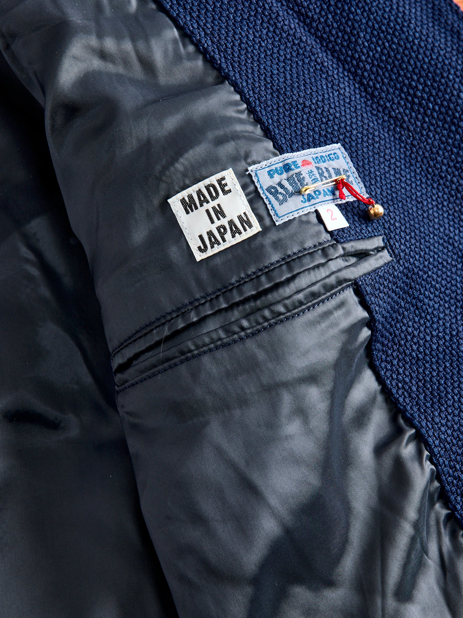 • The Tailored Jacket from Blue Blue Japan seamlessly marries contemporary suiting with traditional Japanese sashiko fabric. Renowned for its exceptional durability and history in martial arts, this Double Cloth Sashiko fabric sports a substantial feel and loosely-woven texture. The jacket is hand-dyed a deep indigo color, yielding a beautiful blue shade that will fade with wear and flourish with age. The tailored jacket features a two-button blazer design with lined sleeves and yoke.
