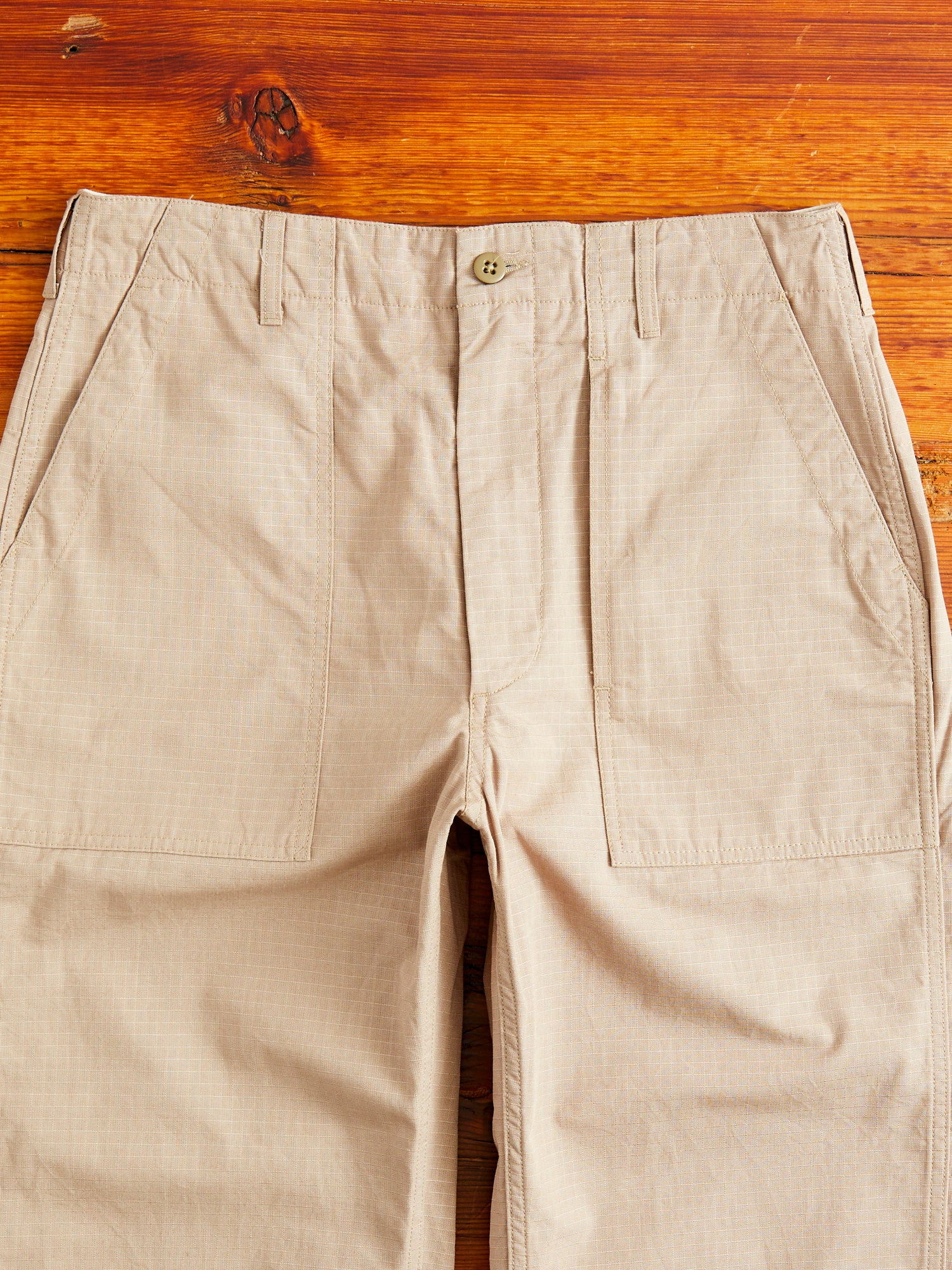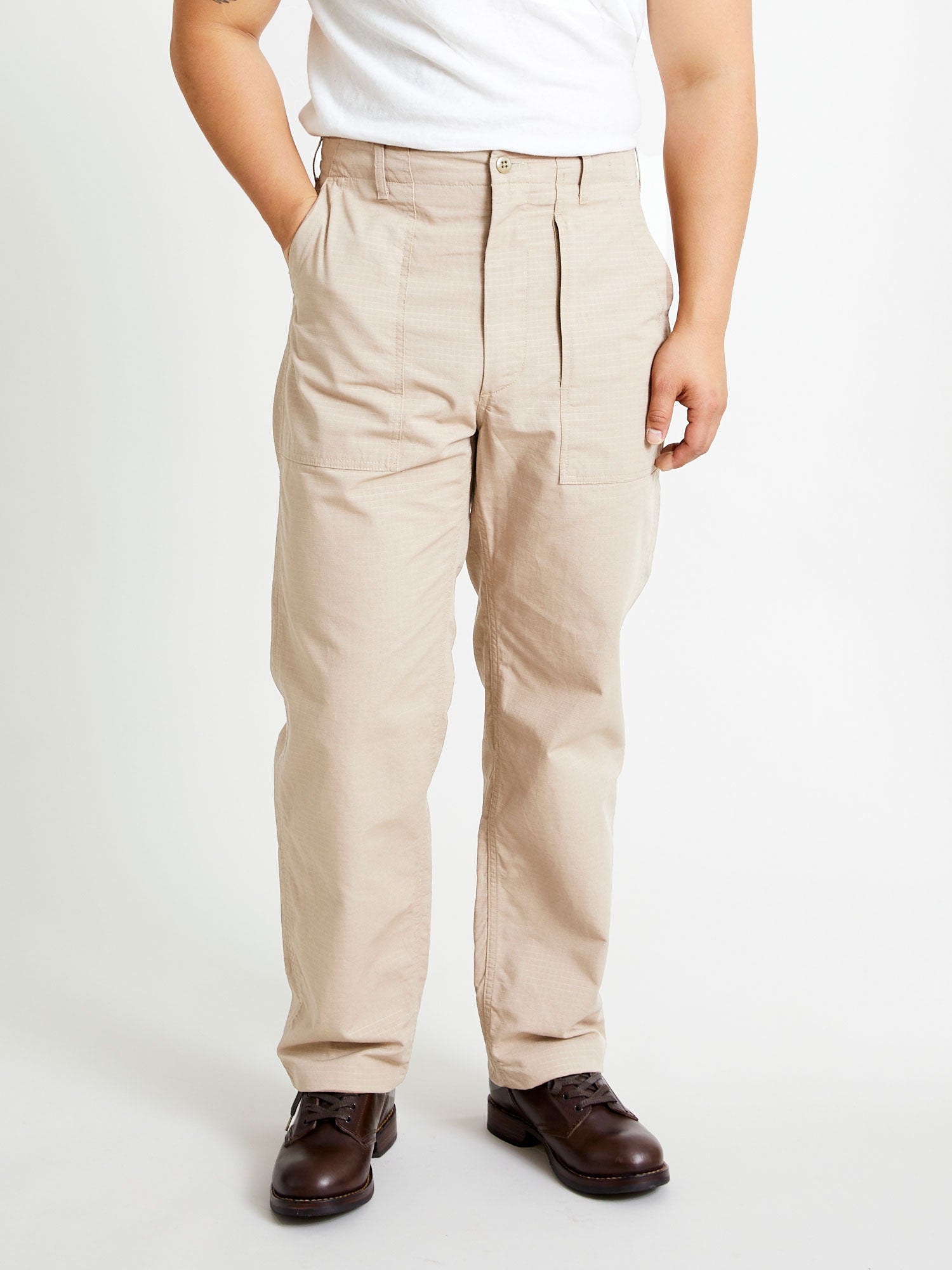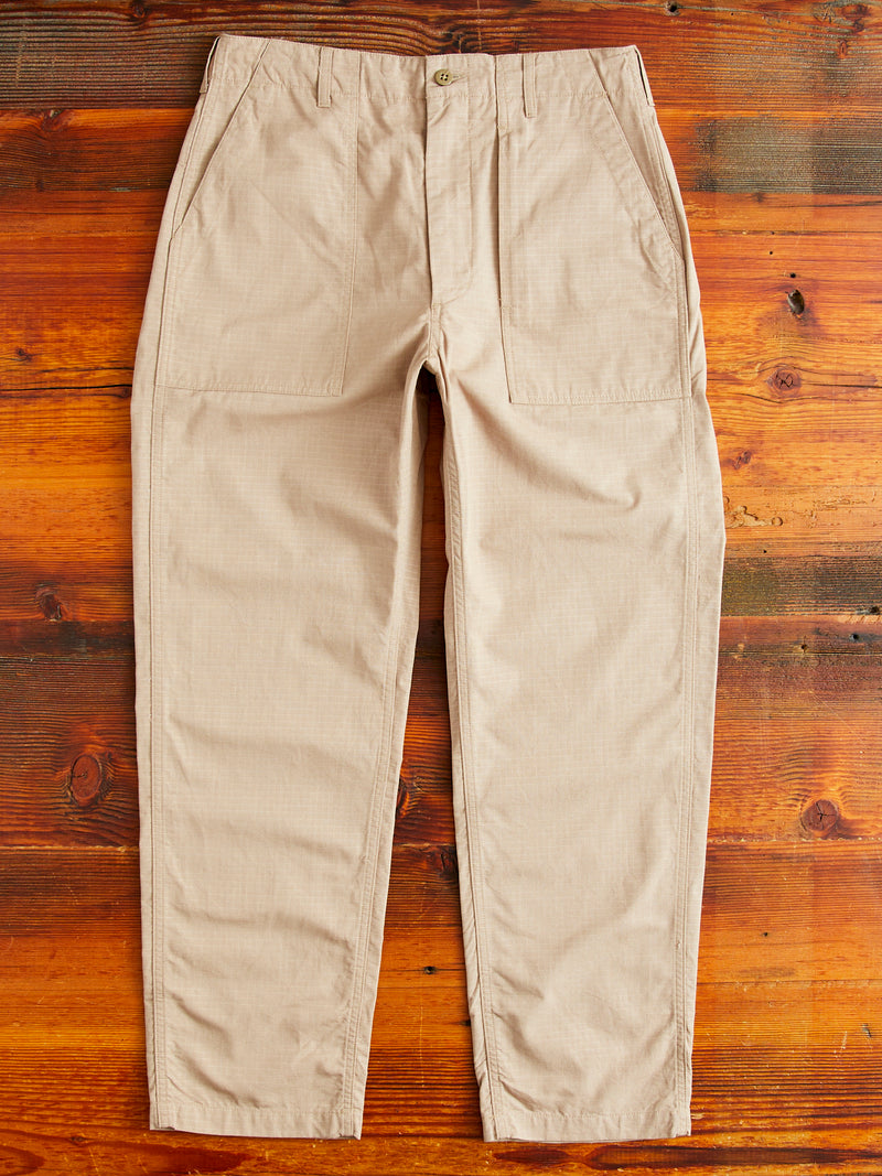 • A military inspired classic, Engineered Garments updates the iconic Fatigue Pant silhouette with great attention to detail. Featuring a durable cotton-ripstop fabric, the pants sport a sturdy and lightweight feel. The pants come cut in a tailored straight-leg fit, with a roomy top-block and slight taper down the leg. Detailed with drawstrings at the waistband, large fatigue-style pockets, and cinch openings at the hem, designed to lead a string through to adjust leg opening.
