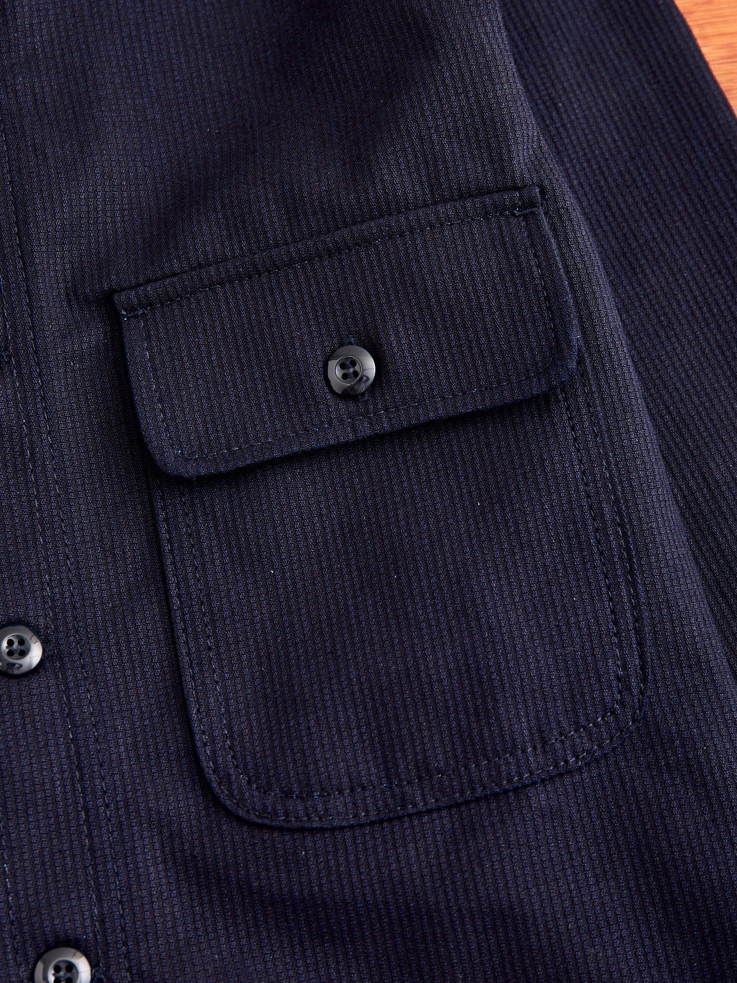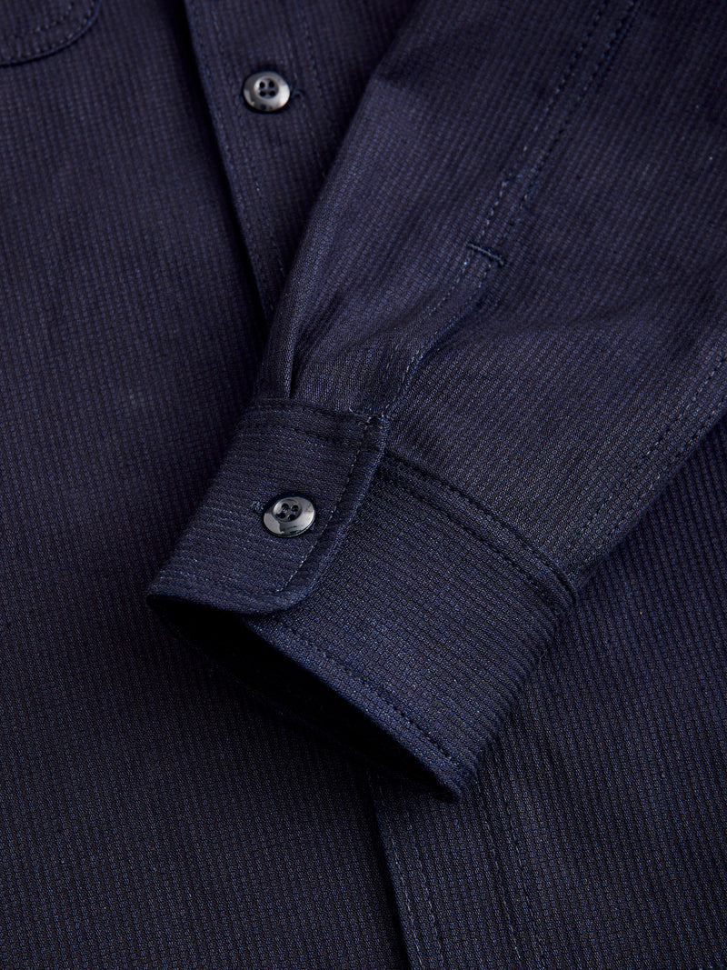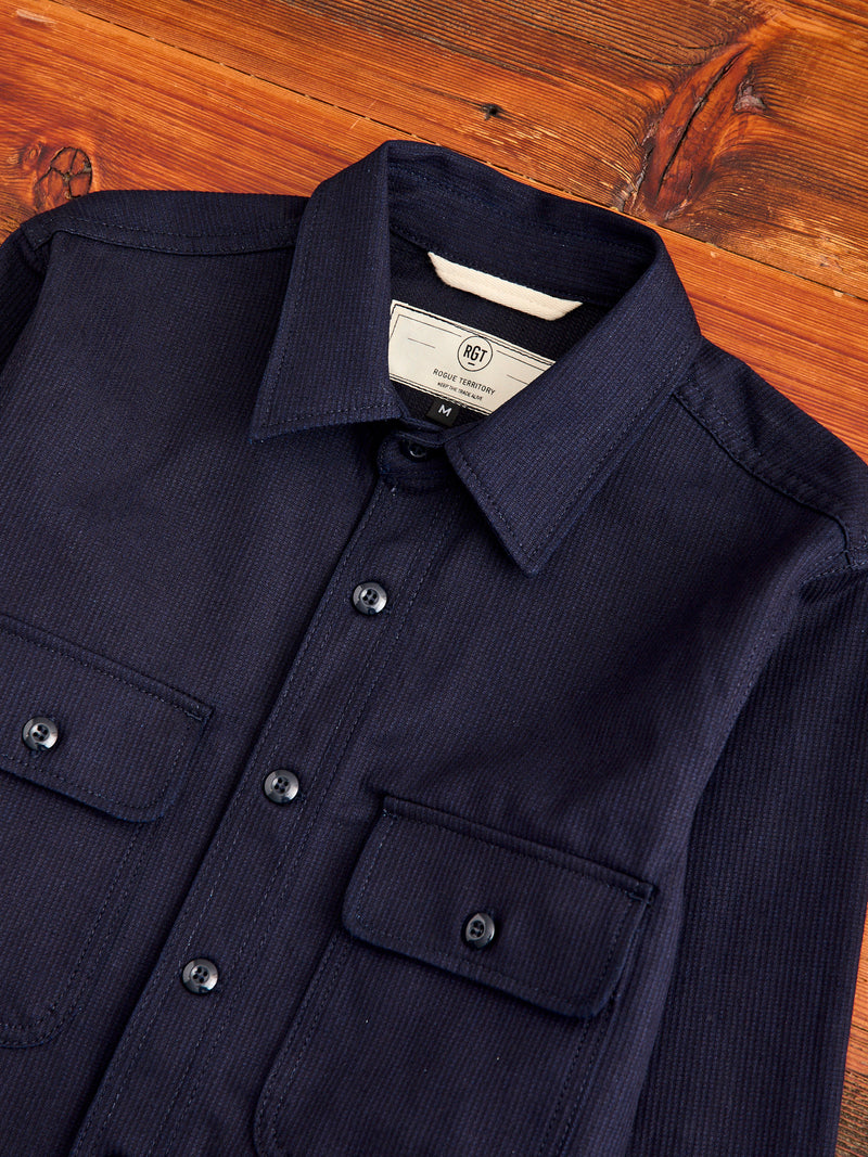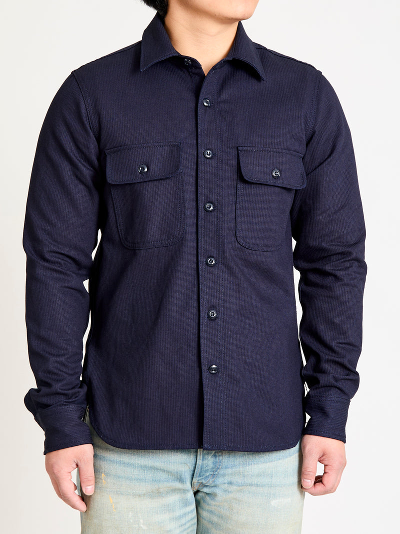 • Inspired by classic work shirts, Rogue Territory's Field Shirt is an easy-to-wear rugged style. This installment is made using a 8oz Japanese indigo whipcord fabric, woven with an an ample surface texture. The shirt is designed in a classic work shirt silhouette with two pockets at the chest and double needle chain-stitch runoff at the vents.