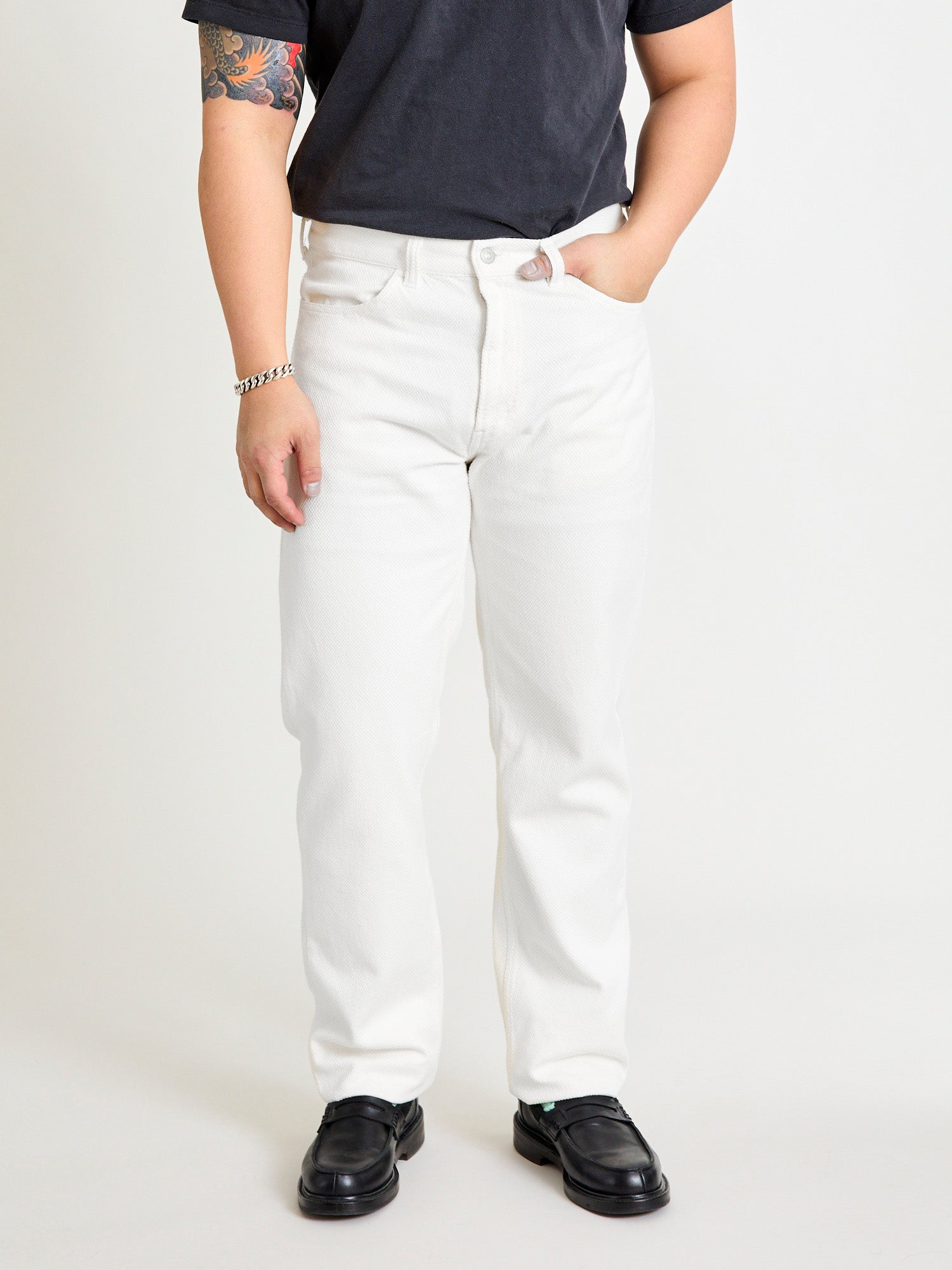 • Finished in a bone white natural color, these trousers from Blue Blue Japan comes sewn using the brand's Fine Sashiko fabric in a relaxed tapered silhouette. Blue Blue Japan's Fine Sashiko fabric sports a medium weight and tight weave similar to denim. The pants are fitted with classic 5-pocket details, welt pockets at the rear, and a Japanese YKK zipper fly.
