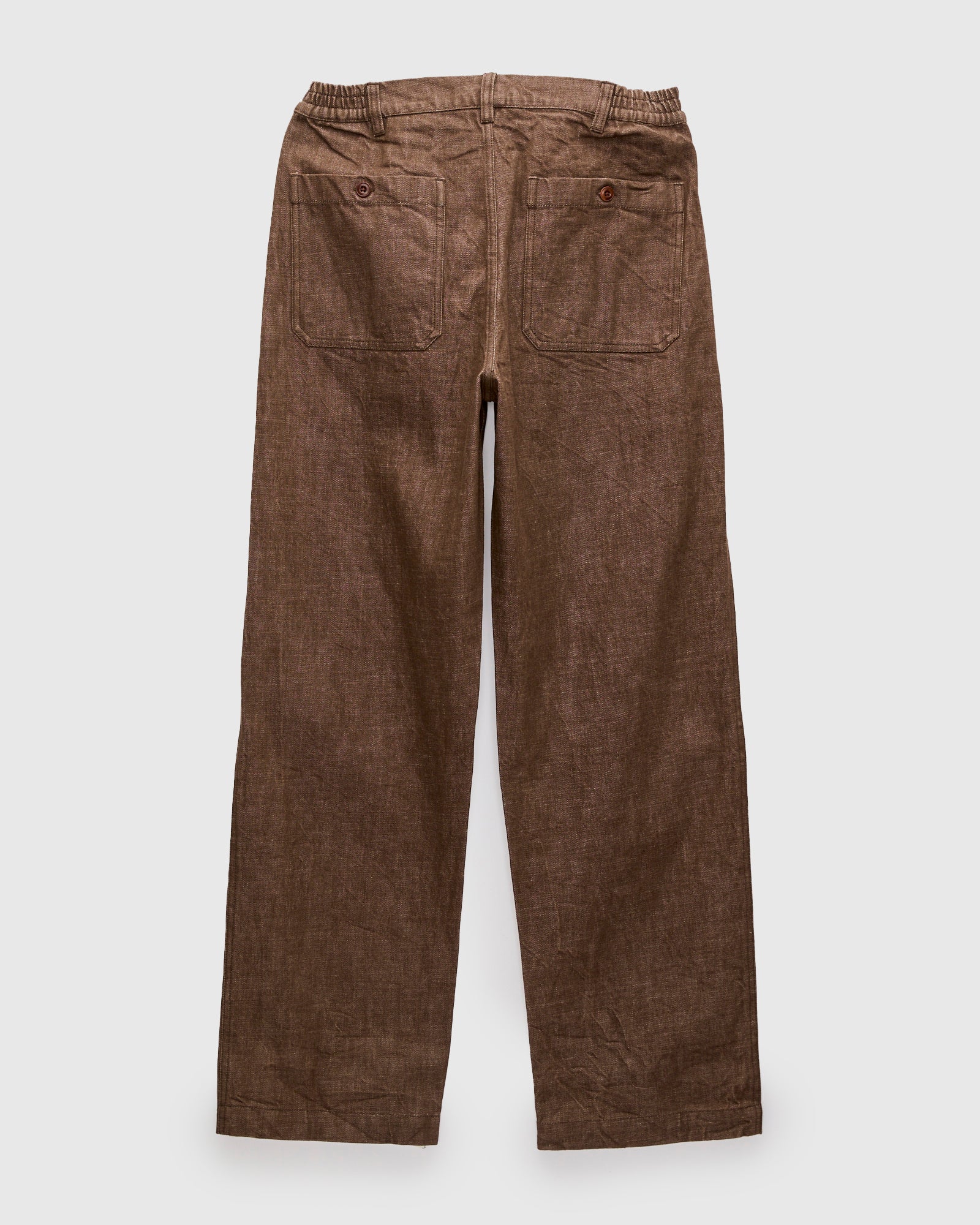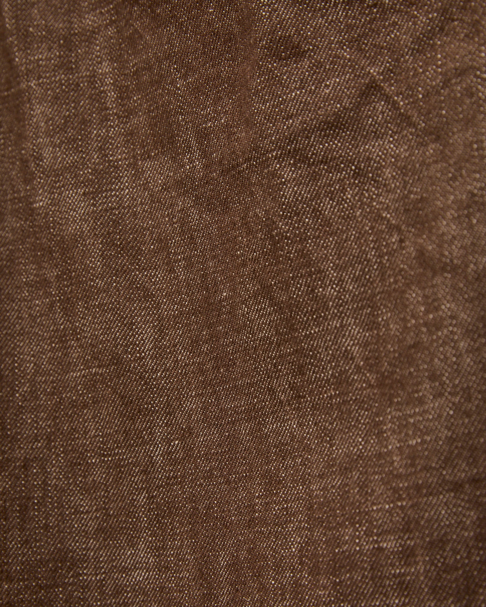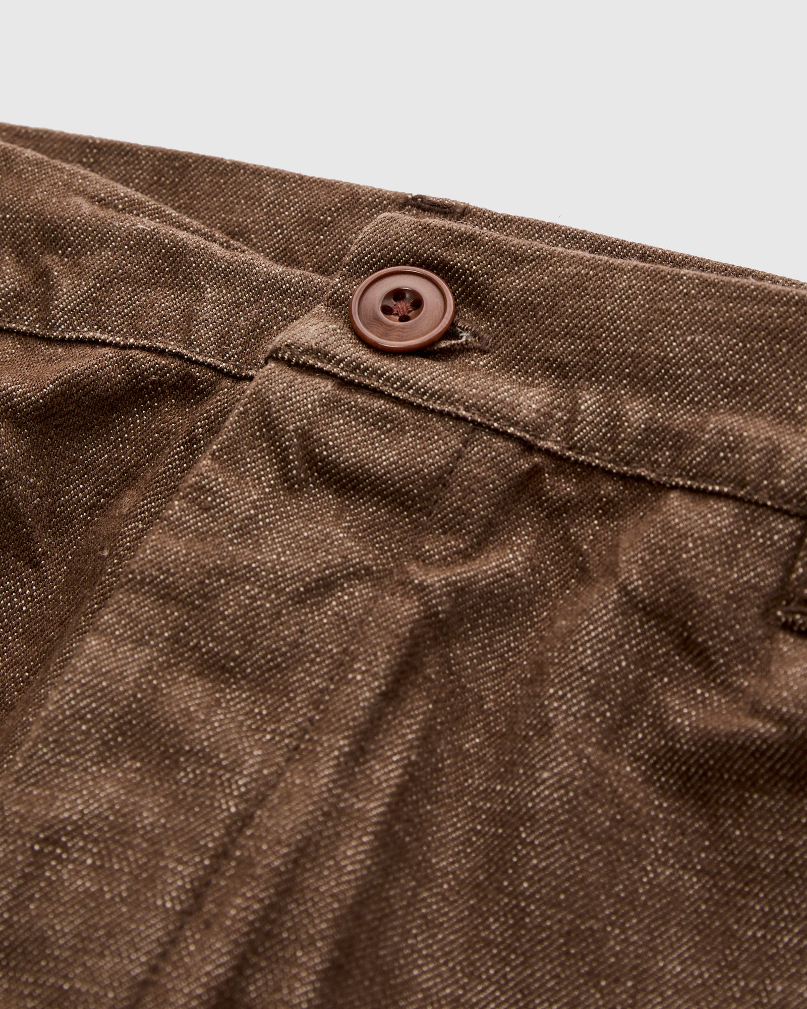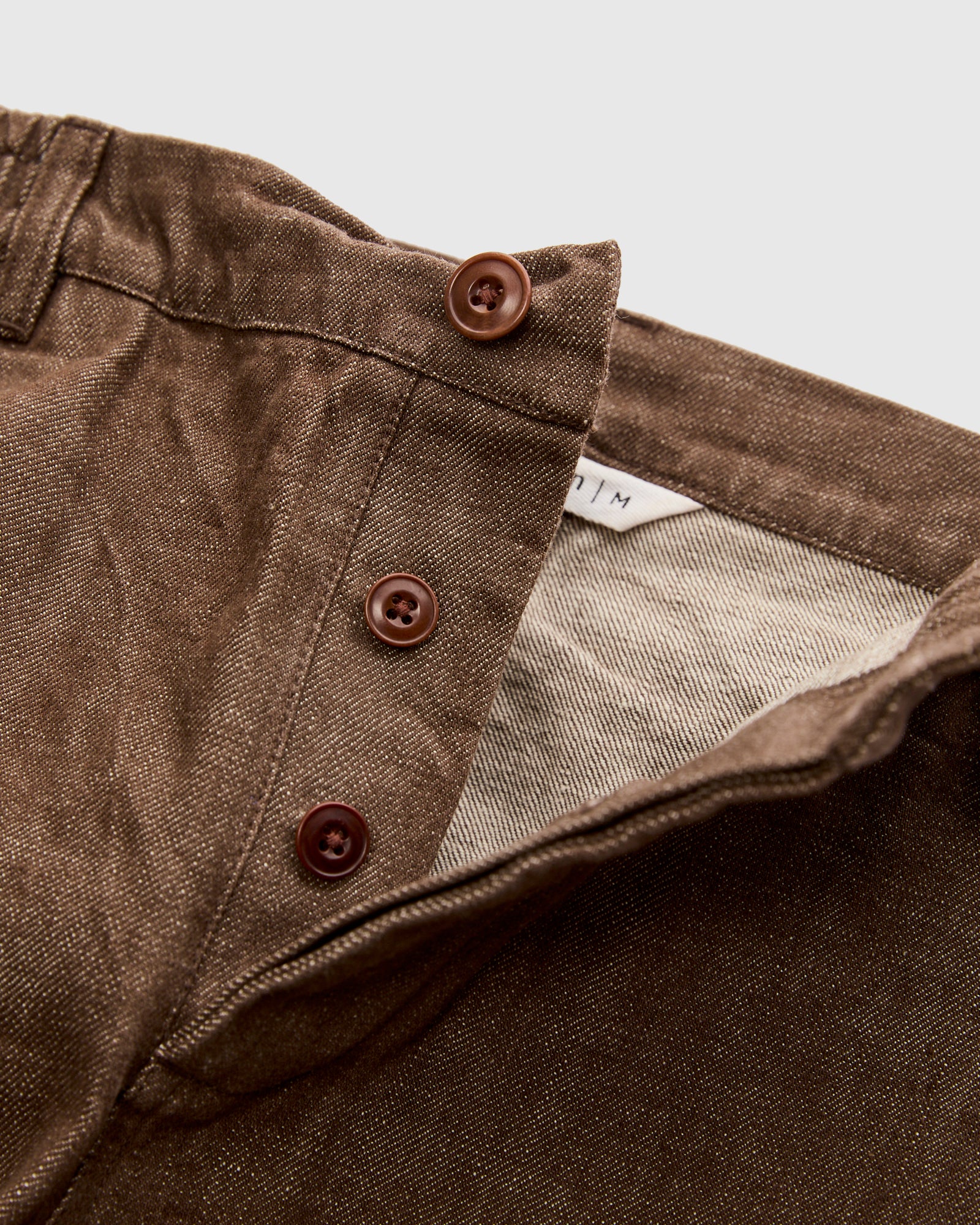• The Harvest Pant from 3sixteen references mid-century French work pants with a utilitarian straight leg cut. This installment is cut from a midweight brown denim from Japan that displays a subtle nep texture and structured drape. The Harvest Pant is finished with a rinse to remove shrinkage and comes equipped with on-seam side pockets, large rear patch pockets, and elastic side adjustors at the waist.