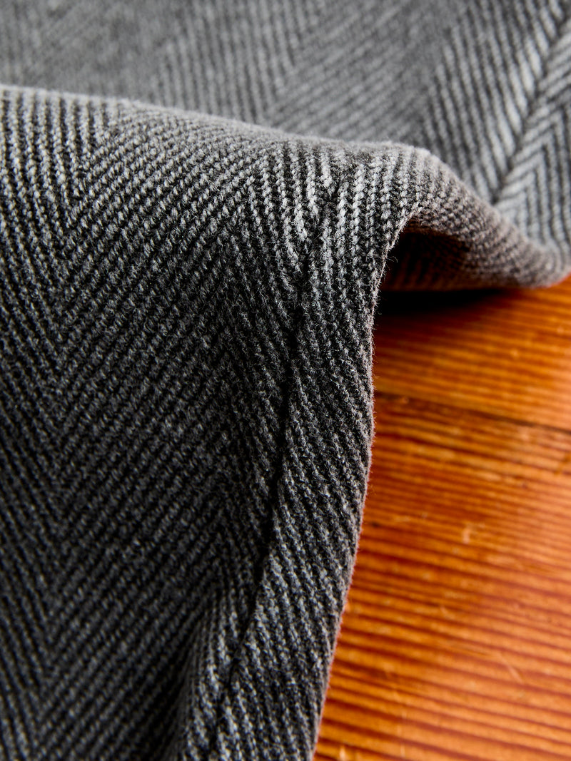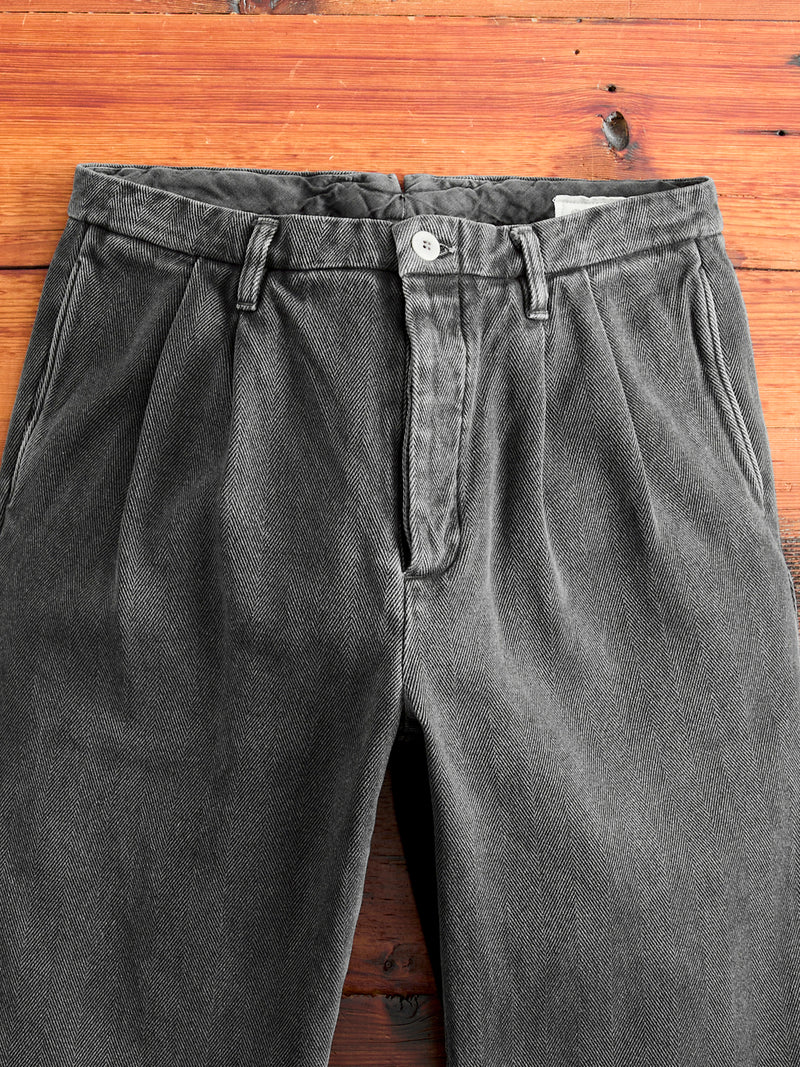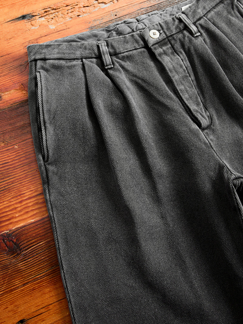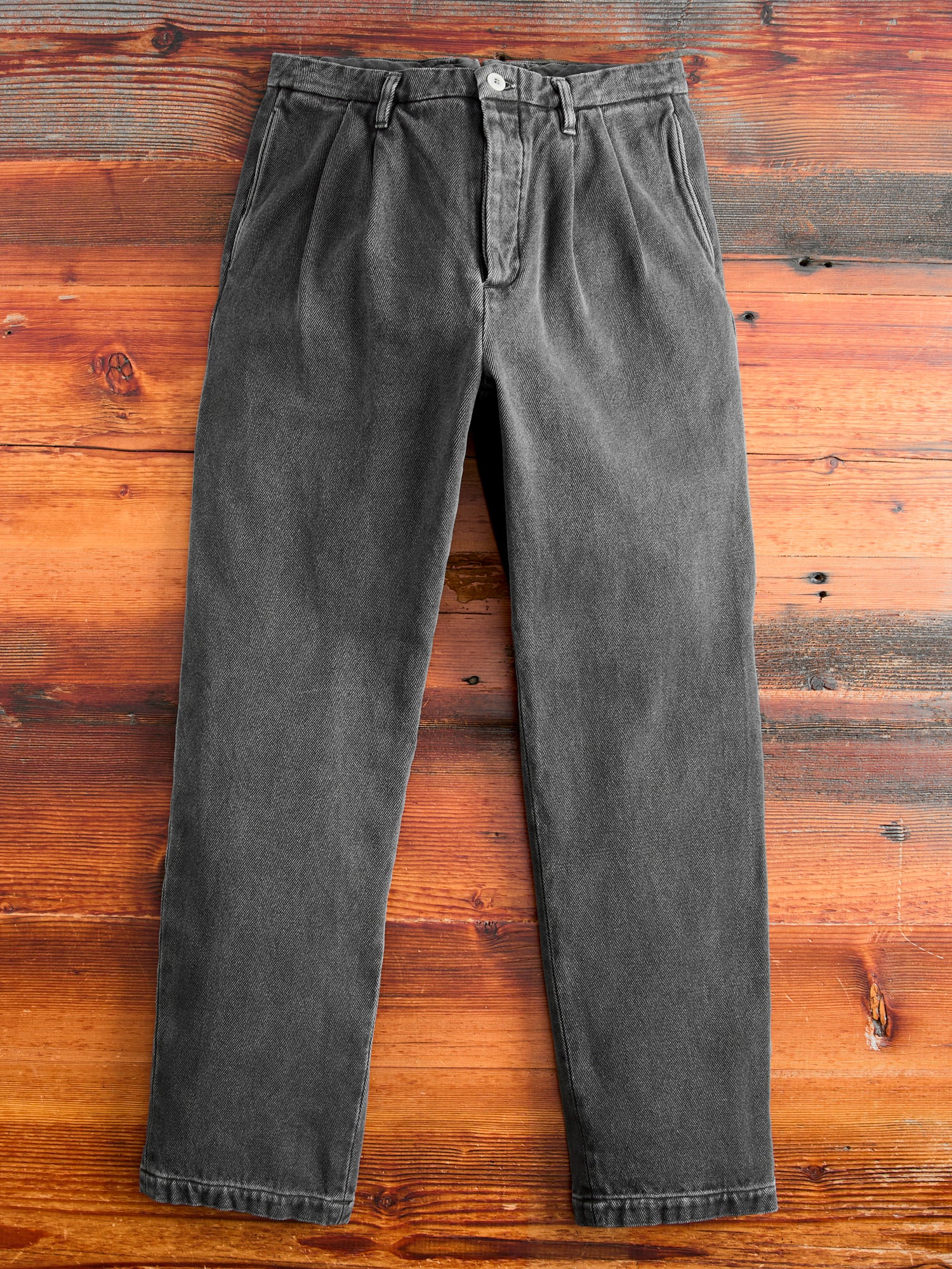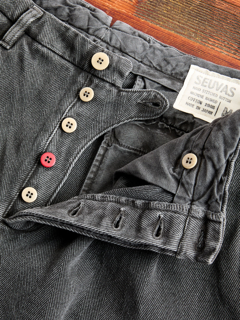 • Dyed with Japanese Binchotan charcoal and black sulfide dye, SEUVAS gives their Double Pleated 2Tuck Pants a garment-dye treatment for a deep hue that evolves over time. Made from heavyweight herringbone twill, these pants reinterpret the classic suit trouser for everyday use. They feature a straight-leg cut and traditional trouser detailing, including slant waist pockets, rear welt pockets, and a waistband liner. Binchotan charcoal, derived from white oak branches and traditionally used in Japanese cooking, adds depth to the dye, allowing the fabric's color to transform beautifully with wear.
