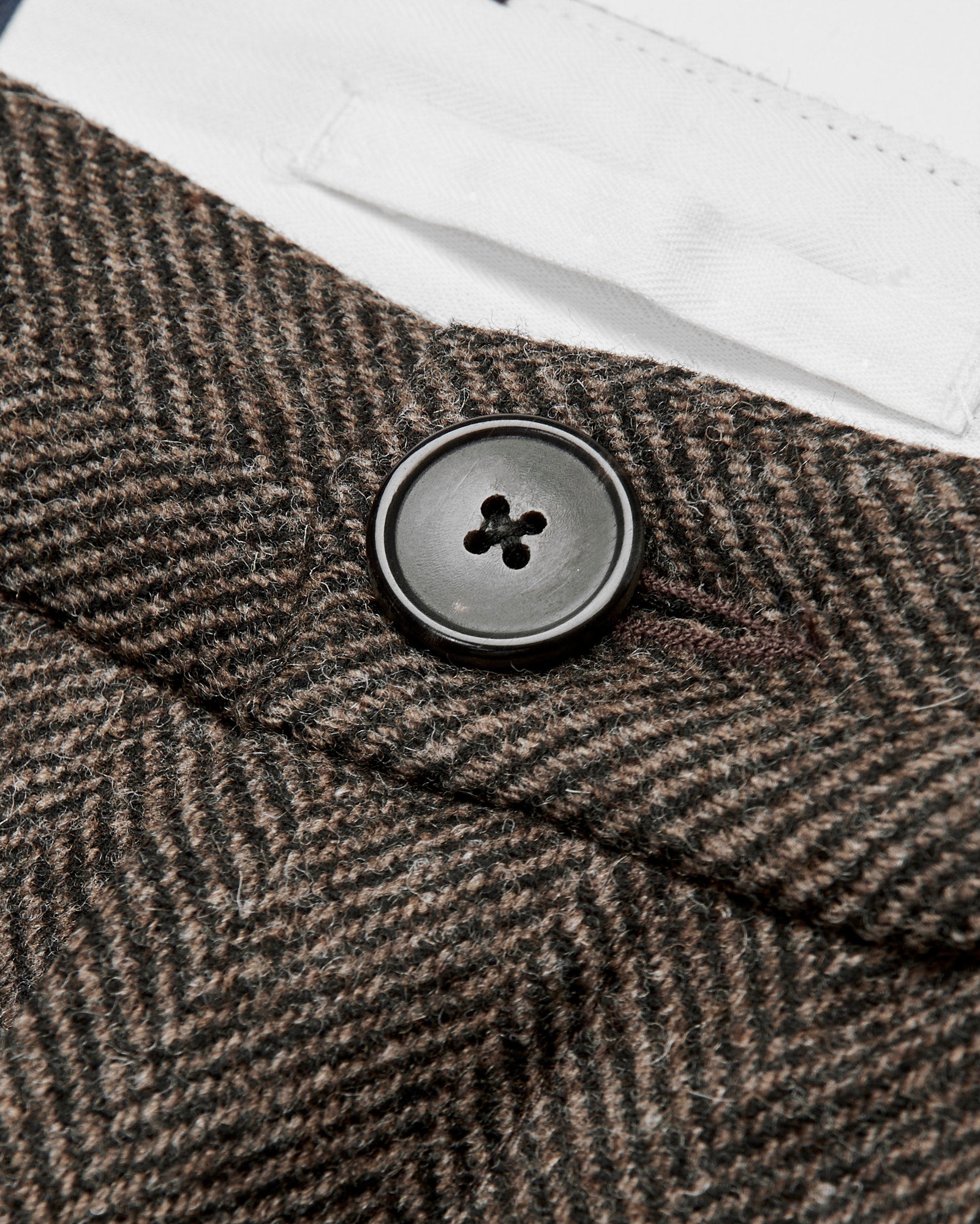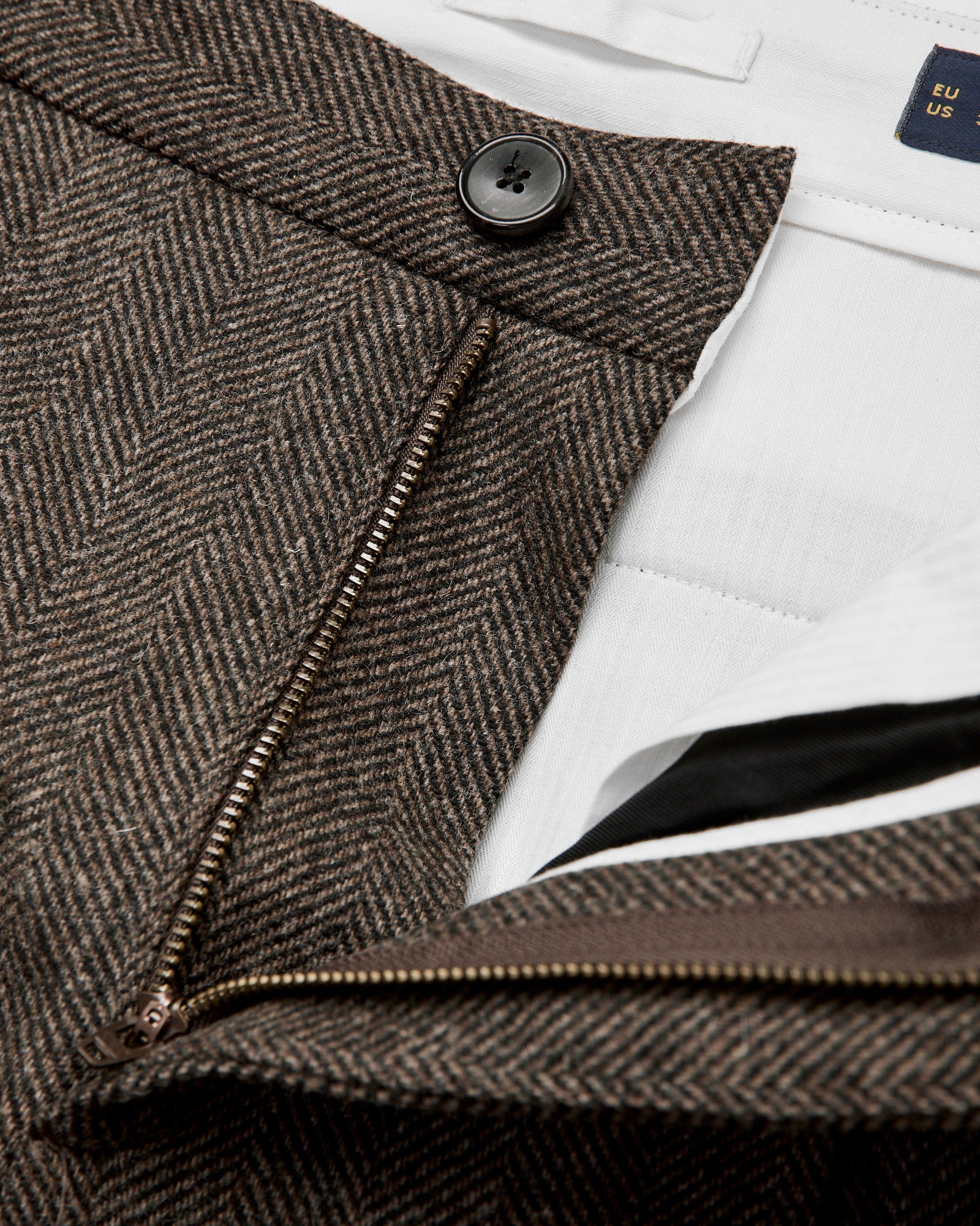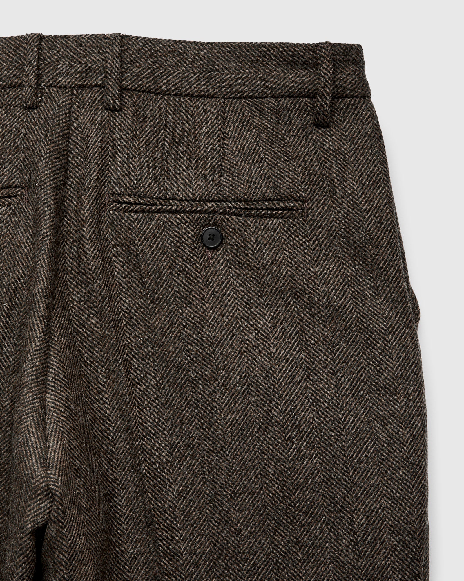 • These trousers from Portuguese Flannel are crafted using a medium weight herringbone twill wool fabric. The trousers are cut in an easy-to-wear tapered fit with a mid rise and tailored pleating at the front. Finished with a zipper fly, lined waistband, and an assortment of traditional trouser pockets.