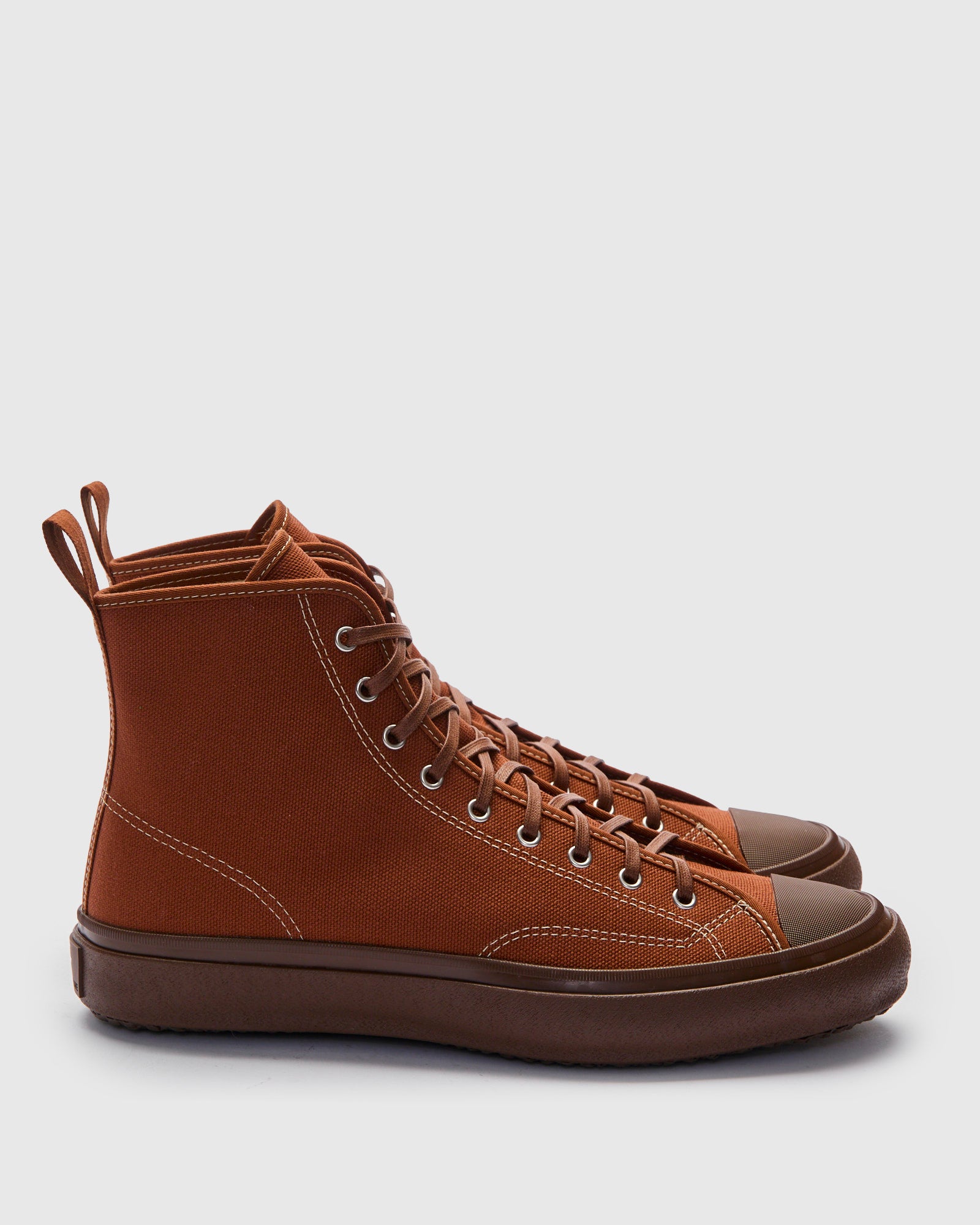 • The Hi Basket Sneaker from Moonstar draws inspiration from 1950s basketball trainers.The shoes are designed with a pull tab at the back and high-top cut designed to support the ankle for sharp cuts and lateral movement. Crafted in Japan, these sneakers feature a sturdy heavyweight canvas upper and are equipped with vulcanized rubber soles. The shoes are meticulously crafted using the traditional "Ka-ryu" technique, where the outsoles are fired in a kiln at 240°F, ensuring increased strength and durability, making them resilient even after extended wear.