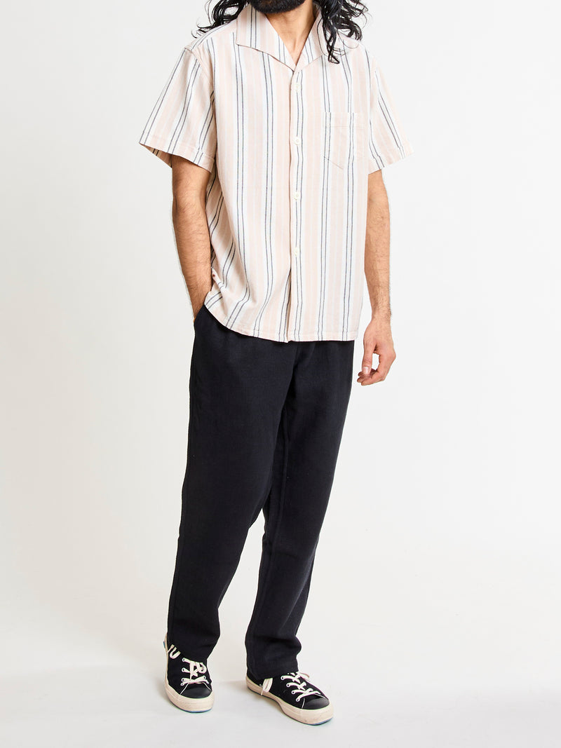 • Pherrow's Italian collar shirts are cut with a wider open neck and feature lightweight fabrics ideal for Summer styling. This iteration features a contrasting white stripe cotton cotton fabric woven with a loose weave. The shirt is finished with a single chest pocket, mother of pearl buttons, and comes cut in a regular fit.