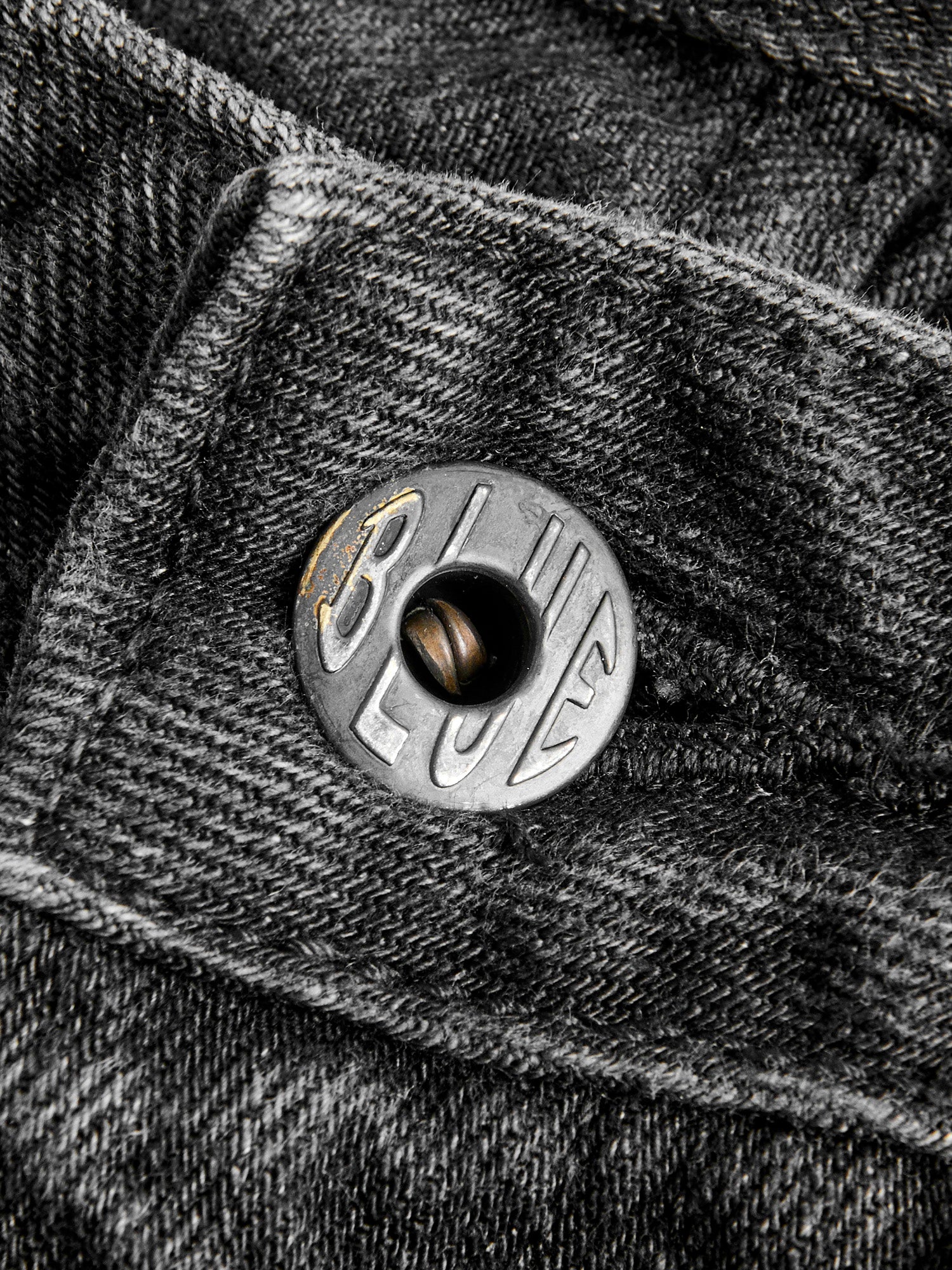 • Crafted using short-staple American cotton, Japan Blue's Black Circle denim fabric is modeled after vintage fabrics dyed a deep sulfur black color. Originally a double black denim, this iteration comes washed and distressed to replicate the look and feel of a pair of well worn denim. American short staple cotton gives the fabric a light slub texture with added tensile strength, allowing for a quicker and higher contrasting fade patterns. Woven on vintage shuttle looms, Japan Blue's Circle line is their reimagining of easy to wear classics designed for everyday wear. Equipped with a custom branded leather patch and signature Japan Blue details.