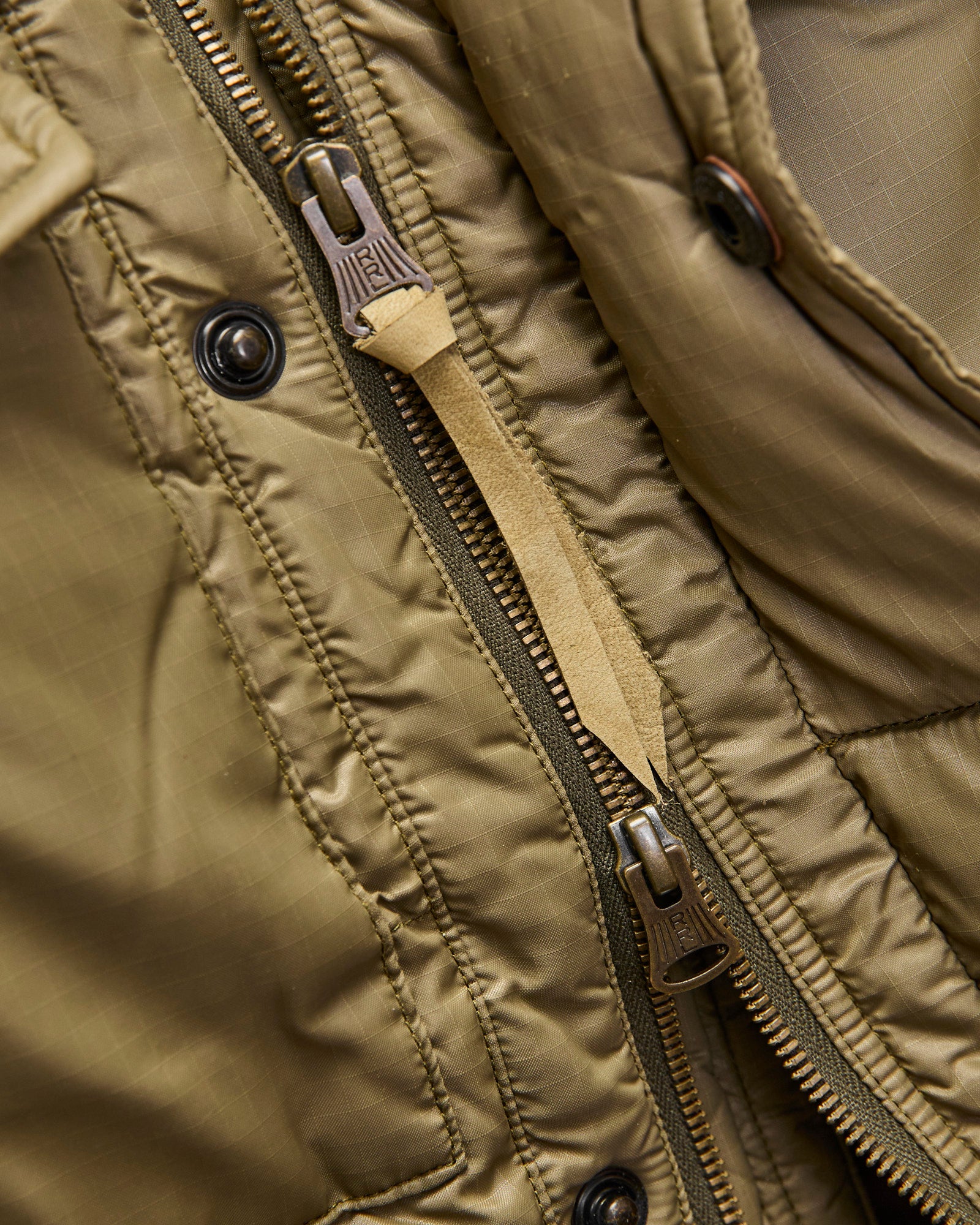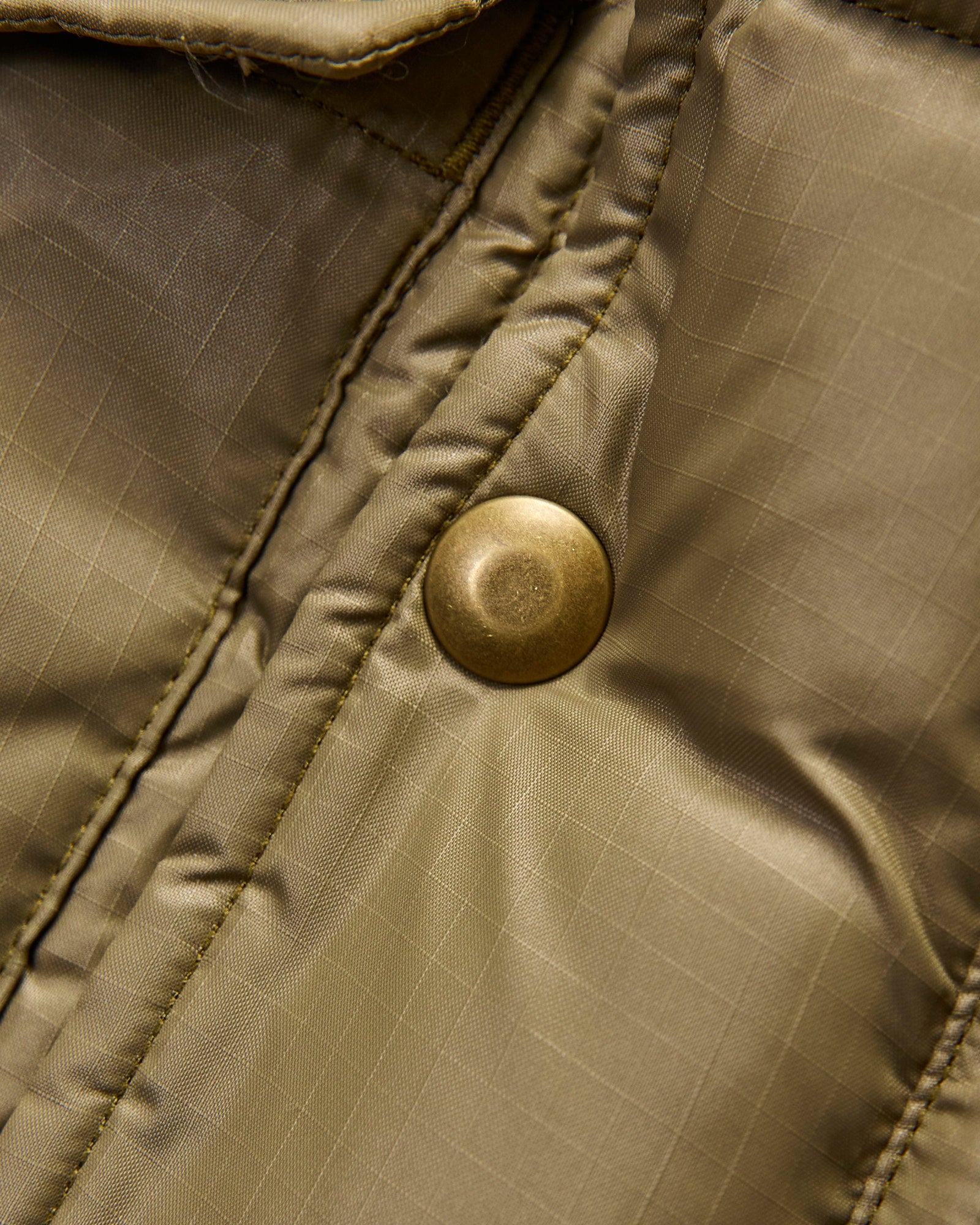 • The Jacobsen Down Vest from RRL features a soft cowhide leather yoke paired with a pigment-coated nylon shell. Insulated with recycled down-alternative and cut with a funnel neck for added warmth, the vest is equipped with flap chest pockets, dual waist pockets, and vintage-style brass snap buttons.