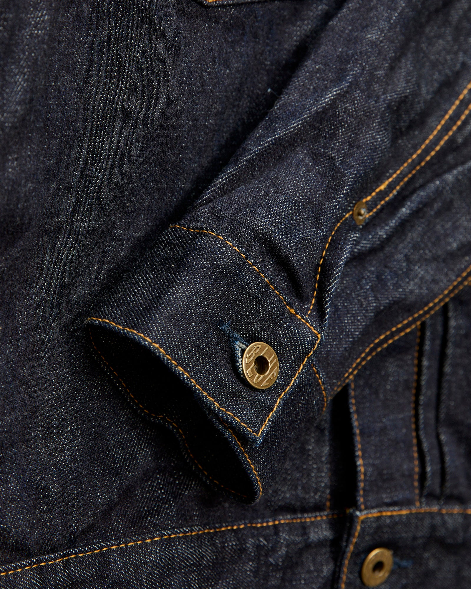 • The JBGJ1000 is a Type-II jacket crafted using Japan Blue's 14.8oz Texas cotton selvedge denim. Texan short staple cotton gives the fabric a light slub texture with added tensile strength. The jacket has been rinsed to reduce shrinkage and enhance the fabrics surface texture. Cut in a modified-type II design, fitted with on seam waist pockets, and two large chest pockets.