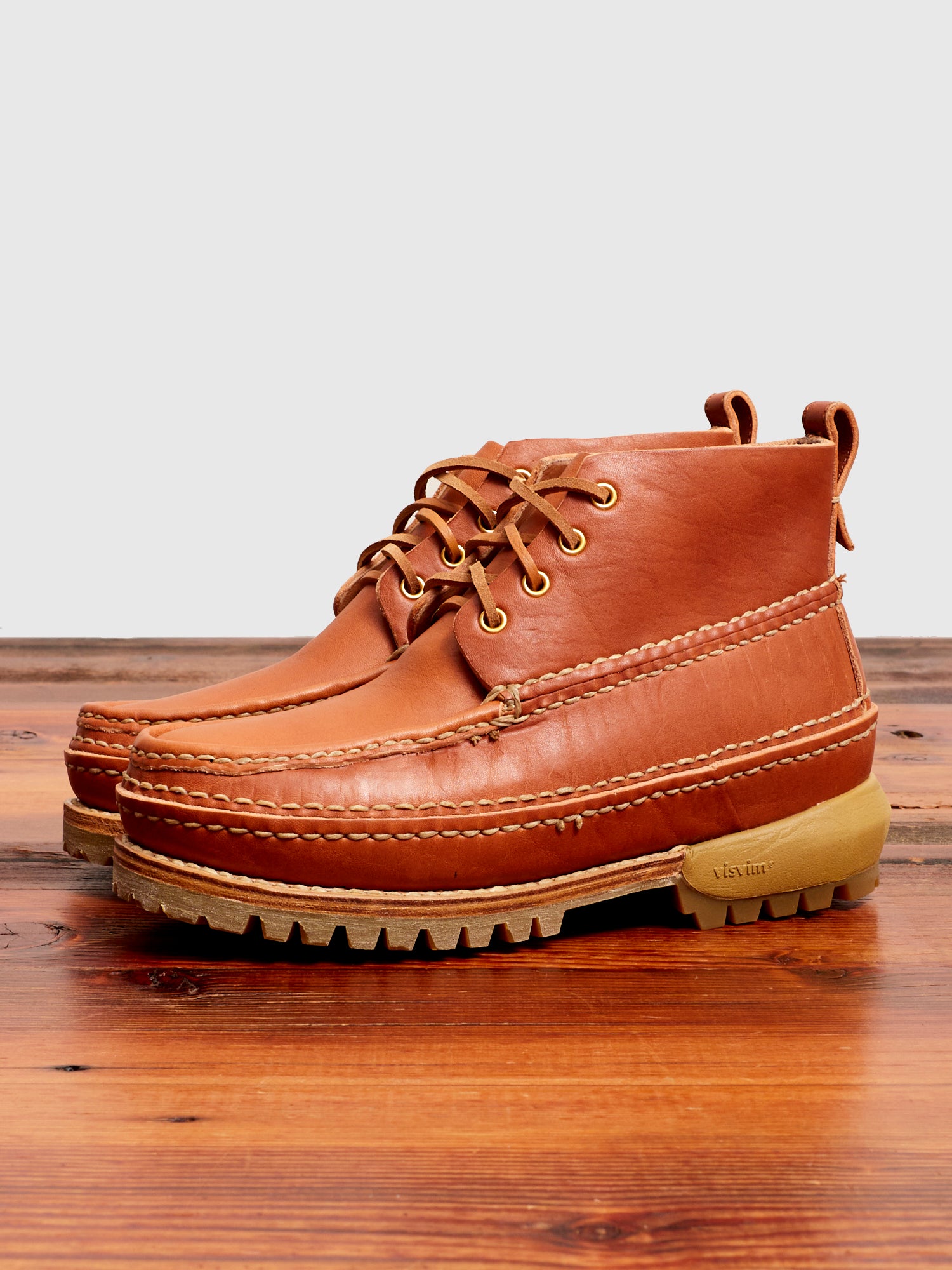 • The Kanawa Moc Mid-Folk from visvim reinterprets the familiar moccasin boot in an inventive style combining modern and old-world construction. Handsewn, the uppers feature a vegetable tanned Horween cow leather with a smooth surface texture and heavy grain. visvim outfits the Moc Toe with a phylon heel counter and vibram commando outsole made exclusively for visvim.  The shoe features a natural cork footbed designed to mold to the wearer's specification over time, complete with an array of accents that will patina with continued wear.
