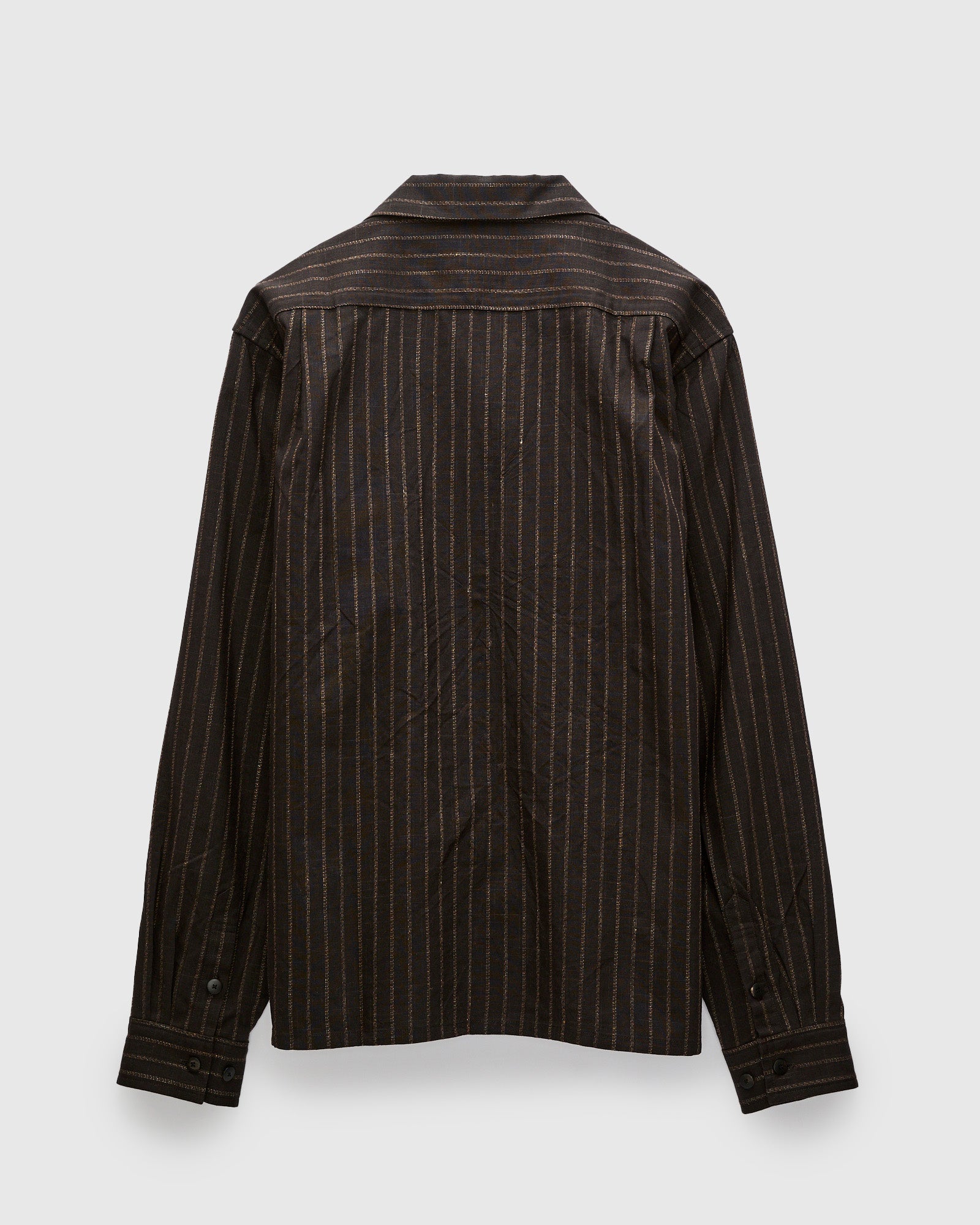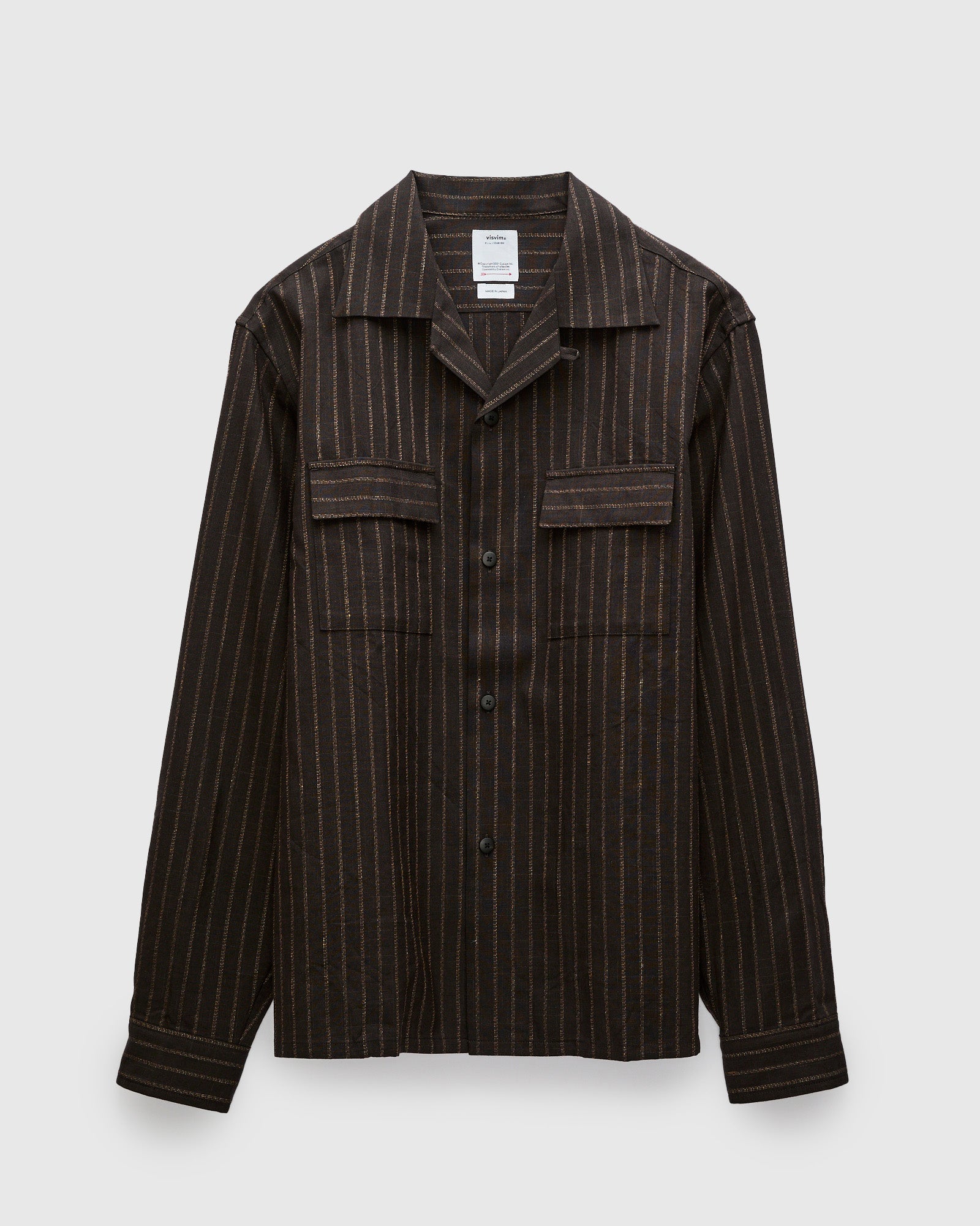 • The Keesey shirt is visvim's open collar long sleeve shirt crafted using a sleek wool-linen kasuri fabric. Woven with uneven stripes, the shirt features a traditional kasuri sashiko pattern and has undergone a factory rinse process to remove shrinkage and add texture. Cut in a roomy-relaxed fit the shirt is sewn with an open collar placket, dual chest pockets, and water buffalo buttons throughout.