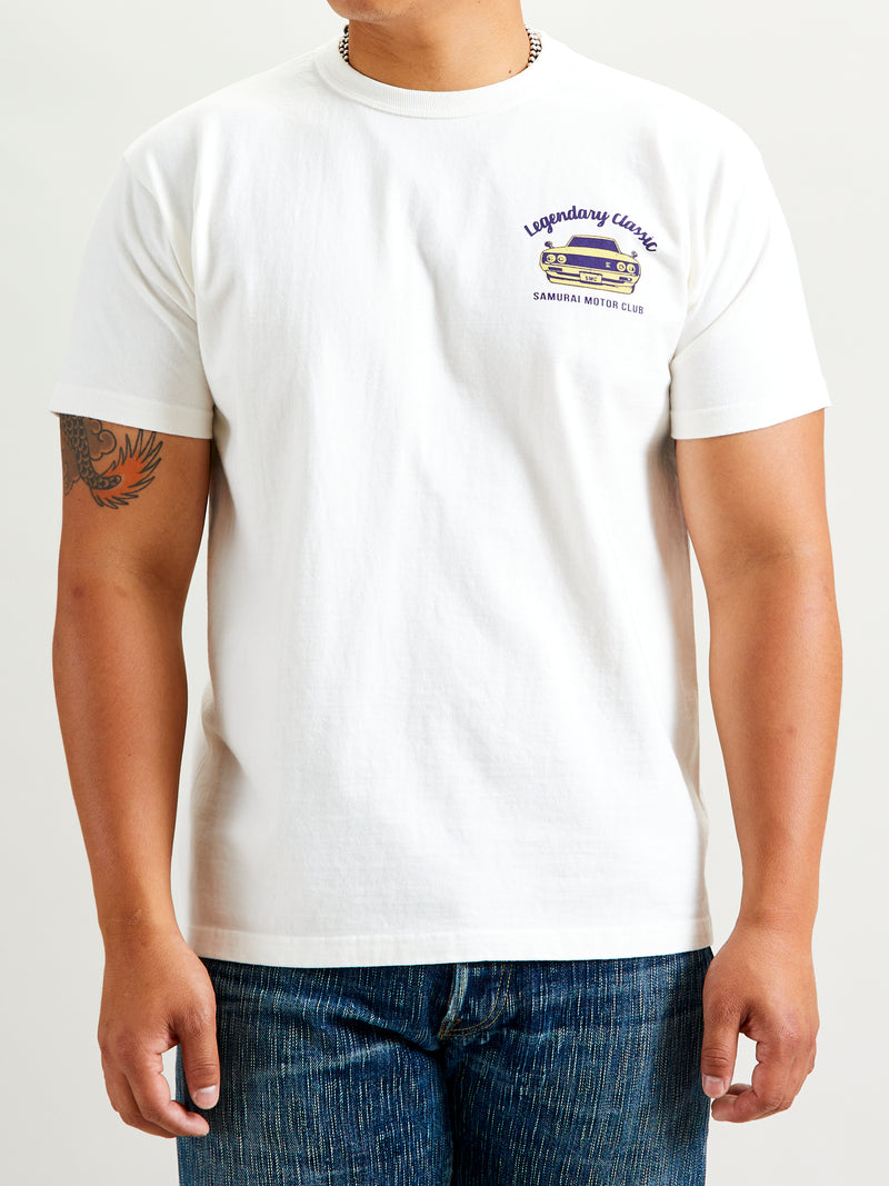 This shirt features a late model Nissan "Kenmeri" Skyline GTX, a rare sport coupe produced only for the Japanese market. Dubbed "Kenmeri" the Skyline received it's fun alias from a popular 70's advertisement featuring a young couple (Ken and Mary) enjoying the Hokkaido countryside in the Skyline. This was the last production of the old body GT-R, until the release of the R32 in 1989. Cut in Samurai's new OVS fit, which increases the chest size and length for the overseas market.