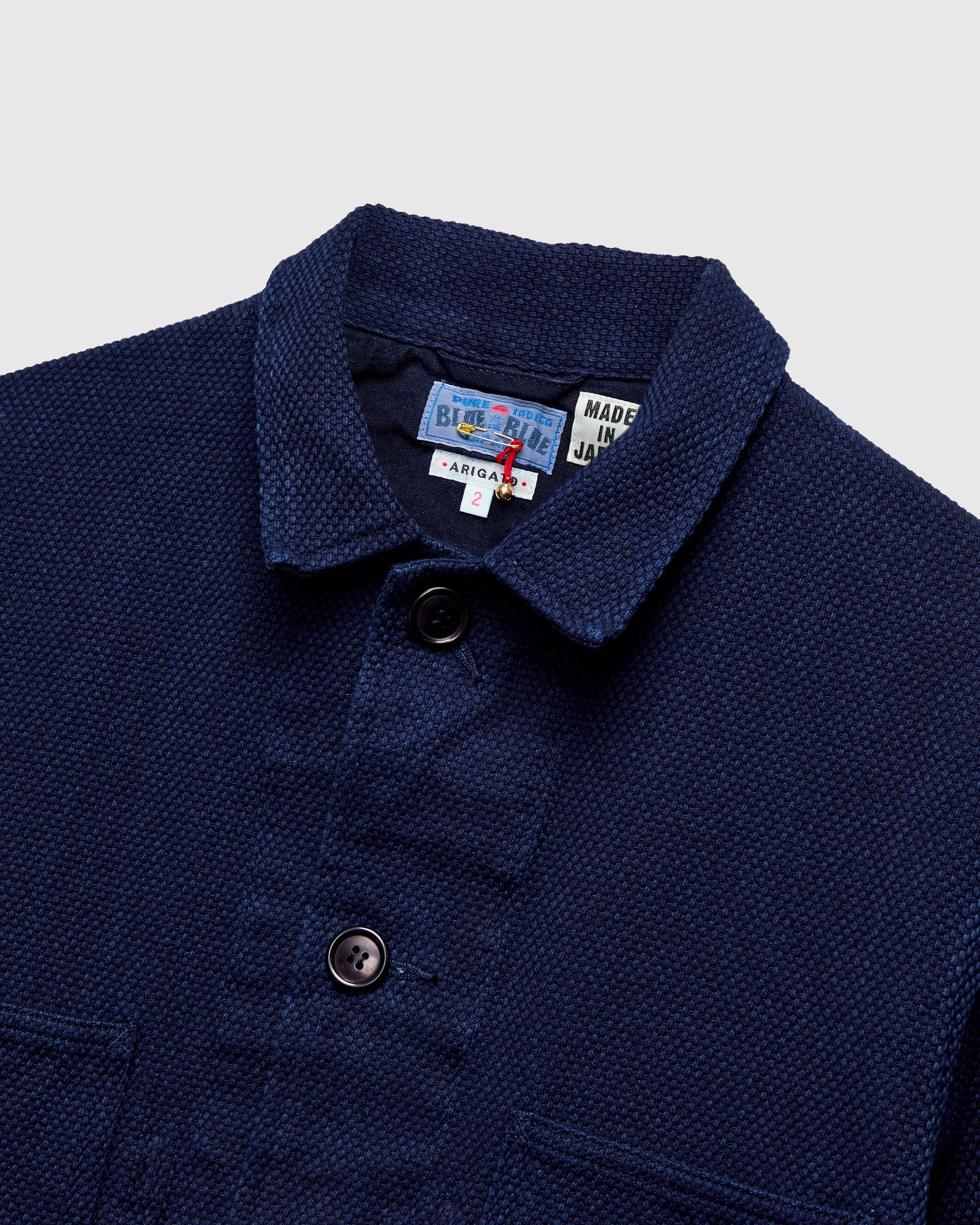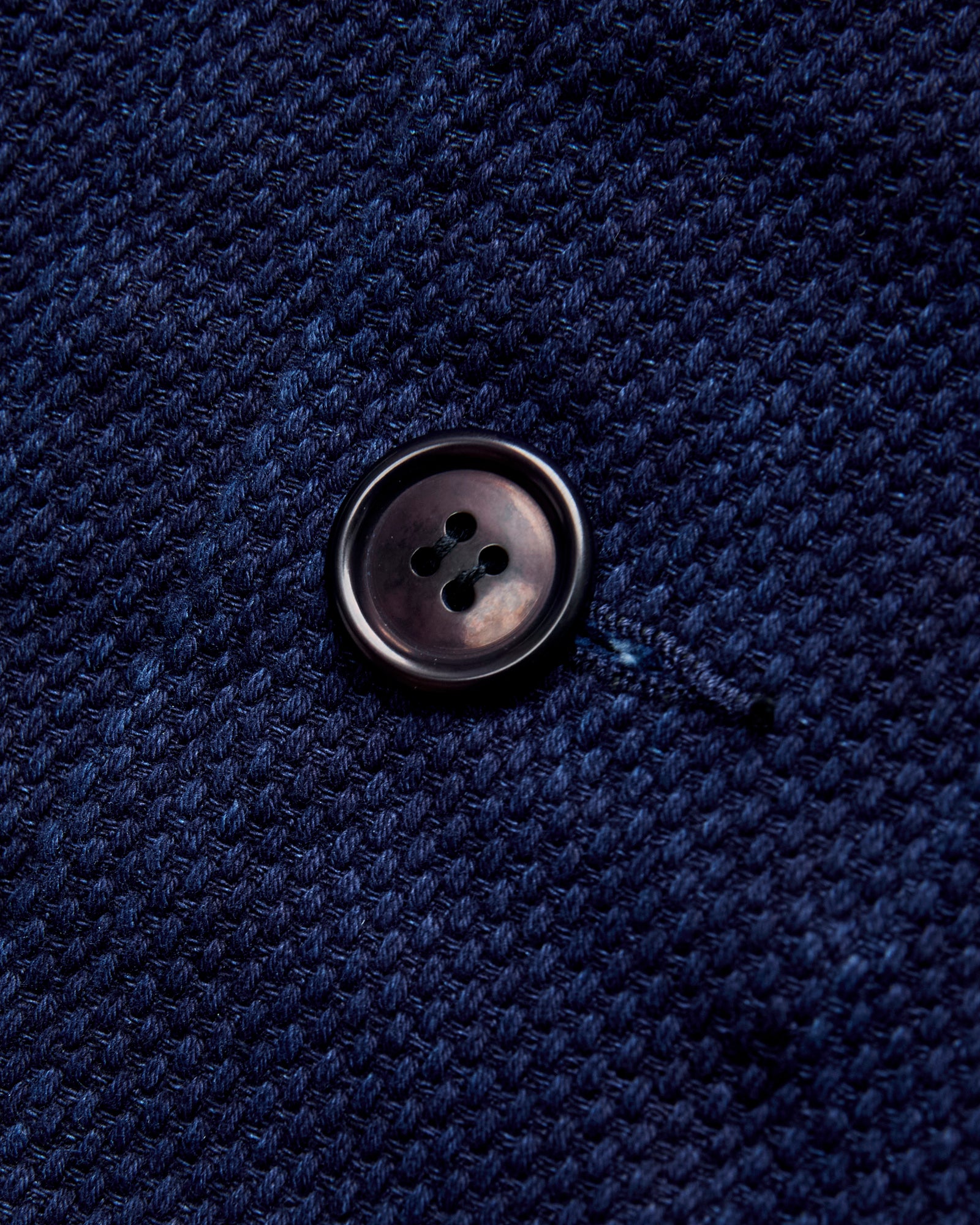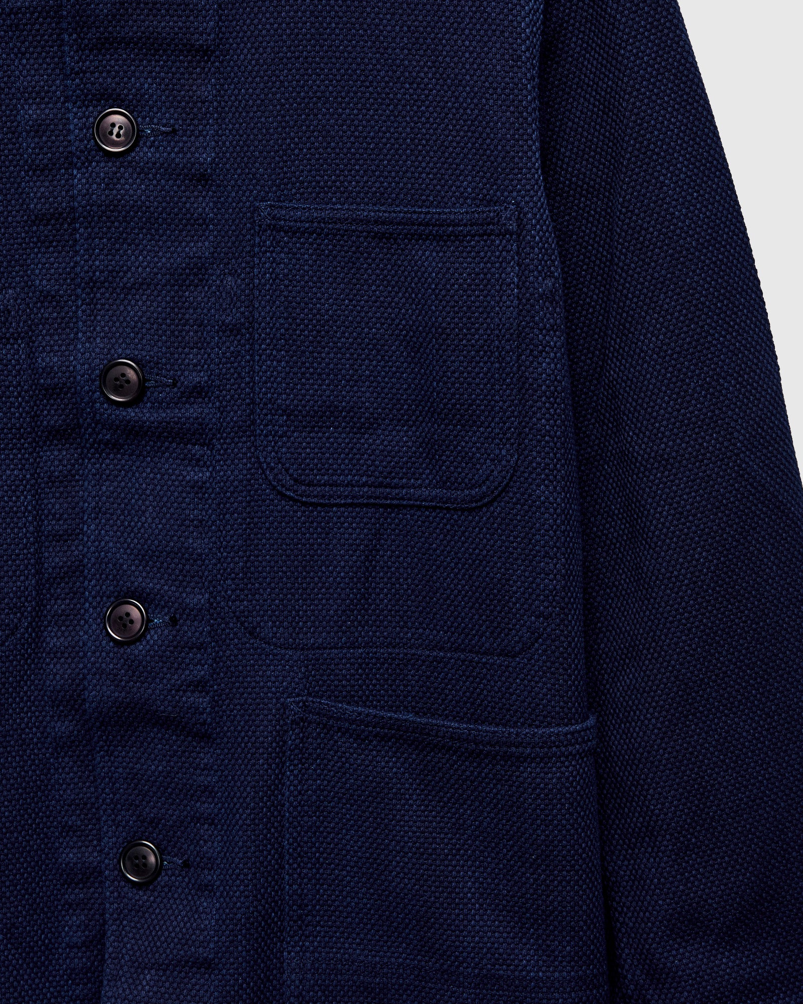 • The Sashiko Coverall Jacket by Blue Blue Japan showcases the brand's three-decade mastery of indigo craftsmanship. Blue Blue Japan's lightweight sashiko fabric, is a lightweight version of the brands signature sashiko fabric. This timeless piece boasts a versatile multi-pocket layout, tonal buttons, and a cotton-lined placket. Dyed with natural indigo, the jacket's unique character will evolve and mature over time, gradually fading into an antique blue shade reminiscent of traditional Japanese denim.