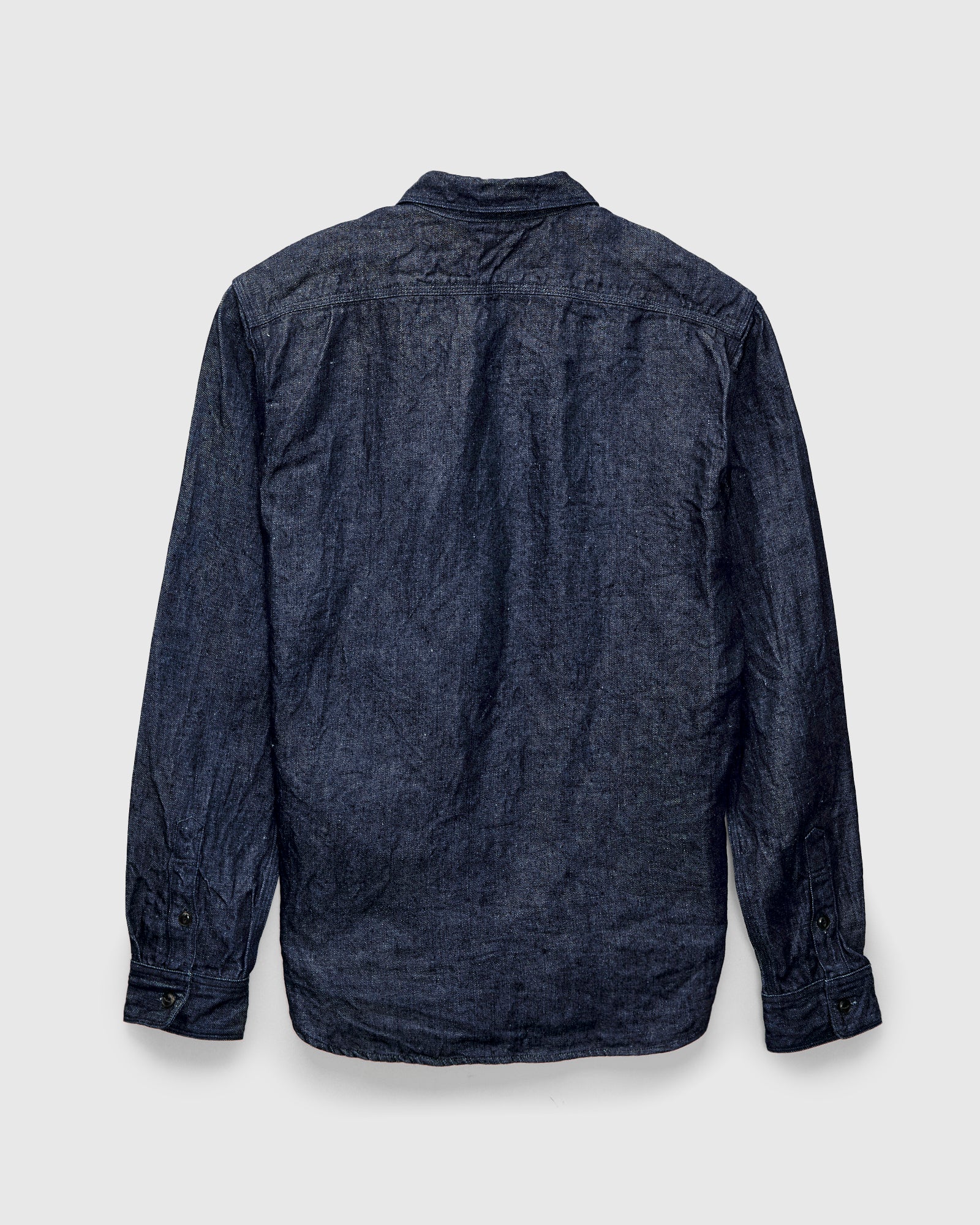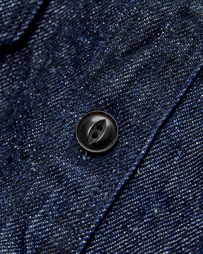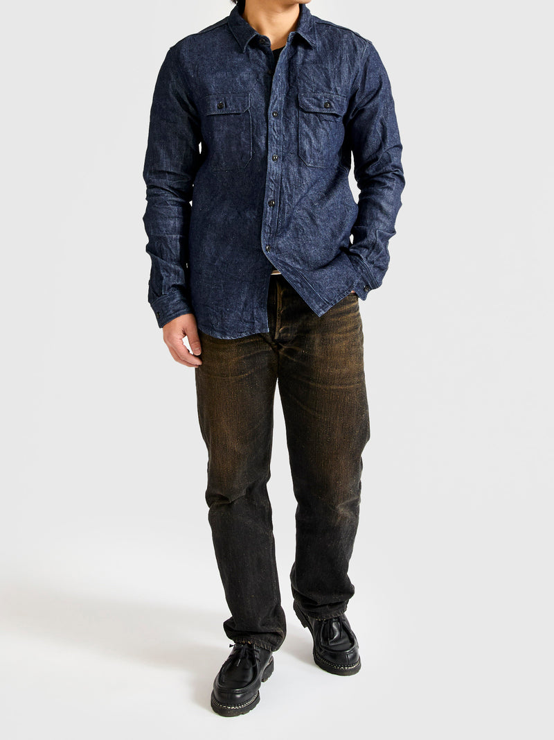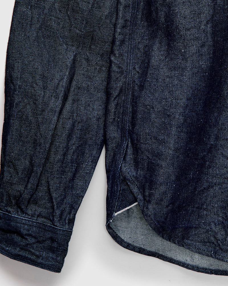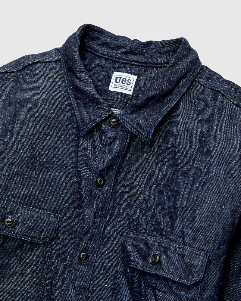 • Made using Japanese linen selvedge denim, UES's Work Shirt features a vintage  silhouette complete with time accurate detailing. Woven on vintage shuttle looms using rope-dyed linen yarn at a medium weight, the fabric features an airy loft and rigid hand feel that will soften and break in with wear. The shirt is finished with black resin buttons, tonal stitching, and selvedge side-seam gussets.