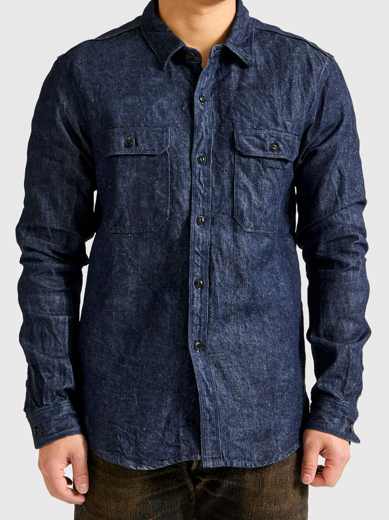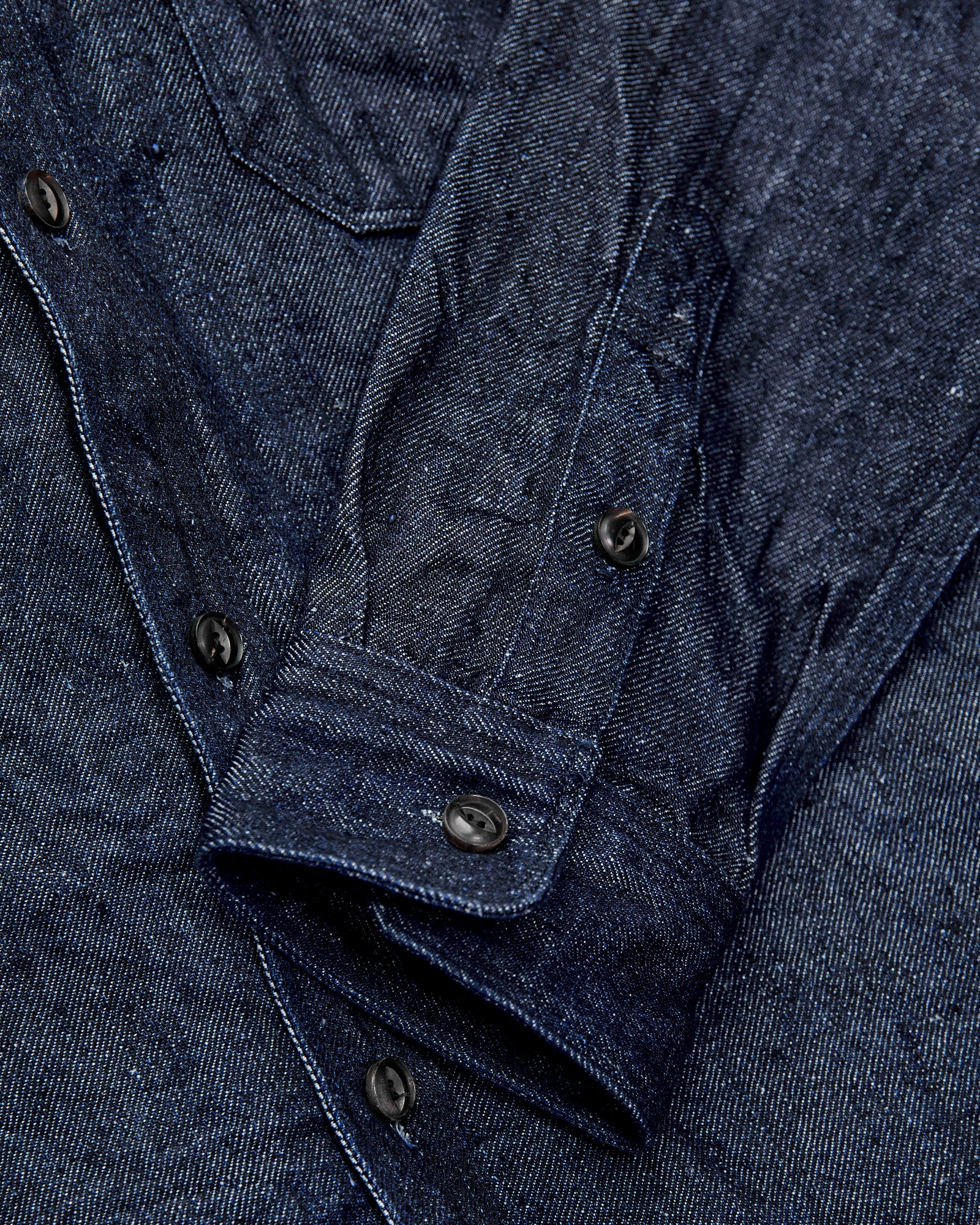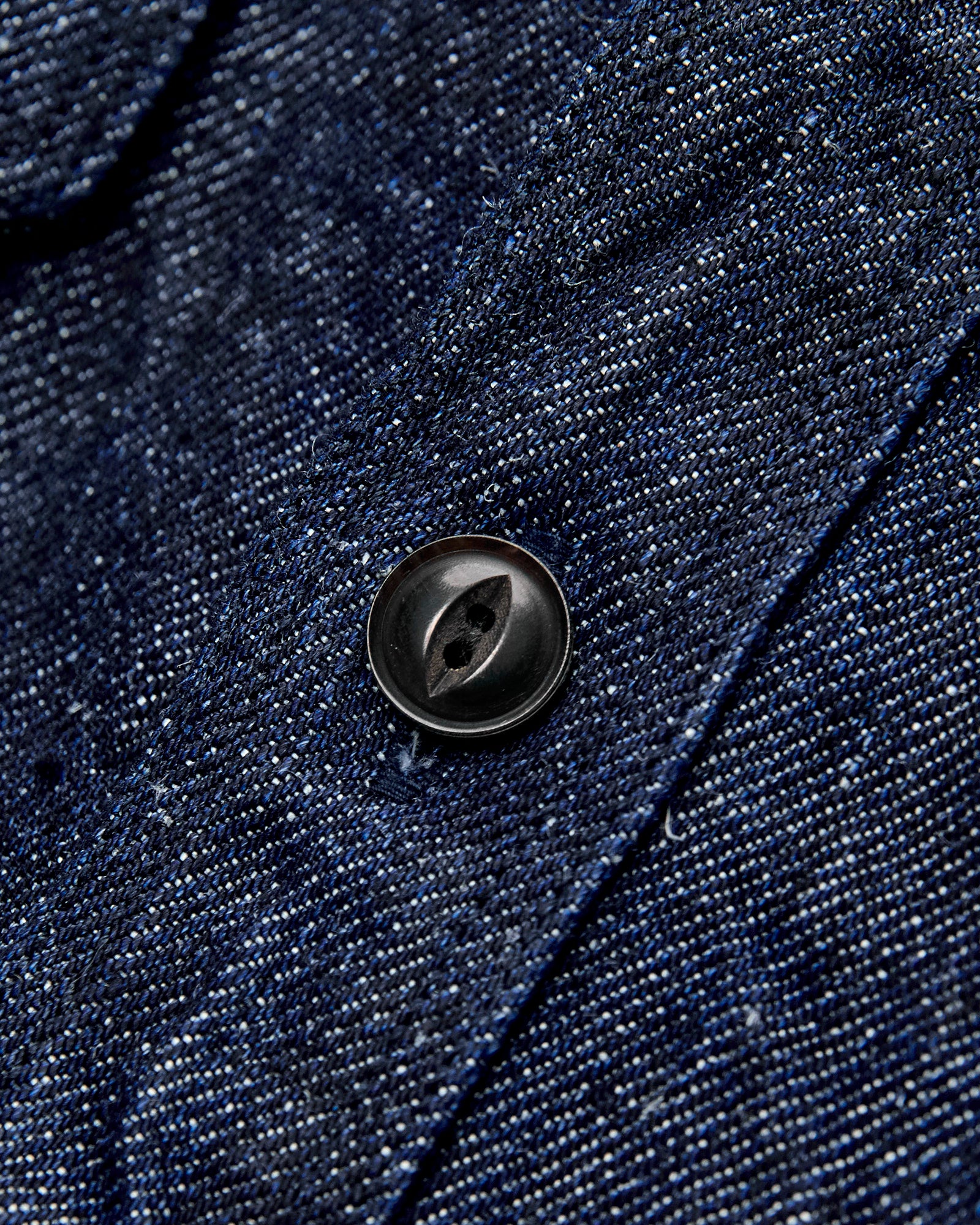 • Made using Japanese linen selvedge denim, UES's Work Shirt features a vintage  silhouette complete with time accurate detailing. Woven on vintage shuttle looms using rope-dyed linen yarn at a medium weight, the fabric features an airy loft and rigid hand feel that will soften and break in with wear. The shirt is finished with black resin buttons, tonal stitching, and selvedge side-seam gussets.