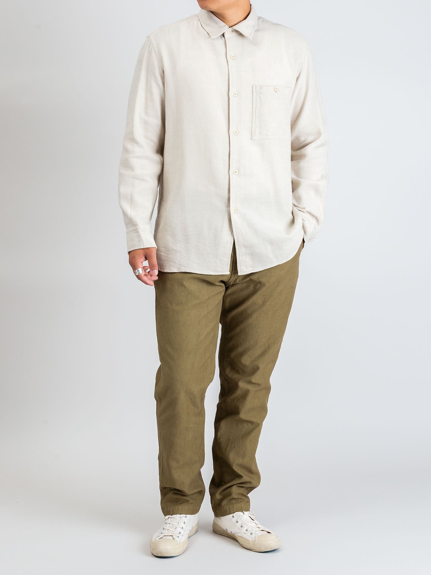 • The Work Shirt from Sage de Cret merges aspects of military uniform with modern tailoring. Constructed using a lightweight tri-blend cotton-linen-wool fabric, the shirt has been washed for a unique look and feel that will continue to age with wear. The shirt features a single utility pocket at the chest, a placket comprised of tonal buttons, and prominent texture throughout. Finished with a curved hem and pointed collar for a versatile design suitable for home or the office.