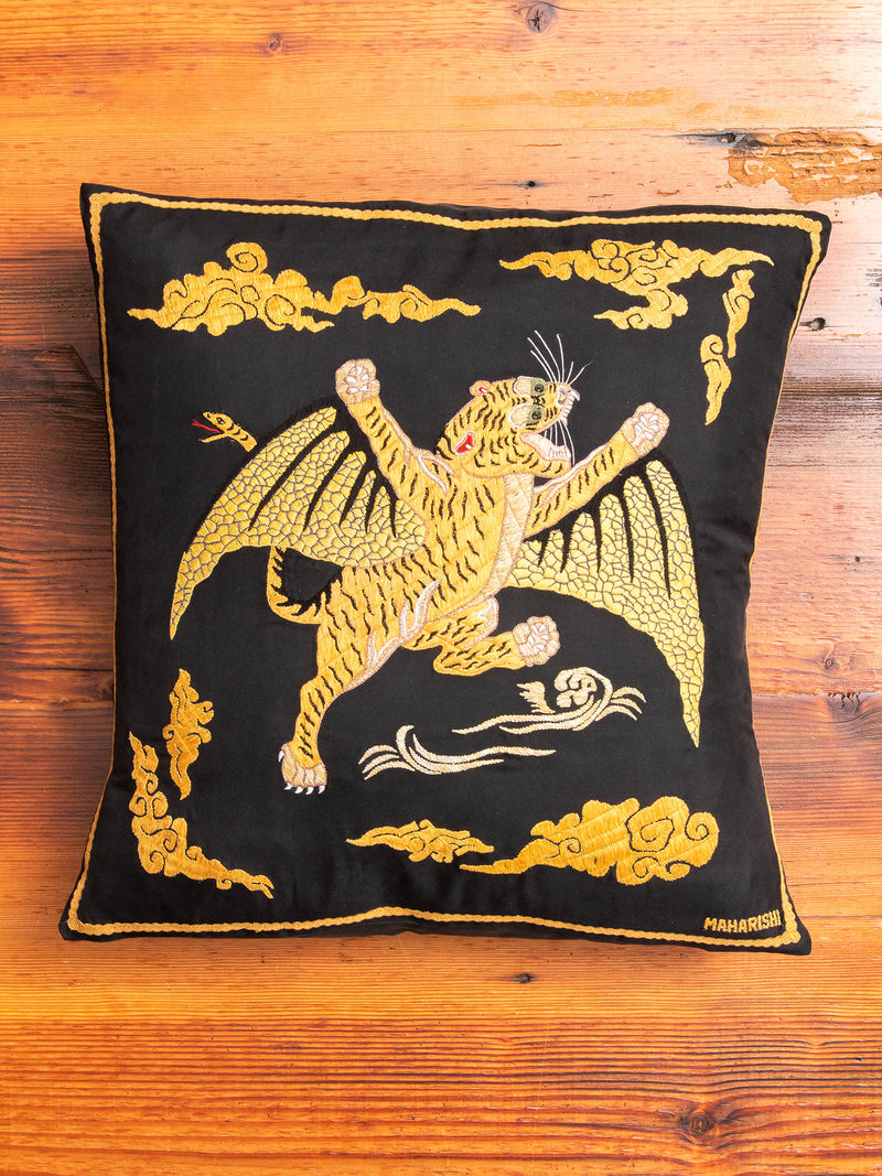 • This luxe cushion cover from maharishi is crafted using genuine silk twill with an embroidered design of the brand's "Wise Tyger" creation. The mythical beast is a cross between two powerful animal archetypes, and blends the metaphorical might of the tiger with the freedom of flight. The design is depicted here in the the style of Mandarin Square embroidery commonly used to signify ranks of officials in imperial China, Korea and Vietnam. The cushion cover comes shipped with a polyester filled pad that will expand to a medium size perfect atop a couch or bed.