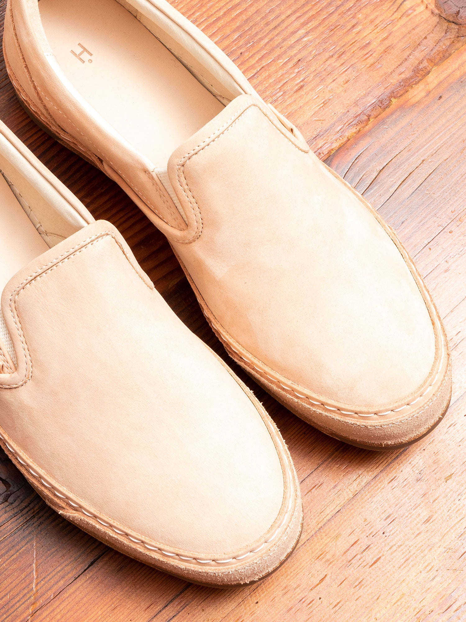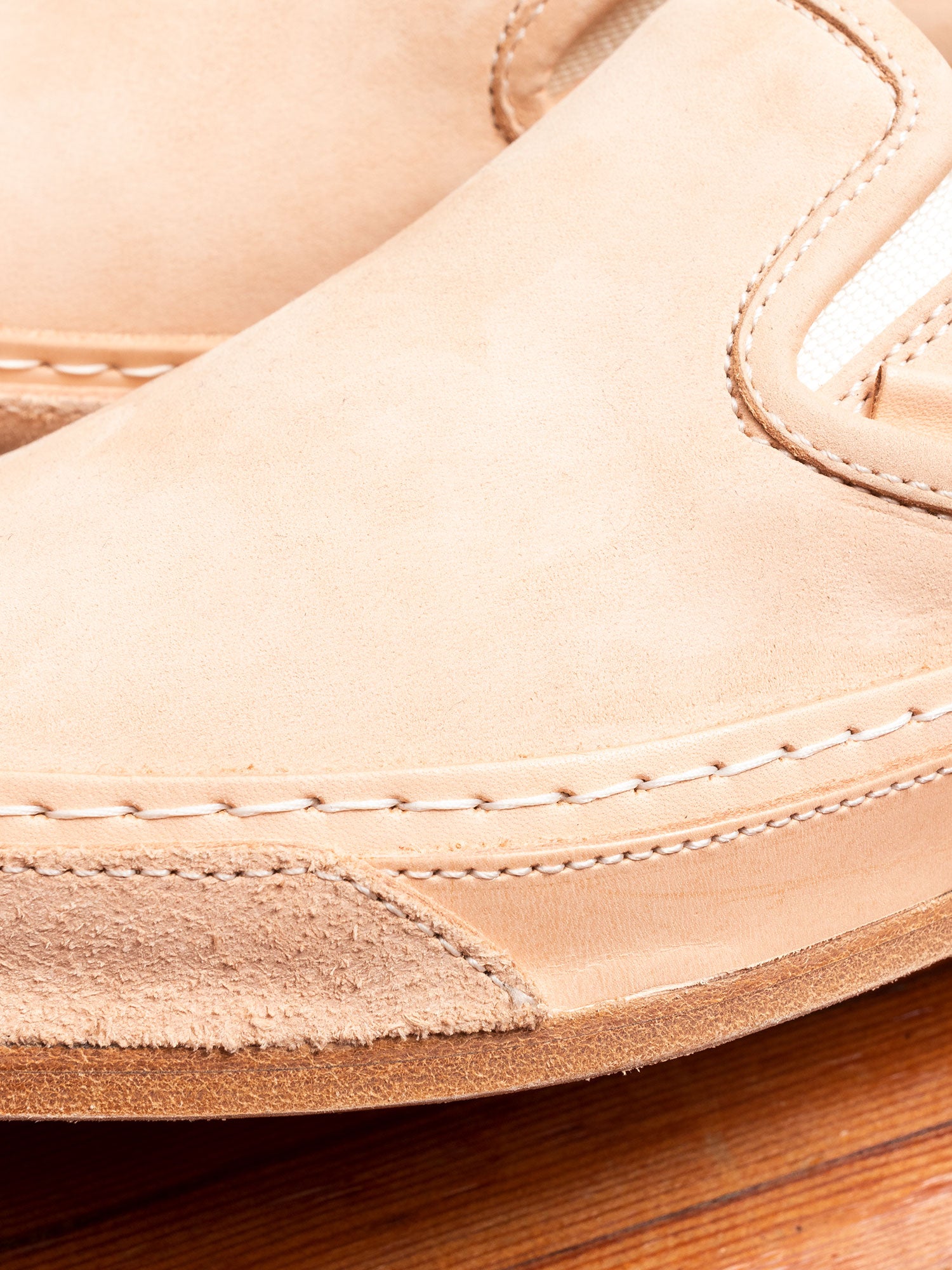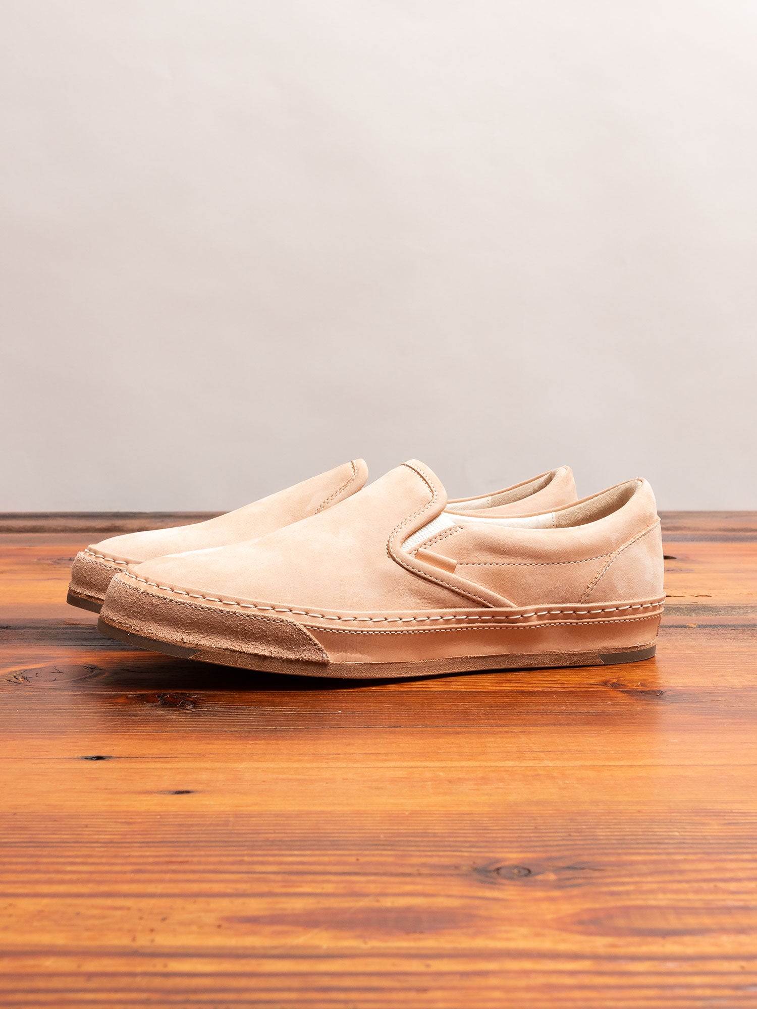• Hender Scheme's coveted Manual Industrial Products line reimagines iconic footwear silhouettes in vegetable-tanned leather. Manual Industrial Products 17 pulls inspiration from one of the most iconic classic sneakers. Handcrafted in Japan, the easy slip-on is constructed entirely out of leather with a nubuck upper, cowhide sole, and various leather trims. The natural color of all leathers will age and patina with wear, resulting in a beautiful custom shoe.