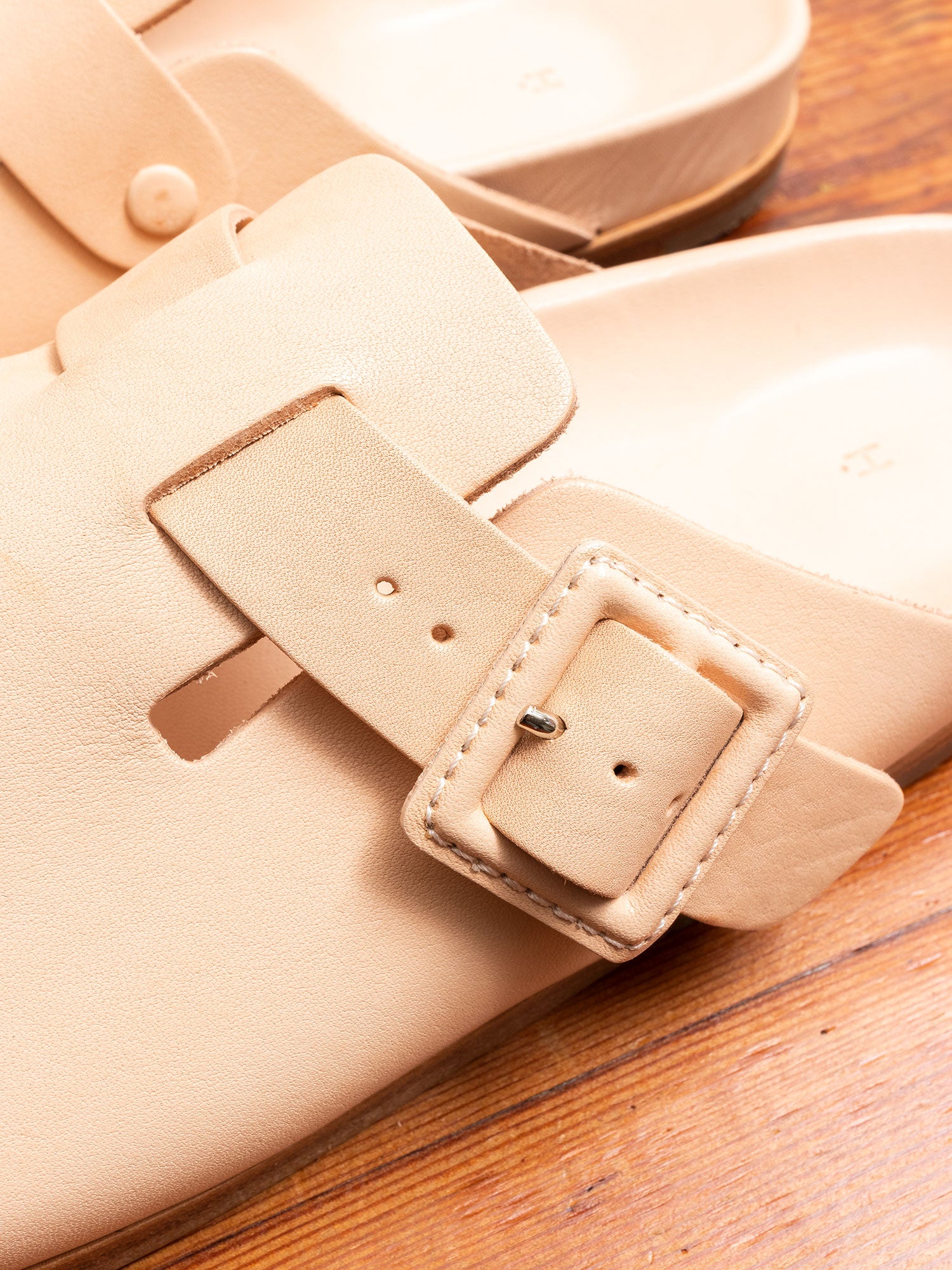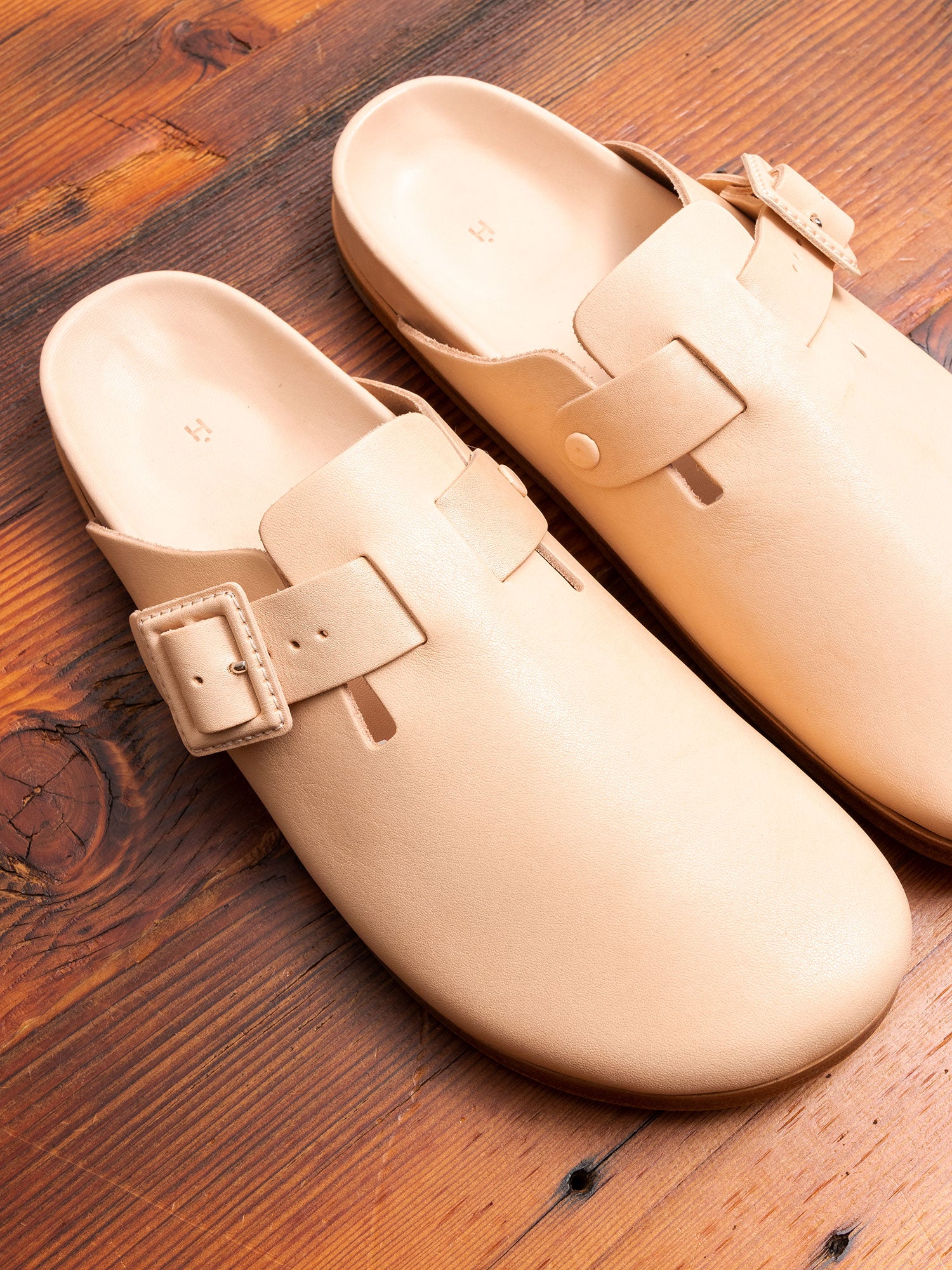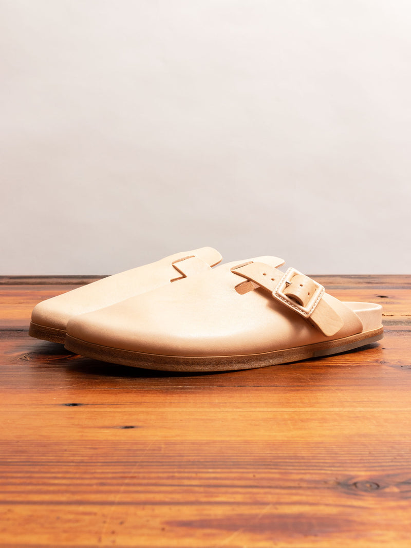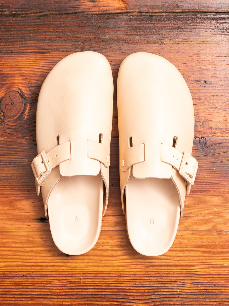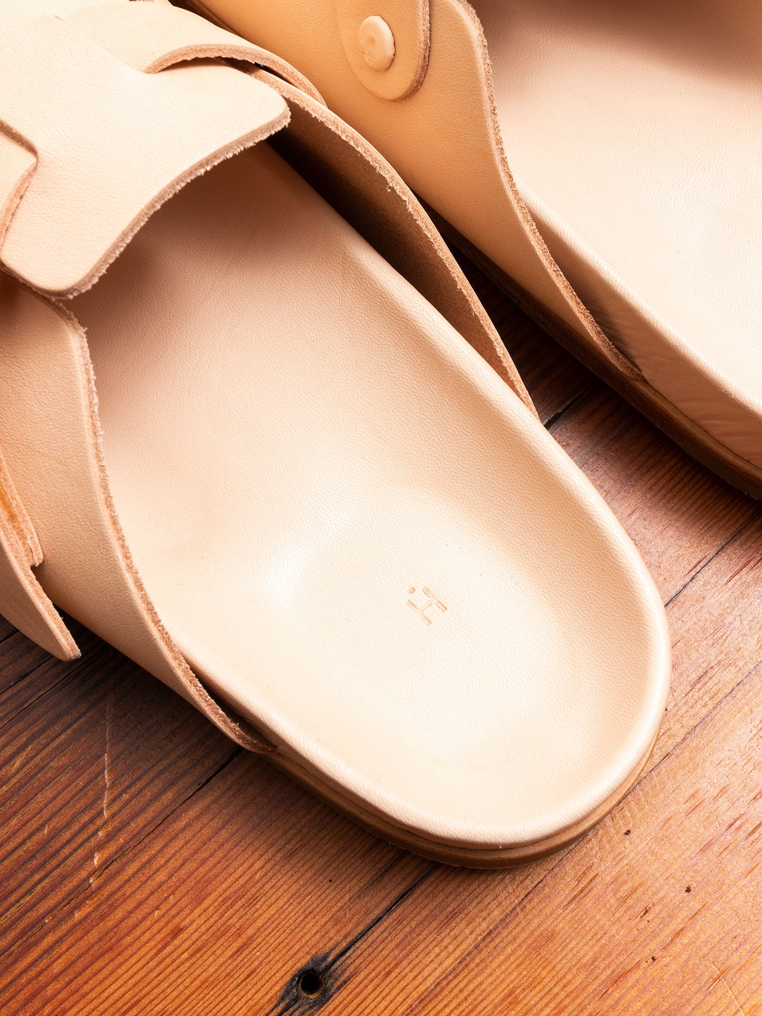 • Hender Scheme's coveted Manual Industrial Products line reimagines iconic footwear silhouettes in vegetable-tanned leather. Manual Industrial Products 24 pulls inspiration from one of the most iconic sandals in the world. Handcrafted in Japan, the easy slip-on sandal is constructed entirely out of leather with a cowhide upper, horse foot bed, and water buffalo sole. Even the metal hardware is carefully and expertly leather-wrapped. The natural color of all leathers will age and patina with wear, resulting in a beautiful custom shoe.