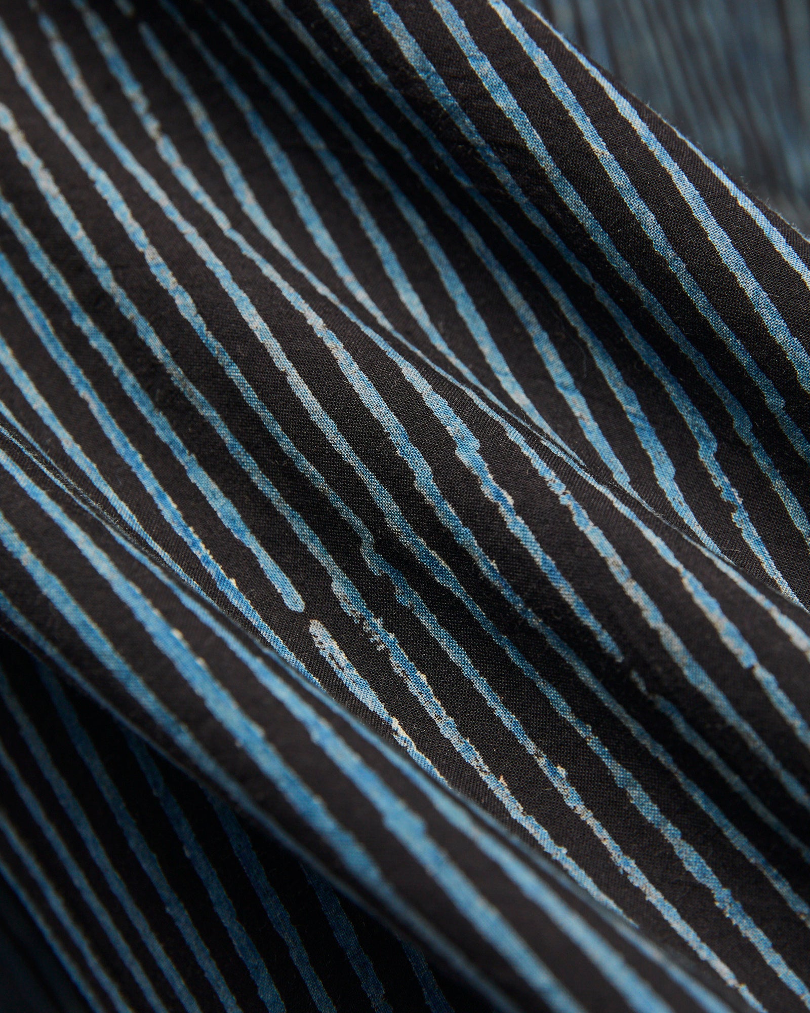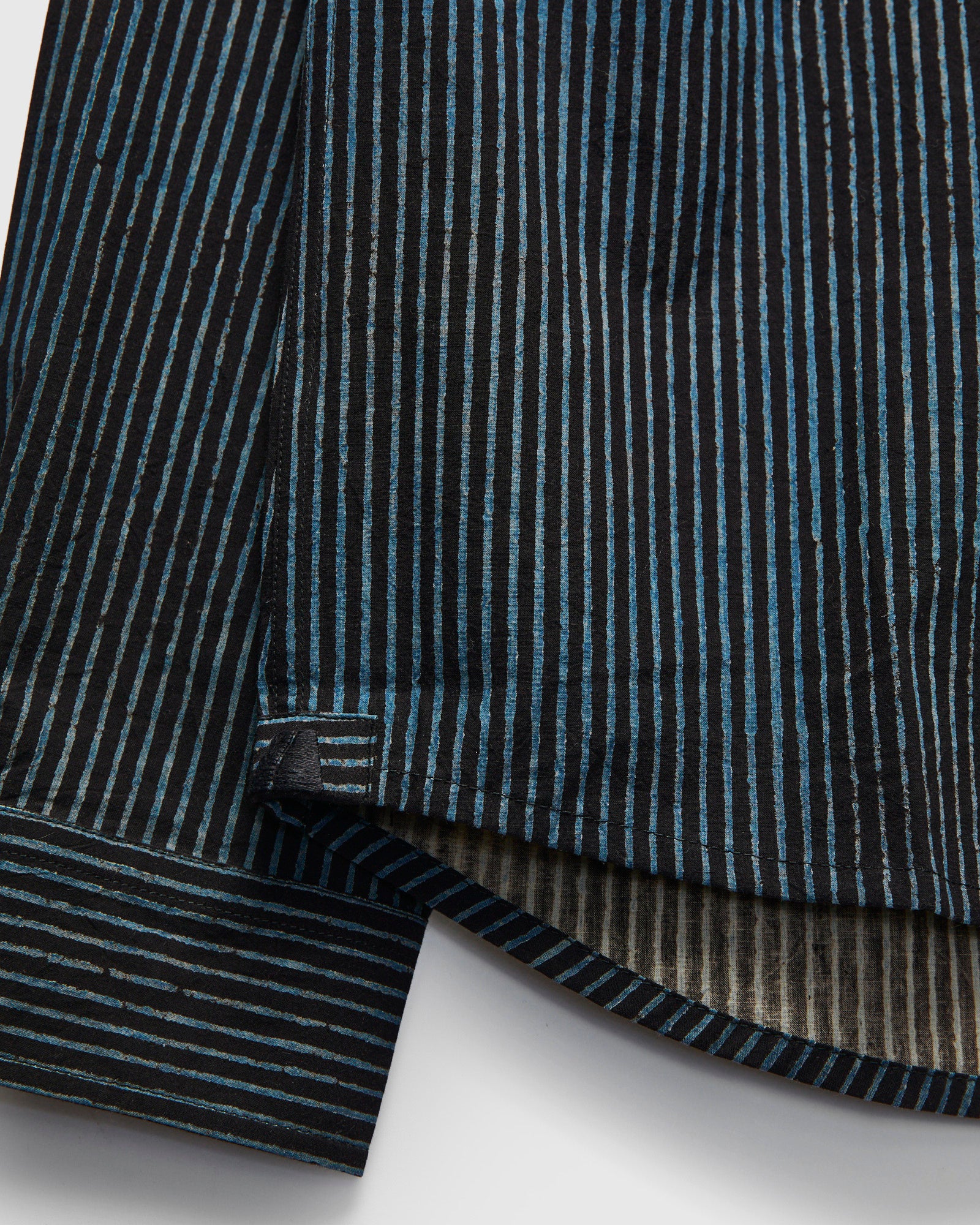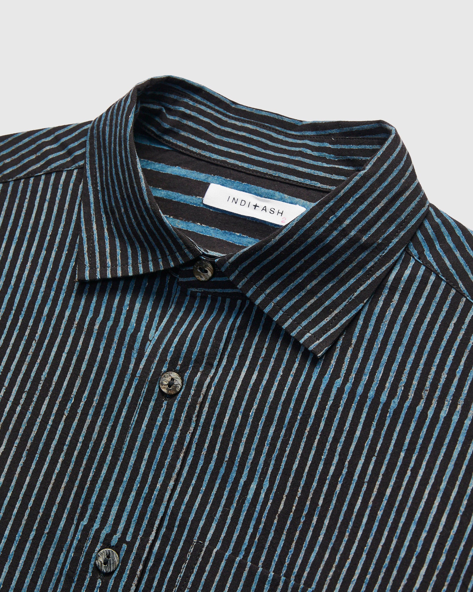 • The Matty Shirt from Indi + Ash is a classic button-up shirt made using handcrafted fabrics. This iteration features a hand-printed stripe pattern atop a smooth organic cotton. Artisans use wooden blocks to stamp the stripe pattern onto the fabric by hand, resulting in subtle variations throughout. The print's color comes from natural iron and indigo dyes. Finished with durable French seams, akoya shell buttons, and a single chest pocket.