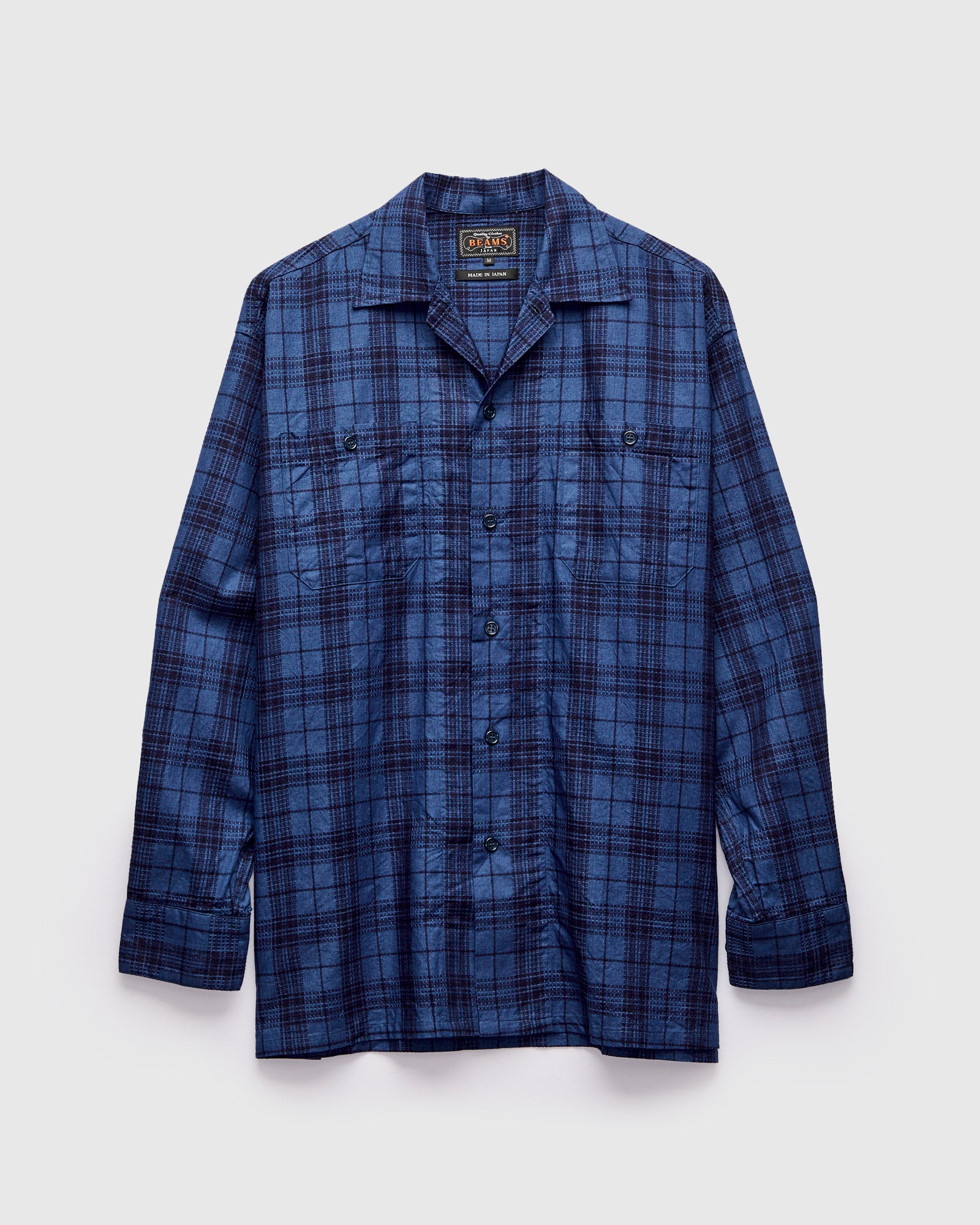 • BEAMS MIL series receives inspiration from vintage military garments, transforming items with the brands Japanese Ivy lens. The open collar shirt borrows patterns from US Officer shirting cut in a roomy-relaxed fit and designed as a medium-weight overshirt. All shirting is produced in Japan and features BEAMS' signature "+" embroidery at the hem. Woven using a dobby loom, this iteration features a indigo-dyed wide plaid fabric that will fade with wash and wear.