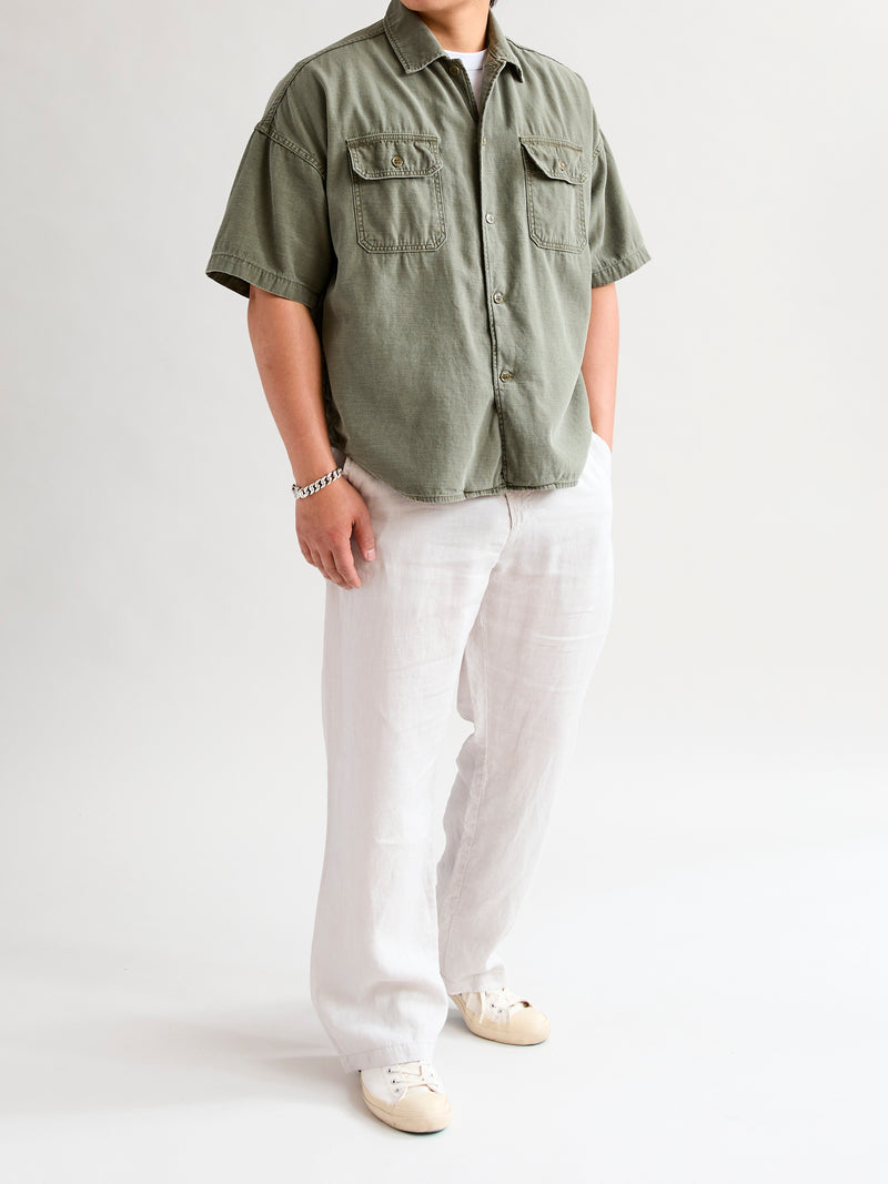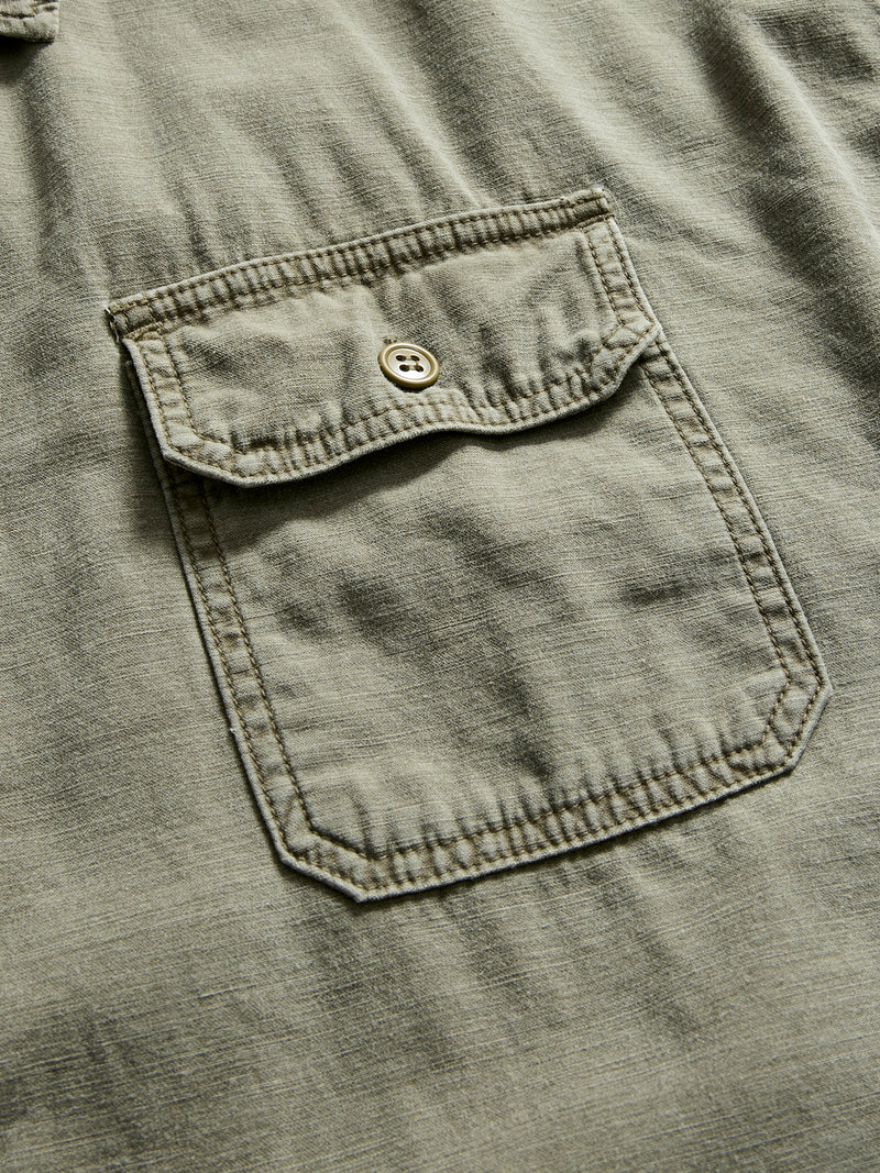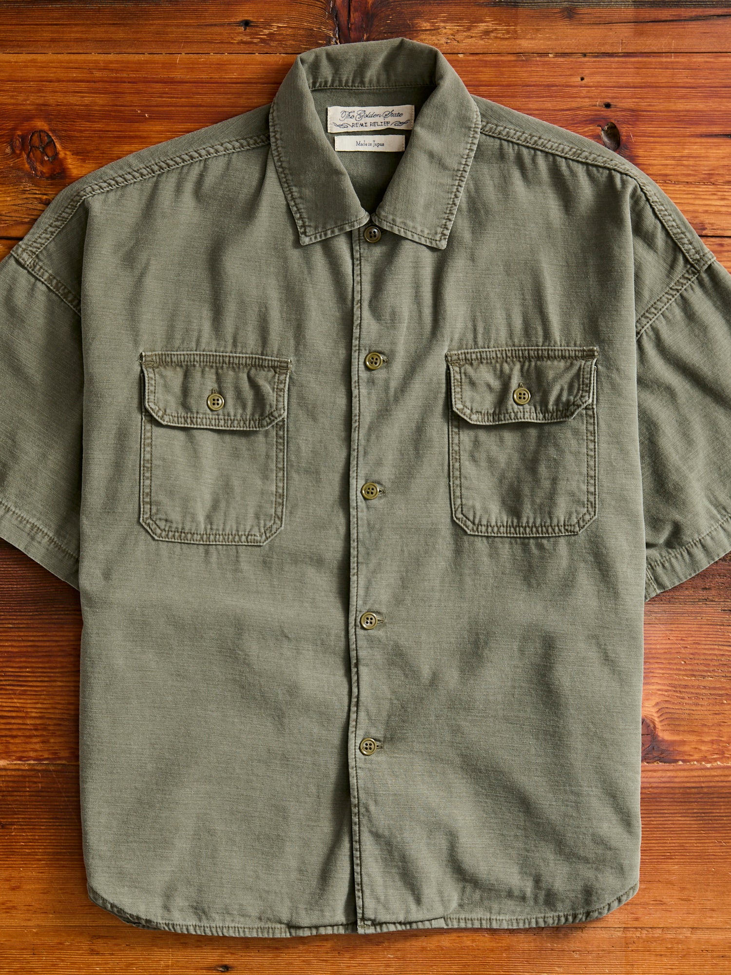 • This cut and sew military shirt from Remi Relief is constructed using a Japanese military sateen fabric that has been processed for added texture and softer feel. The shirt comes sewn in a relaxed fit short sleeve design, complete with pockets at the chest and a scalloped hem.