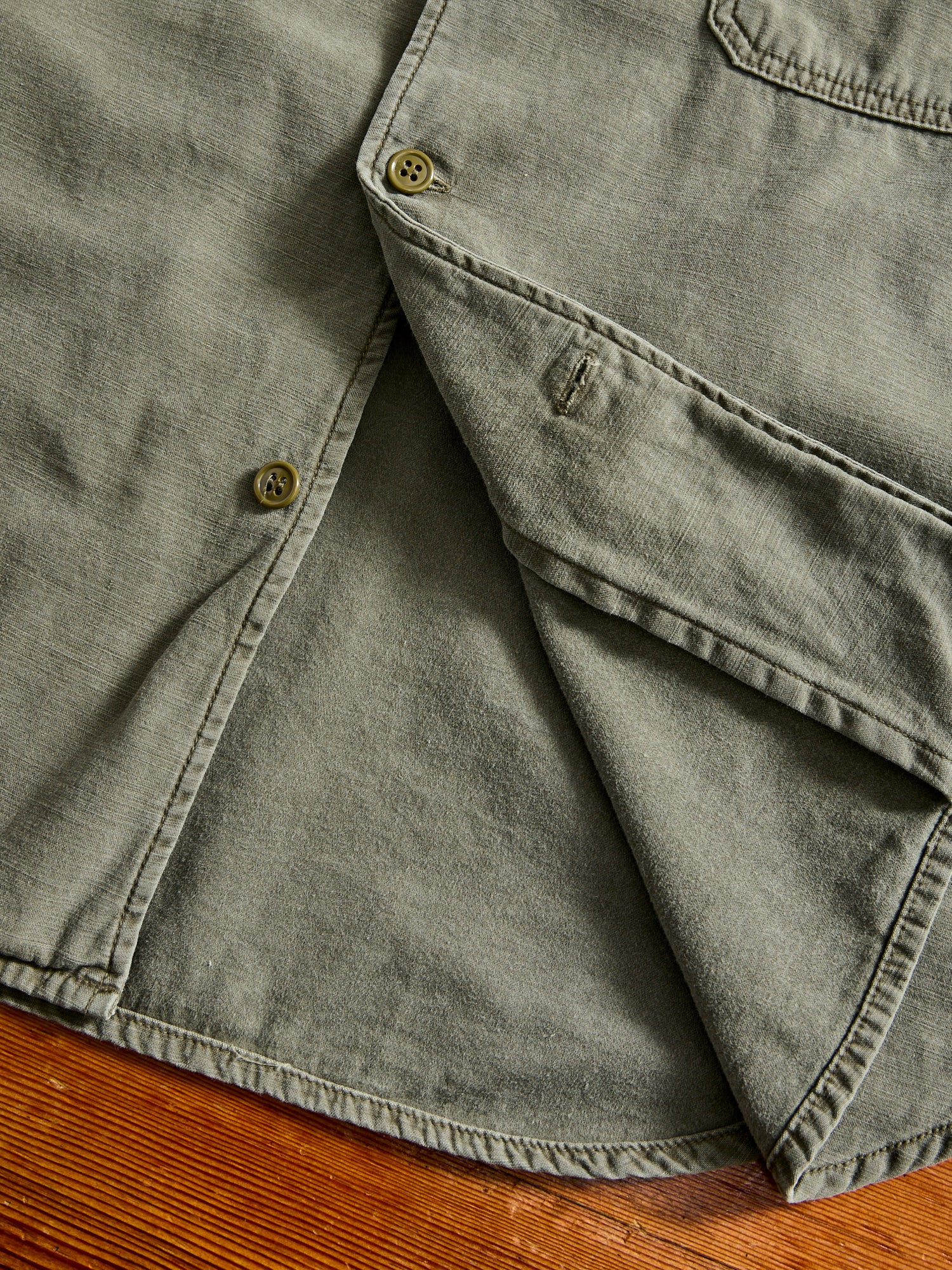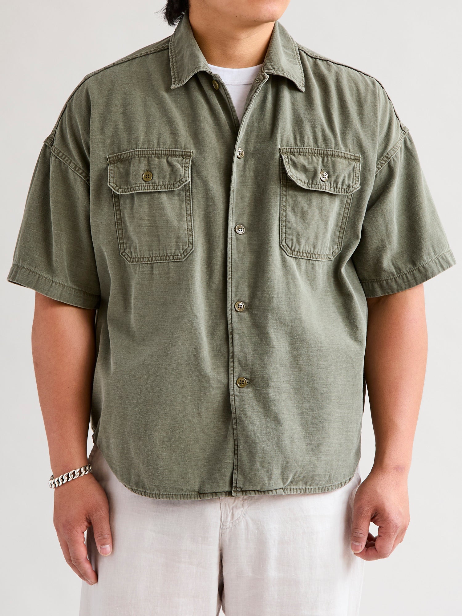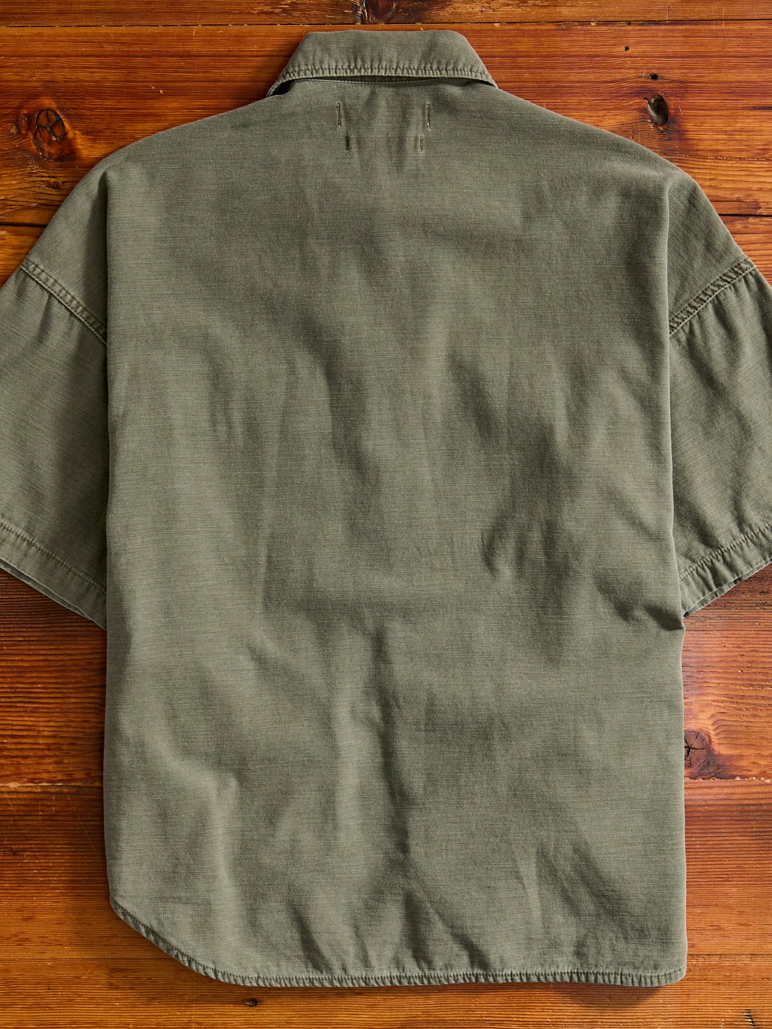 • This cut and sew military shirt from Remi Relief is constructed using a Japanese military sateen fabric that has been processed for added texture and softer feel. The shirt comes sewn in a relaxed fit short sleeve design, complete with pockets at the chest and a scalloped hem.
