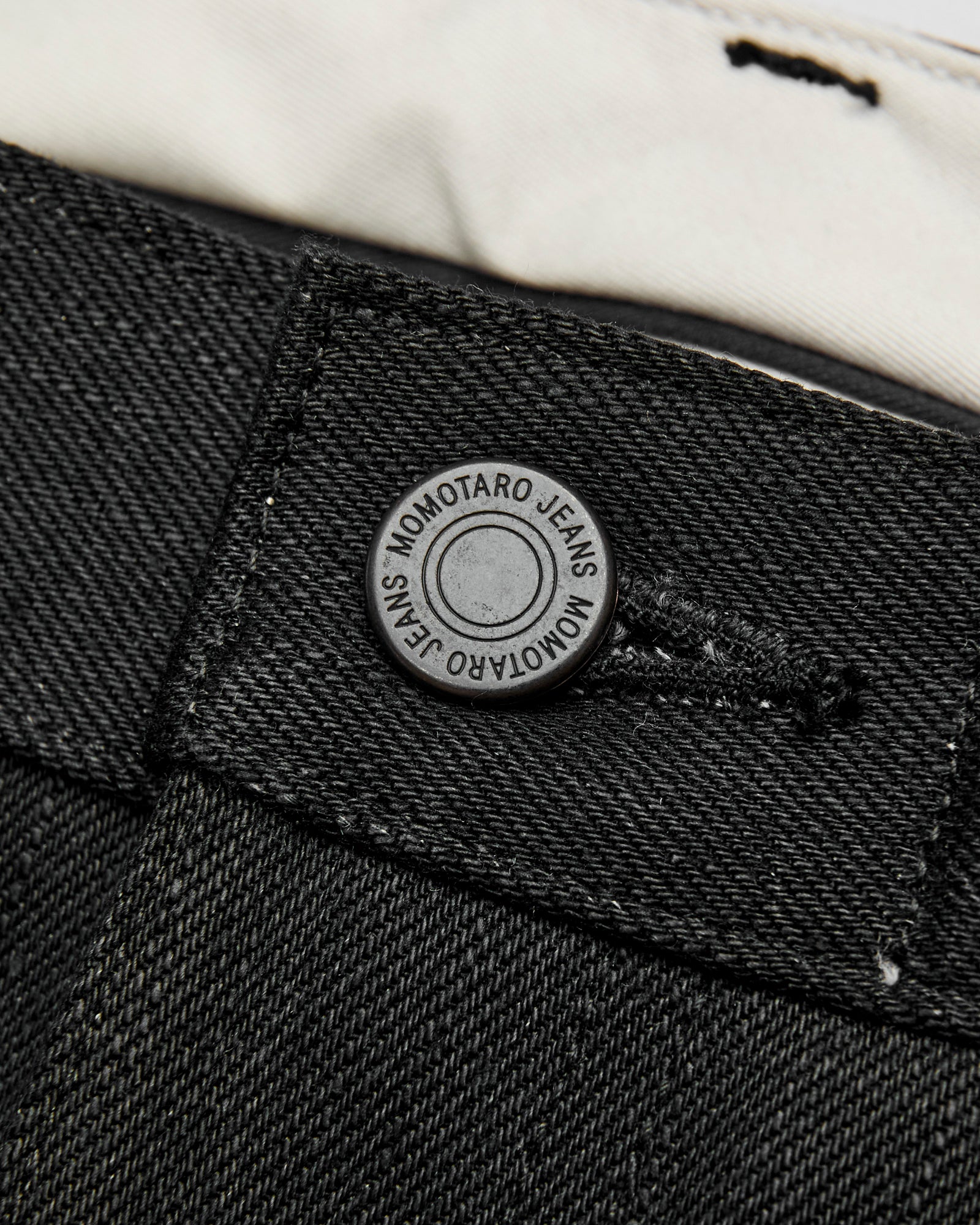 • Momotaro's "Standard" series denim is sewn using a brand new 14.7oz sanforized fabric, made from 100% Zimbabwe cotton and dyed in their signature "Double Black" color. Left in the raw, rigid state, the fabric features a tight weave, unique texture, and deep black color achieved through multiple rope-dye processes. Finished with Momotaro's iconic pink and white selvedge, and an indigo leather logo patch in homage to the peach in the famous Momotaro folktale.