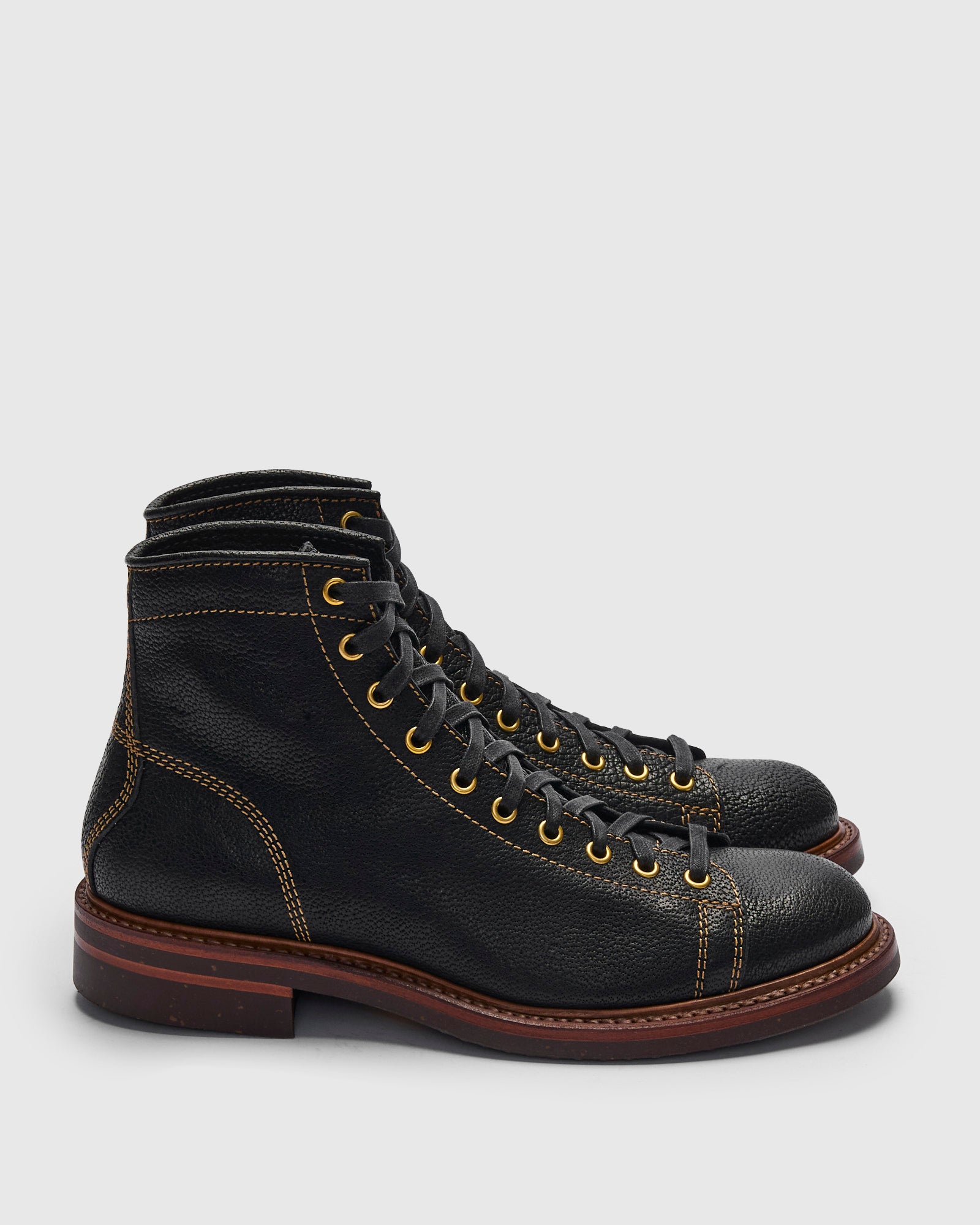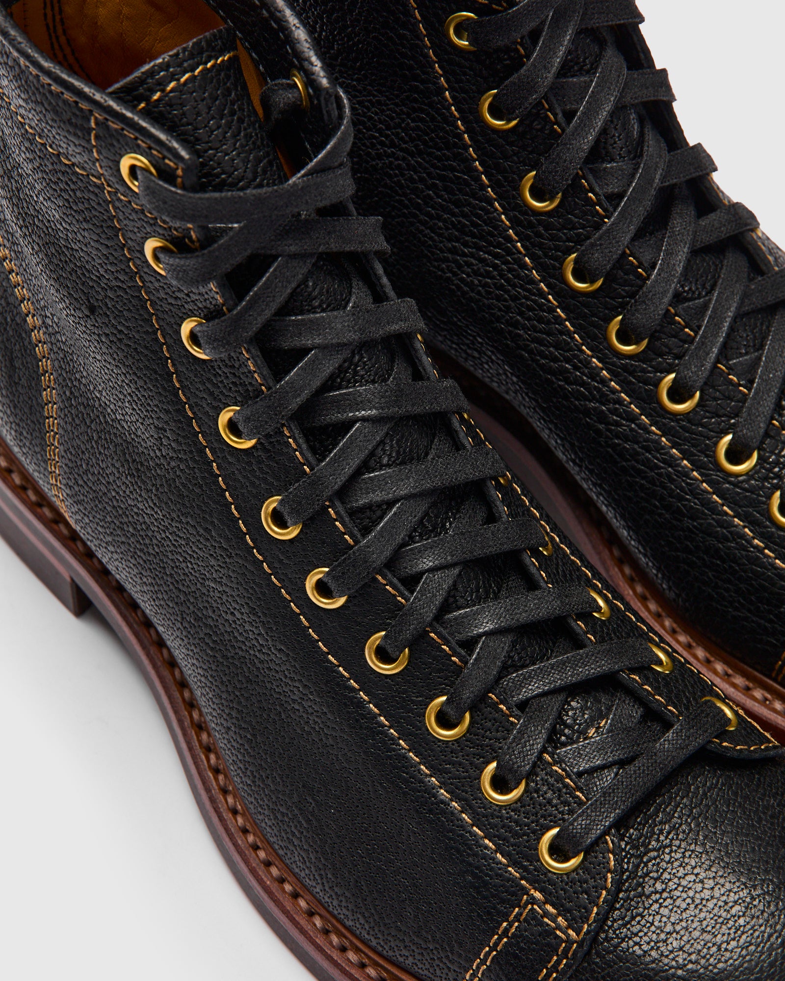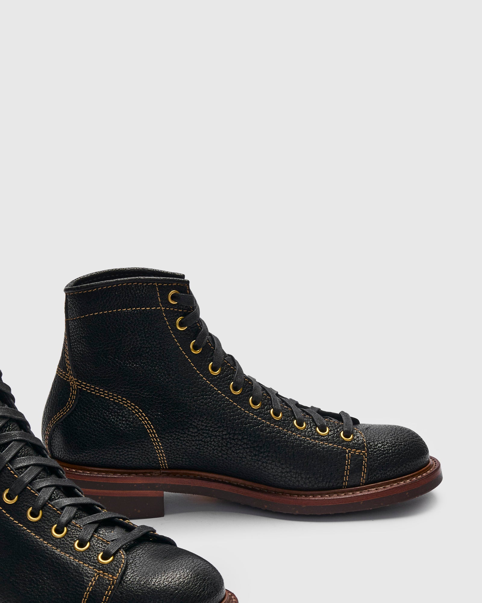 • John Lofgren outfits their vintage-inspired Monkey Boot in an extremely rare Hokkaido Ezo bear hide - a testament to the brand's patient and thoughtful design ethos. Since 2022, the brand has been slowly acquiring bear hides as they naturally passed away in the wild, ensuring ethical and respectful sourcing. The hide, coming from the brown bear that inhabits Japan's northernmost island, is distinctly pebbled with a tough surface and pliable texture. Given the material's wild origins, every boot is unique with subtle textural variation throughout. The leather is built into John Lofgren's Monkey Boot, a silhouette inspired by vintage American lace-to-toe line worker and roofer boots. Finished with contrast gold stitching, brass eyelets and a full Vibram 700 cork outsole.