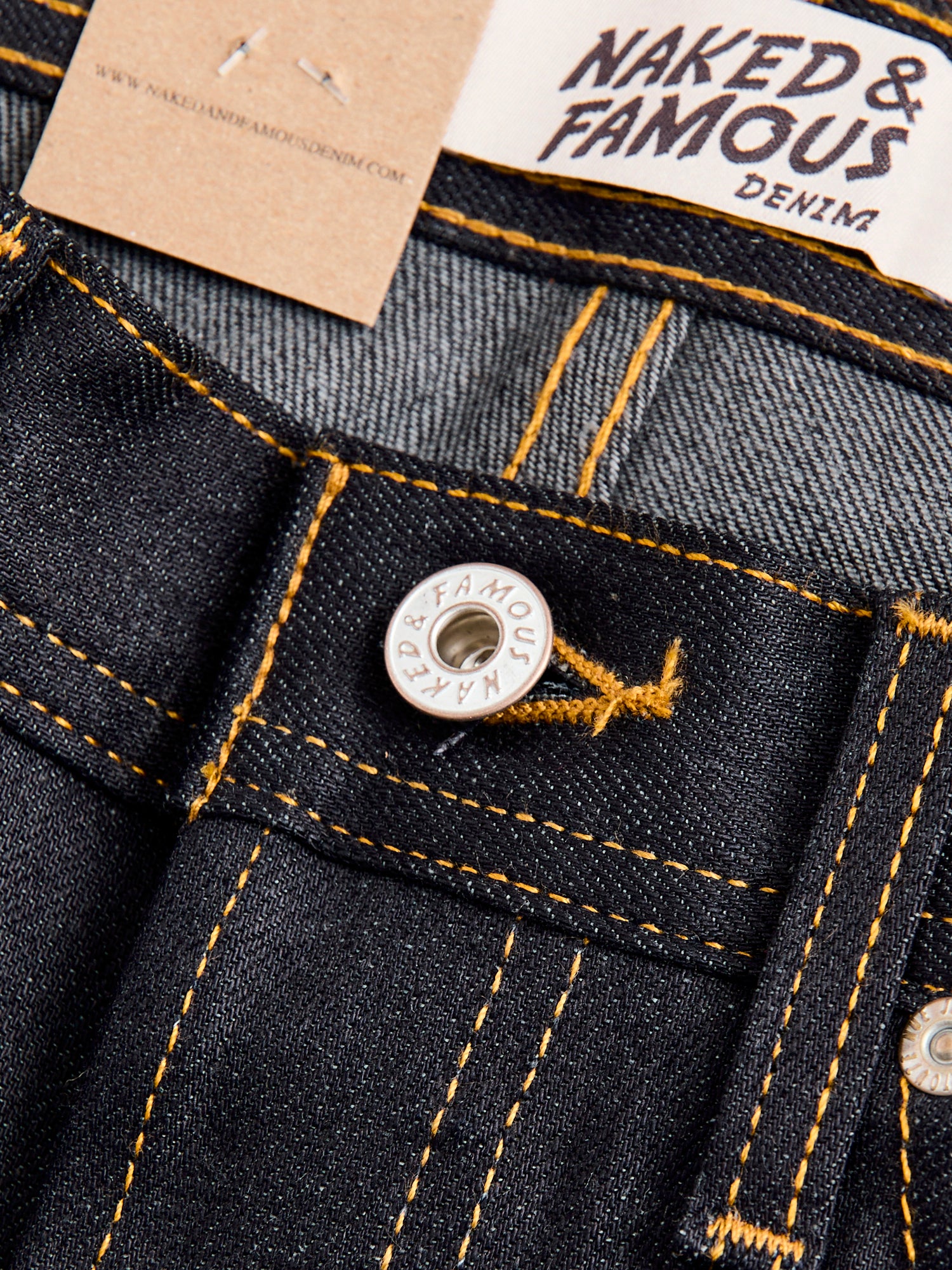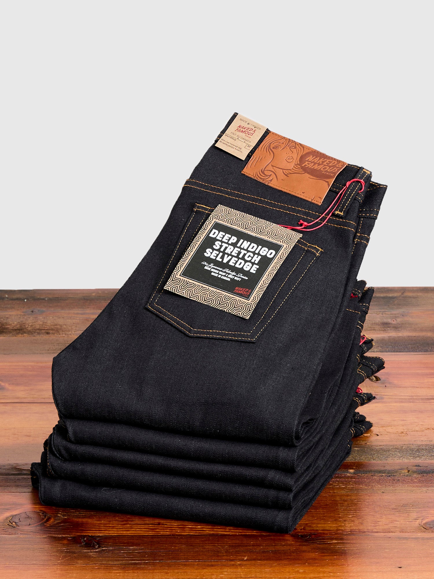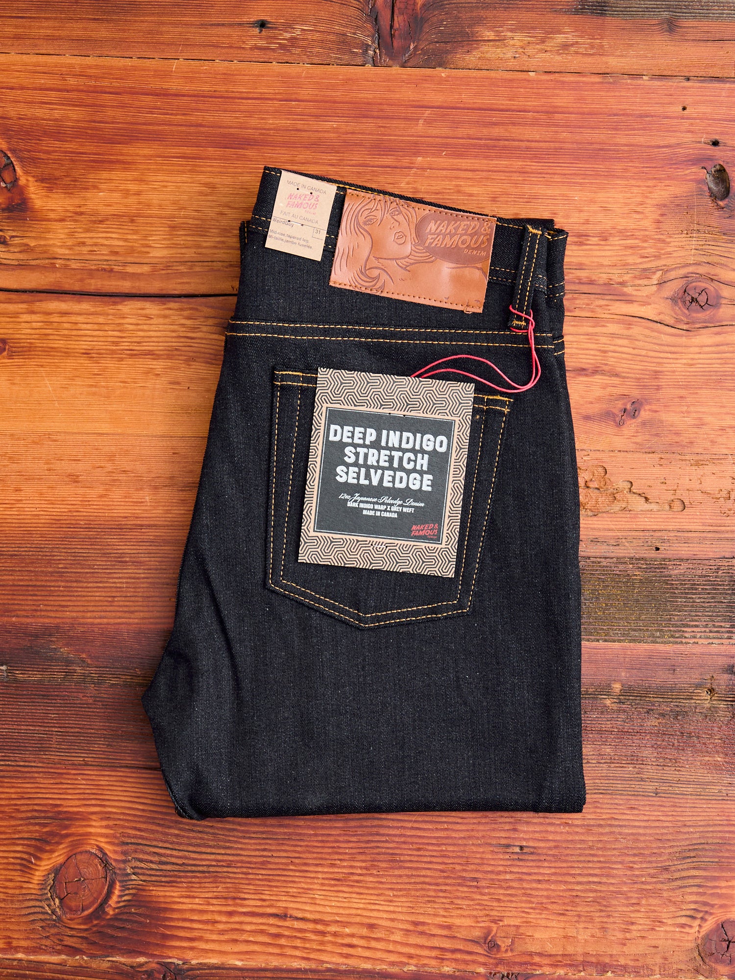 • The Deep Indigo Stretch from Naked & Famous is the brand's best selling stretch fabric, known for its remarkably comfortable feel, and rich deep indigo color. This particular denim has garnered critical acclaim for its surprisingly prominent fading, a trait typically not associated with stretch fabrics. Finished with custom Naked & Famous hardware and details, and a contrasting grey weft, these jeans are a great entry point to the world of raw denim.