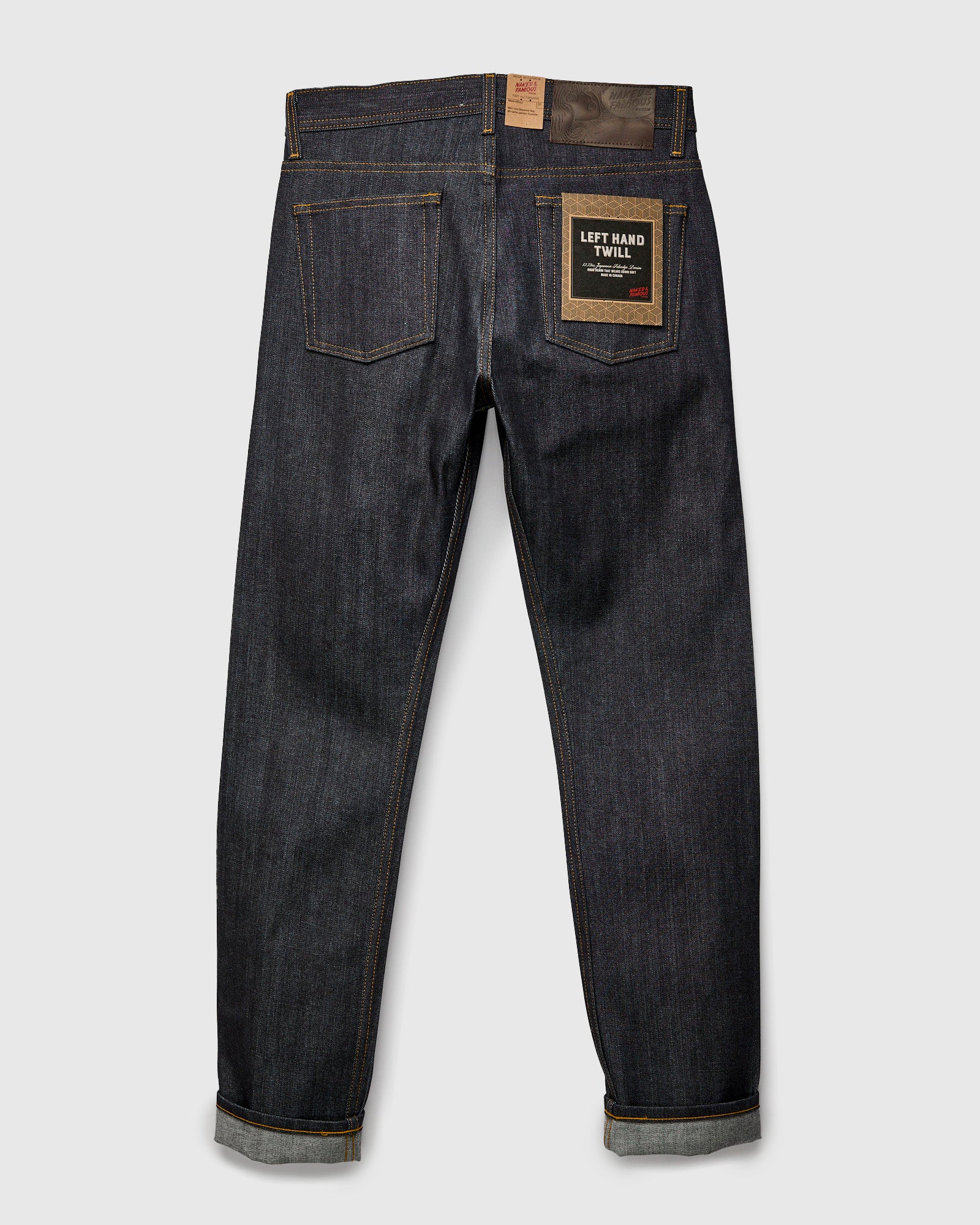 • The Left Hand Twill from Naked & Famous is the brand's best selling core denim, known for its remarkably comfortable feel, easiness to break in, and classic indigo color. Spun in reverse direction on the shuttle loom, the left hand twill creates a much softer feel than traditional right hand twill, and allows for more stretch in the cotton and a much faster break-in period, making these jeans the perfect entry point to the world of raw denim.