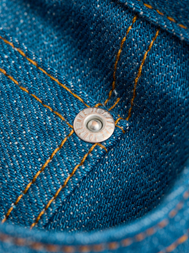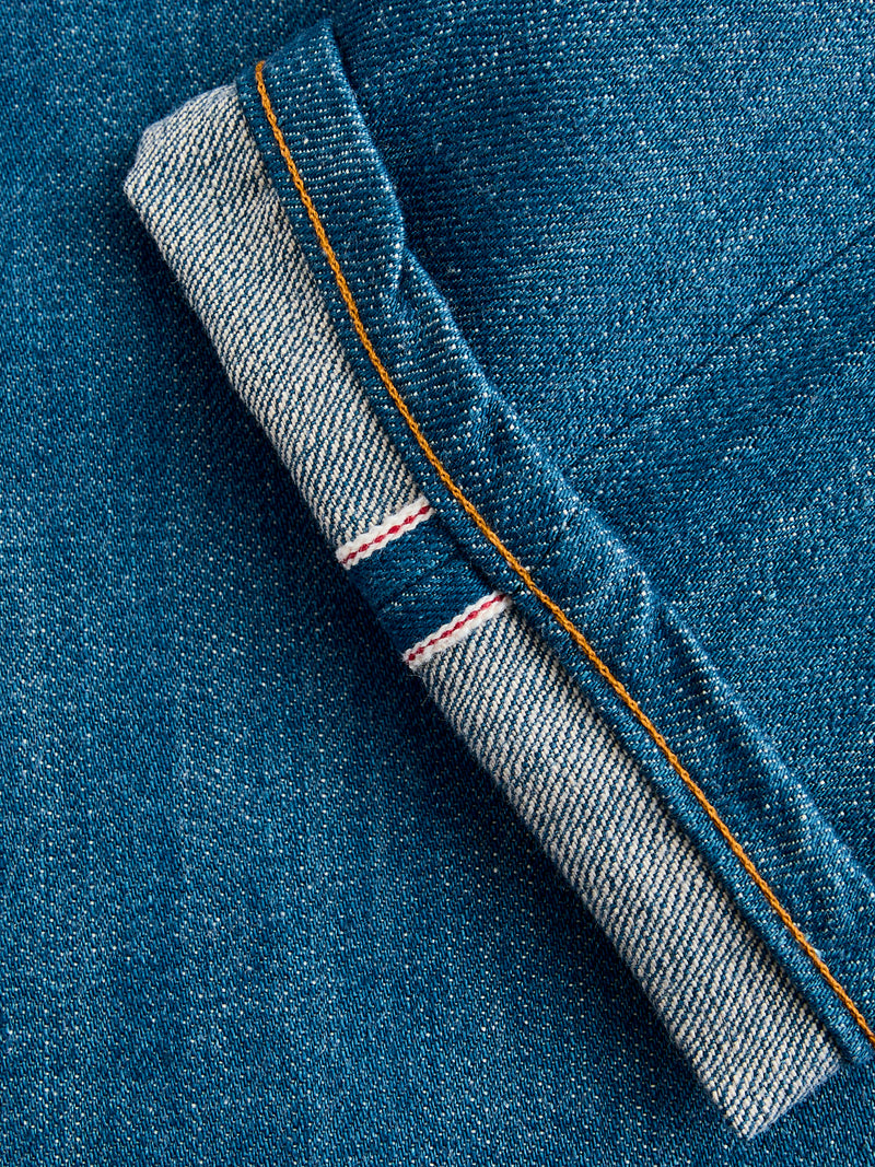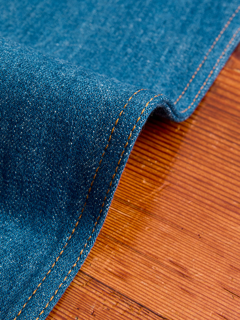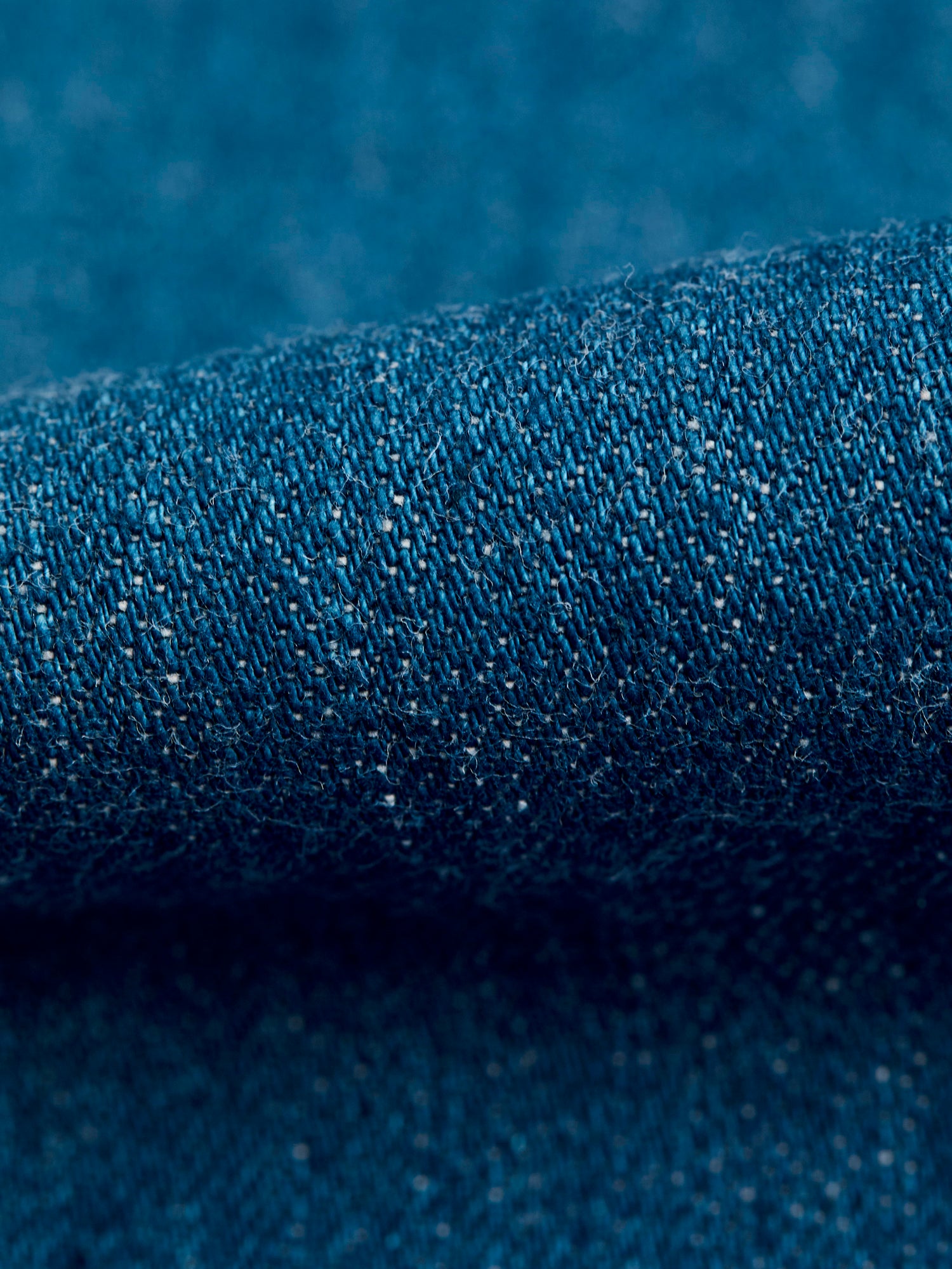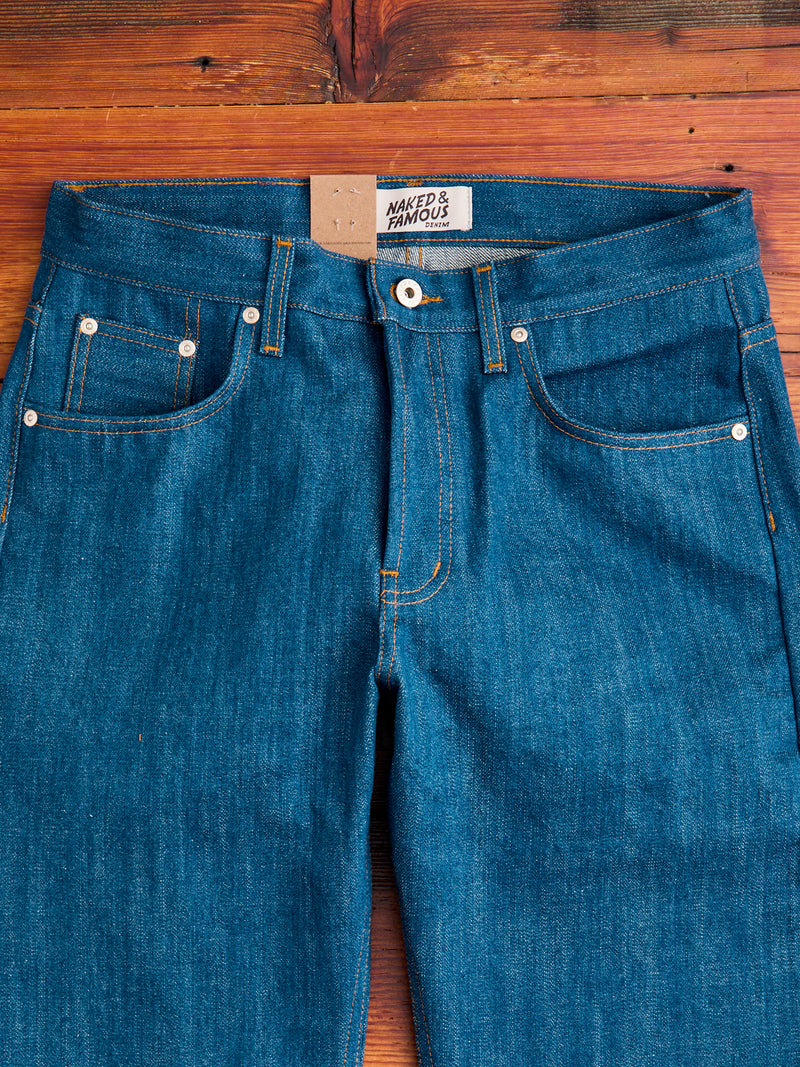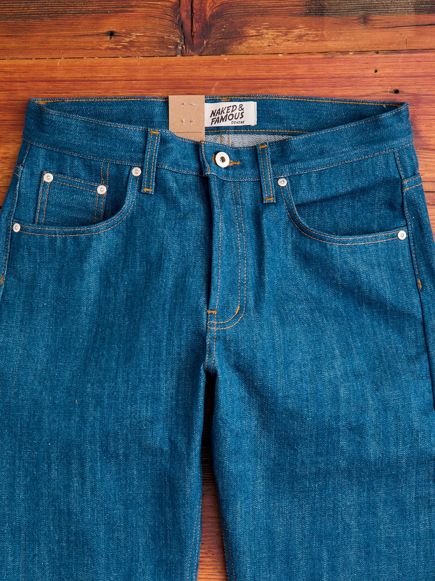 • The Ocean's Edge Selvedge is a 13oz Japanese Selvedge Denim, woven on vintage shuttle looms at low tension and dyed a deep ocean blue. With a moderate medium weight feel, the fabric undergoes an in-house rinse process, resulting in a soft touch and irregular texture. Inspired by ocean's water, the antique blue color will gradually fade over time to a lighter indigo hue. Finished with custom Naked & Famous hardware and details.