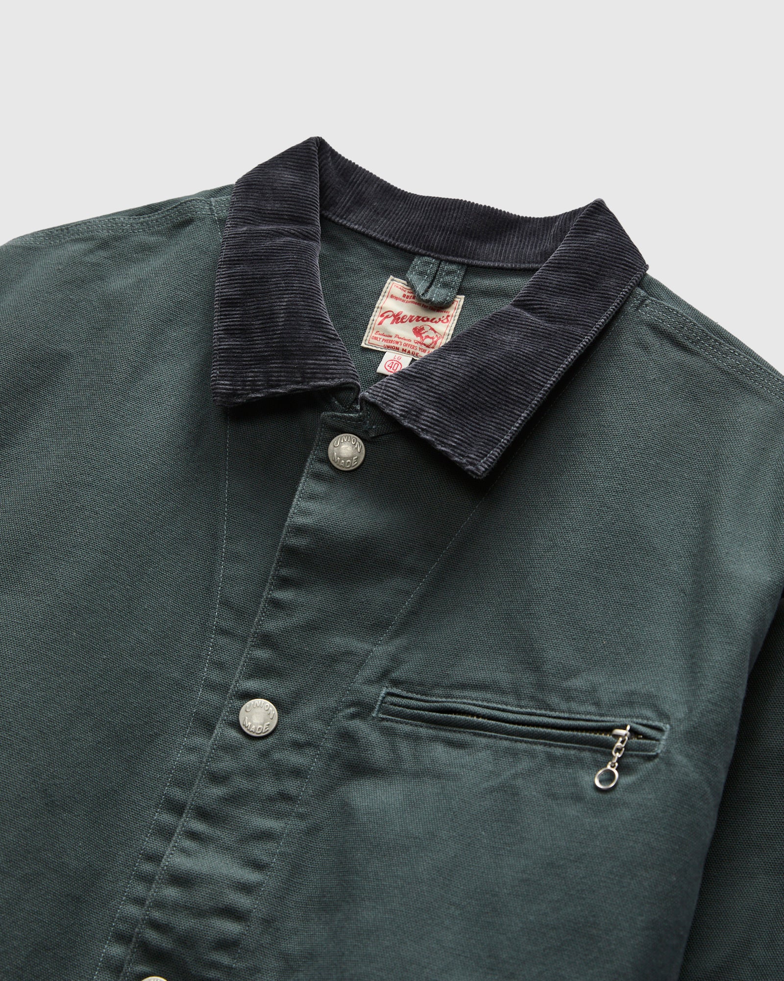 • Sourcing designs from the 1960s, Pherrow's proprietary duck canvas sports a medium-weight heft and durable-high tension weave. The jacket is fitted with patch pockets at the waist, a corduroy collar, and brass hardware throughout.