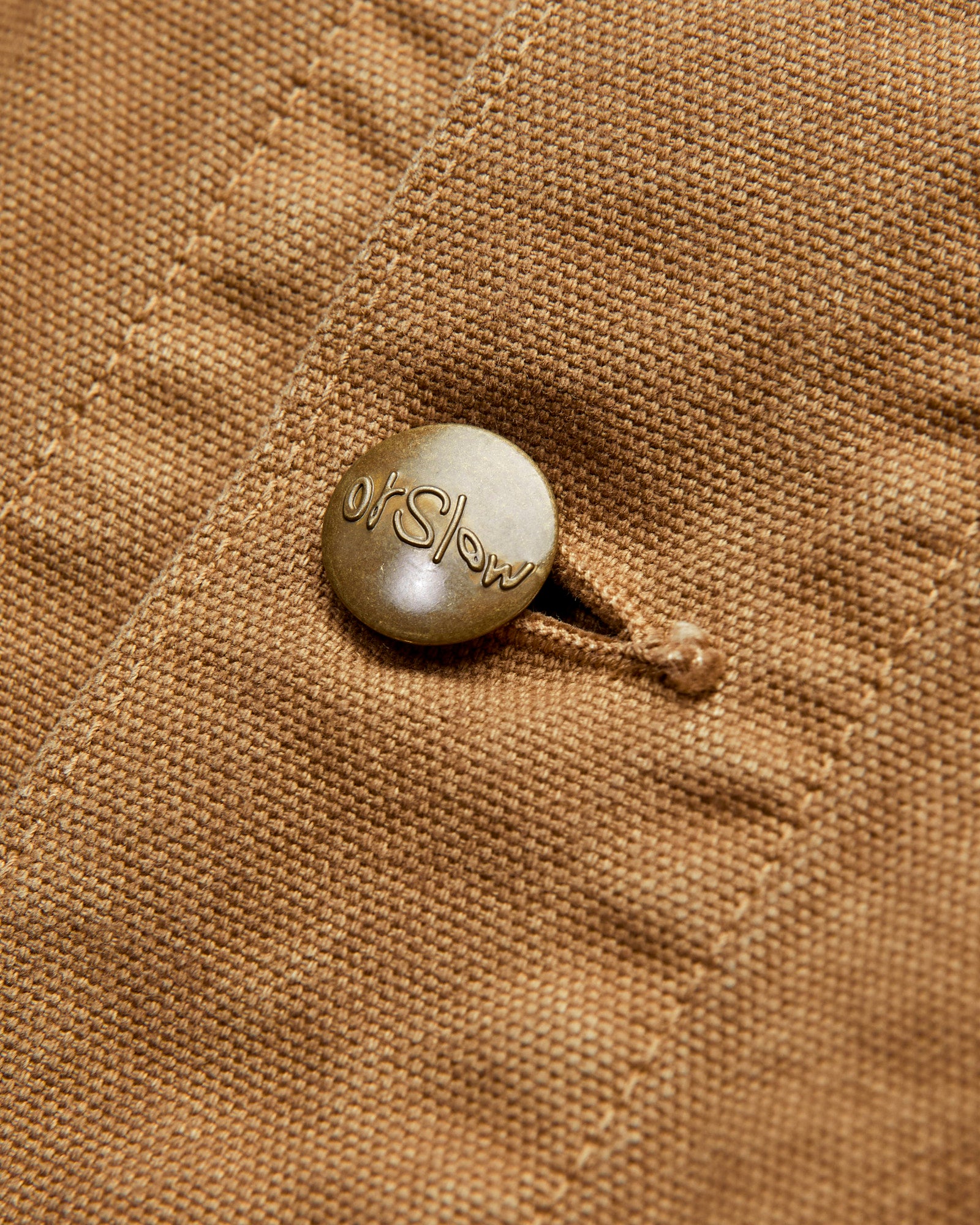 • This relaxed jacket from orSlow is built upon the classic workwear coverall design. Expertly crafted in Japan, the jacket makes use of a sturdy washed duck canvas, replicating the feel and appearance of vintage garments. The jacket comes fitted with four utility style exterior pockets, as well as metal donut buttons on the placket. Finished with a corduroy collar and cuff interior, and bartack reinforcement at points of strain.