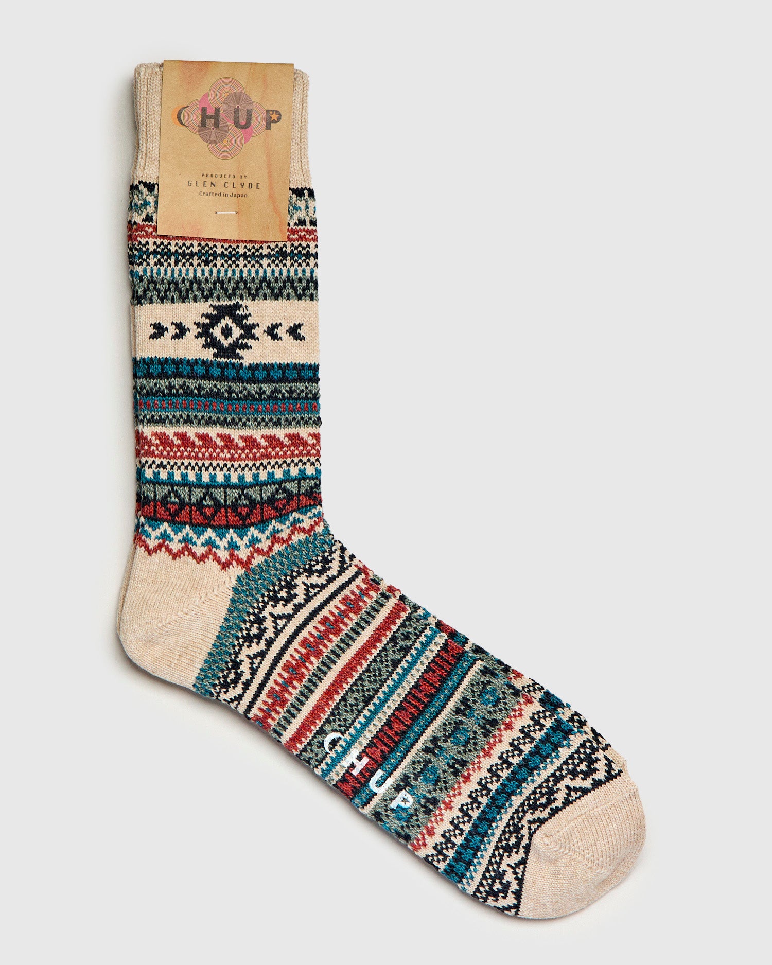 • The Rio Colorado socks from CHUP are soft full-length socks which take their inspiration from America's natural landscape. Jacquard woven using a blend of heavyweight multi-colored yarn, all socks from CHUP are handcrafted in Japan as part of Glen-Clyde Inc.