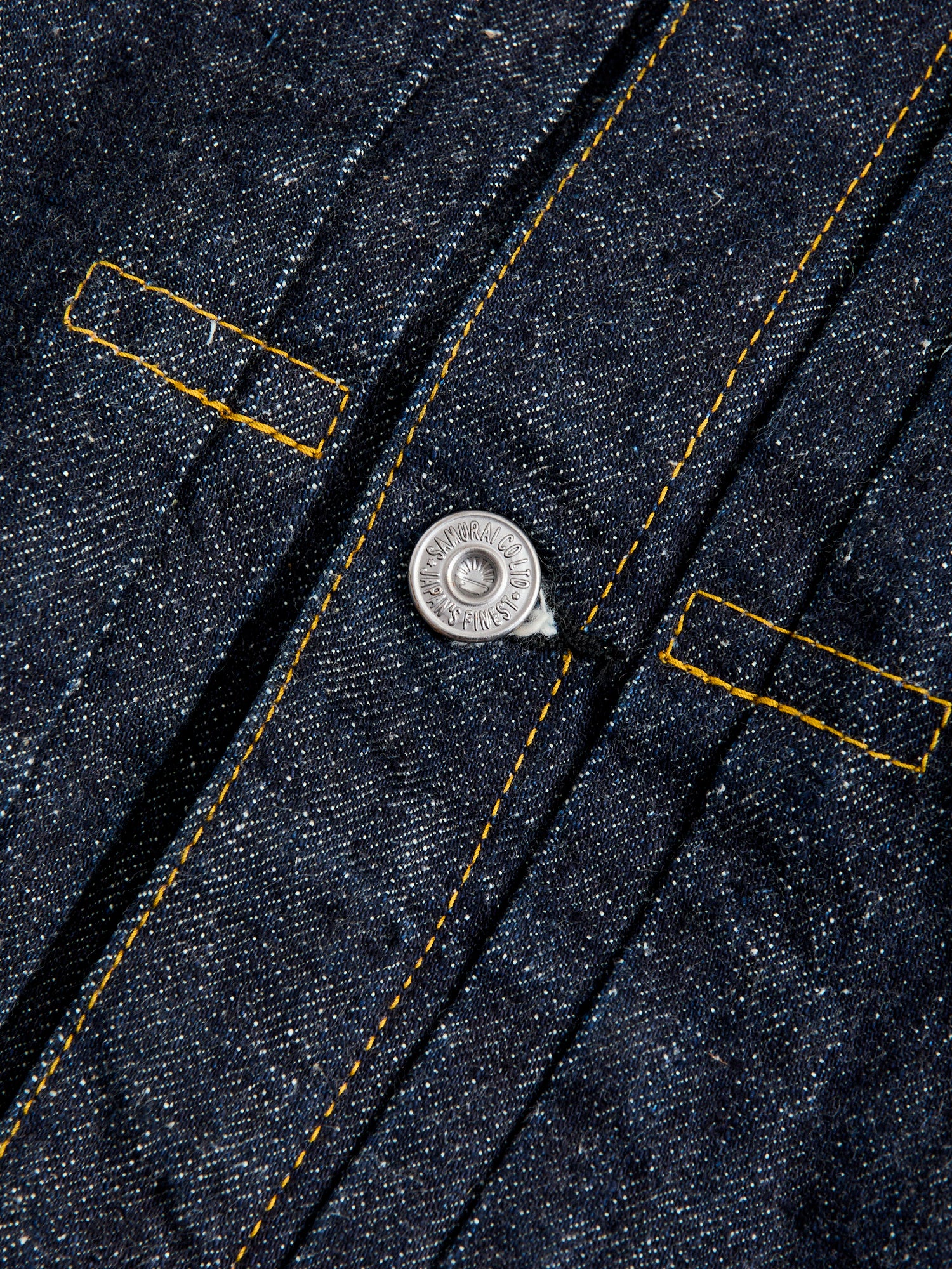 • The "Otokogi" fabric from Samurai is a well-balanced 15oz denim which exhibits subtle characteristics of slub and nep, with a soft yet durable hand feel. Using entirely American Texas Cotton, this jacket features classic Samurai workmanship in an easy, year-round weight This jacket is cut in a unique mixed Type 1 design, pulling elements from classic denim jackets, and adding functional modern details such as hand pockets. Finished with custom detailing accentuating the brands uniquely Japanese ethos.