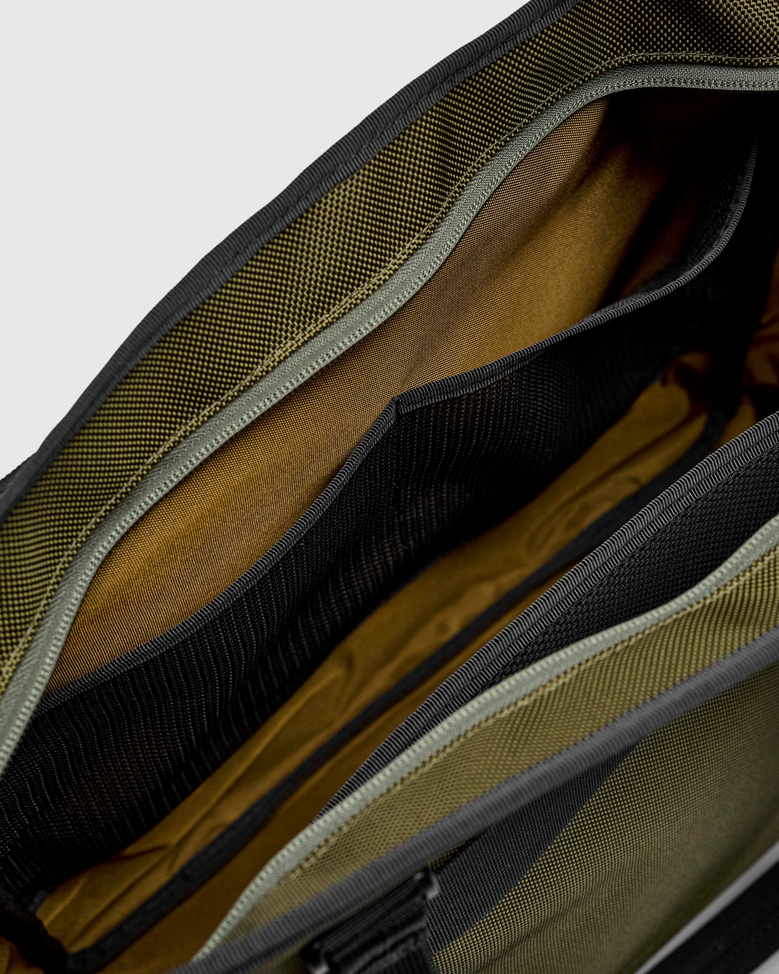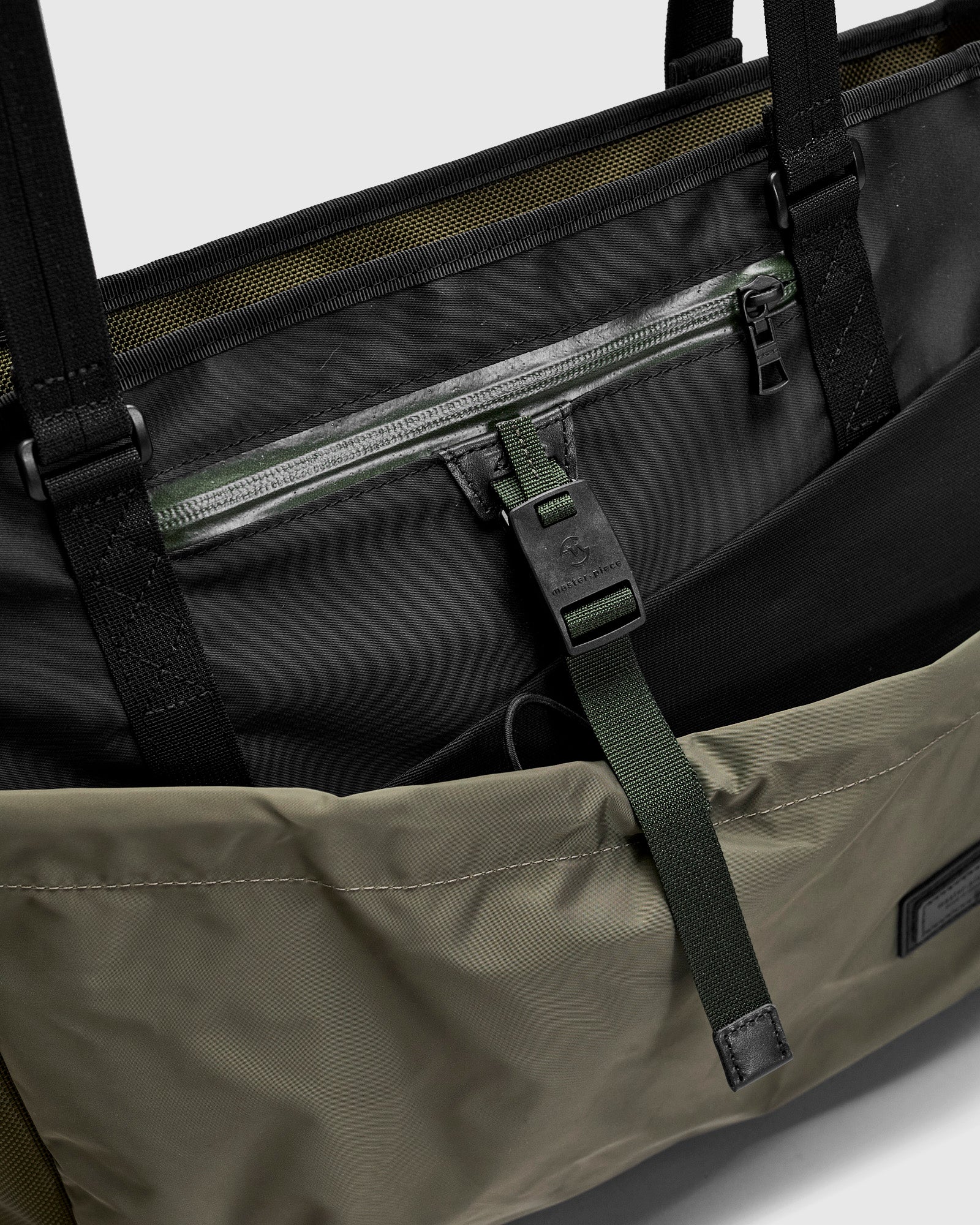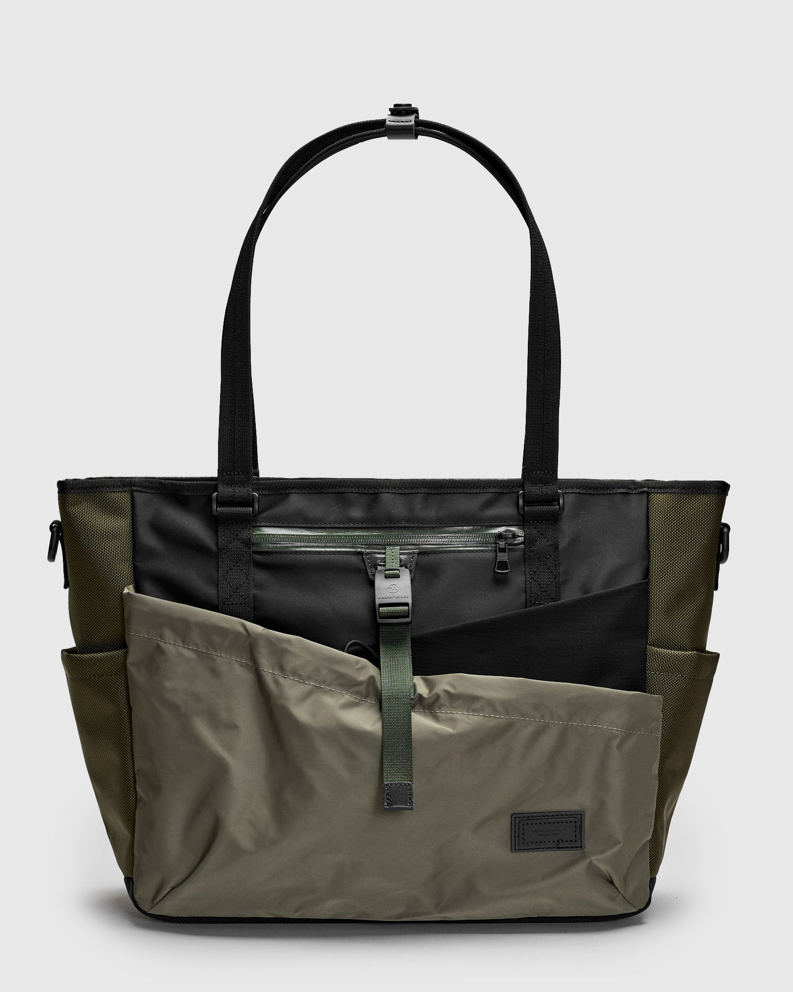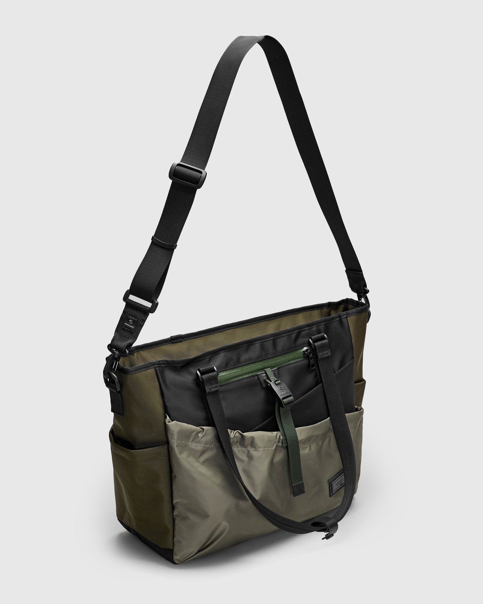 • The Scramble series from Master-Piece is crafted from a 1680 denier high density nylon fabric specially woven using twisted yarn for high durability. The tote sports a layered 2way design that can be worn over the shoulder or used with carry handle straps. Detailed with a layered front pocket design, the bag features an array of storage compartments complete with tonal stitching and cow leather trim.