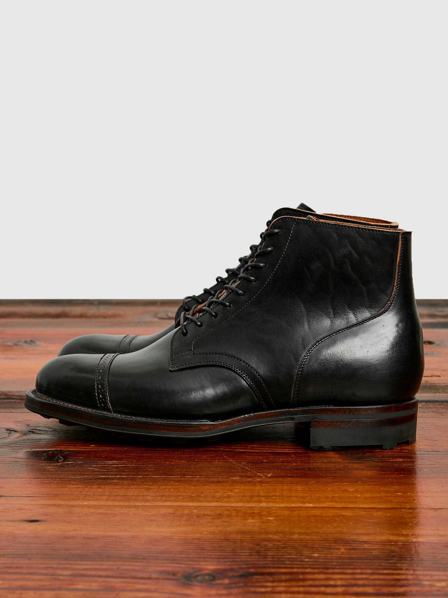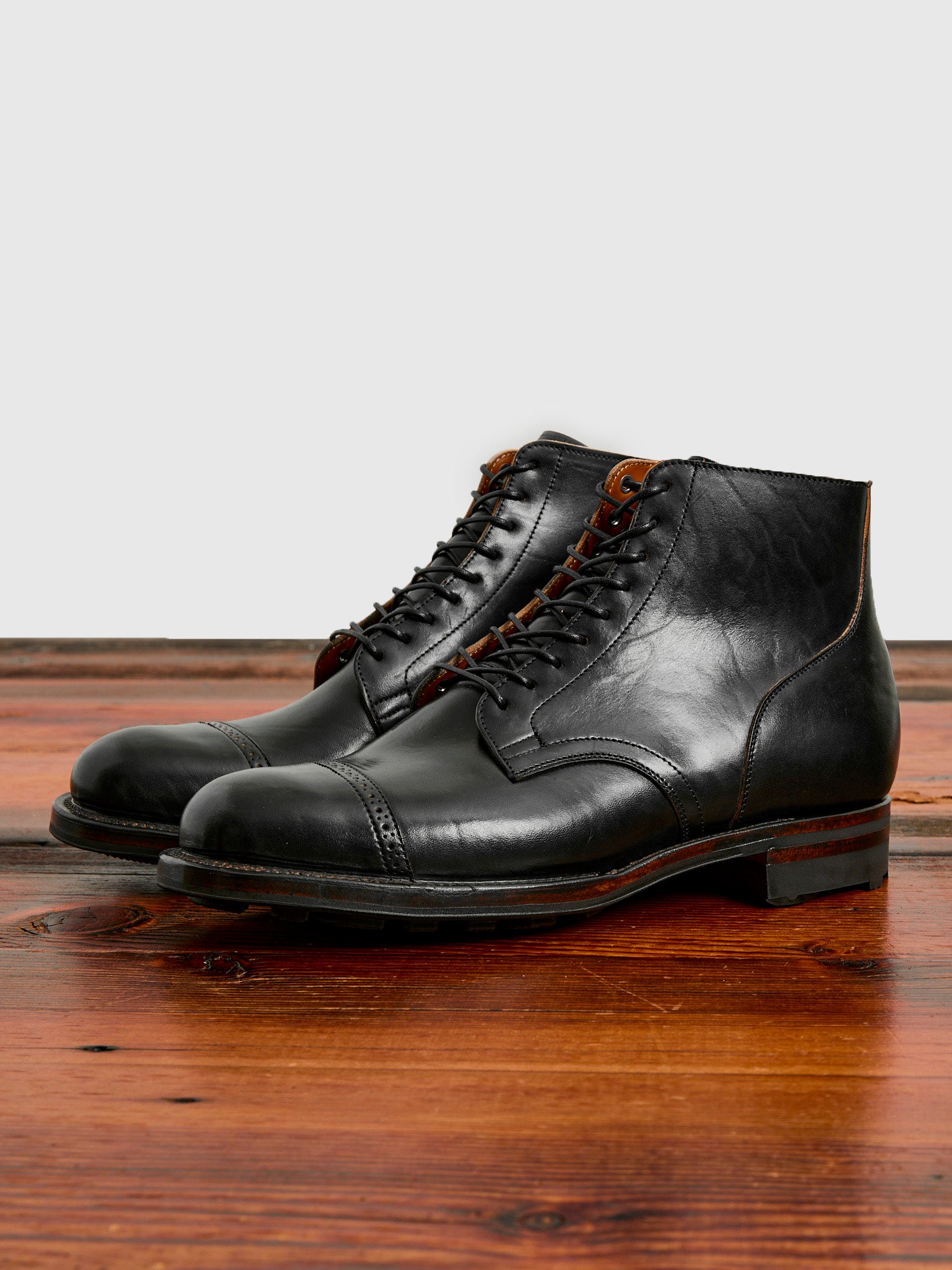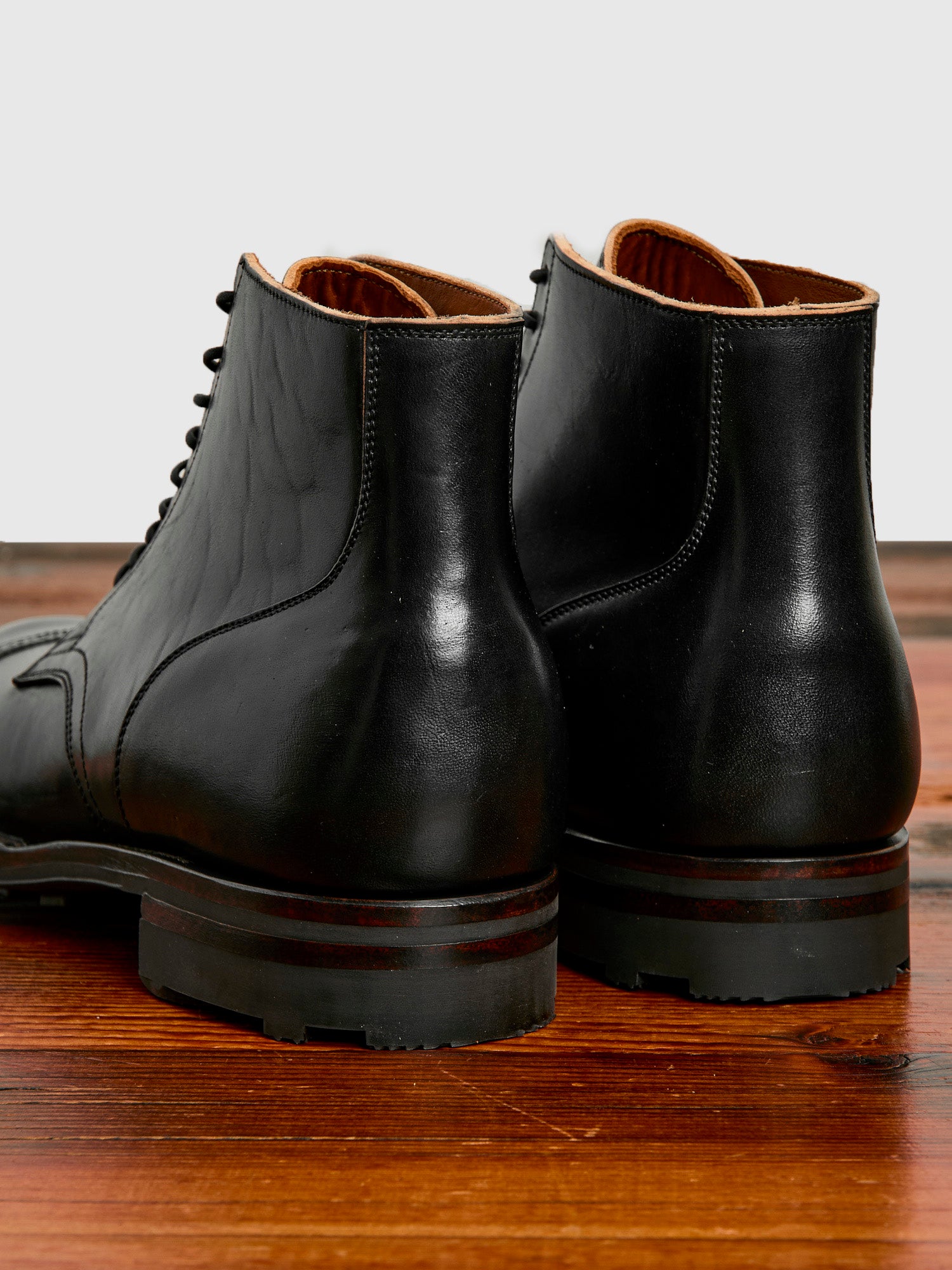 This iteration features Maryam Tannery's Vachetta Lucida Horsebutt leather, a heavyweight vegetable tanned tea-core leather known for its supple oiled surface and dense structure. Maryam's Vachetta Lucida tannage is heavily stuffed with oils and waxes, penetrating into the shell portion for a more flexible horsebutt leather with a subtle luster. With wear over time, the black surface will scrape away to reveal the leather's brown core color. The boots are anchored with a Ridgeway sole fused together with Viberg's signature stitch-down construction. Finished with tonal stitching, branded leather insole, and metal eyelets.