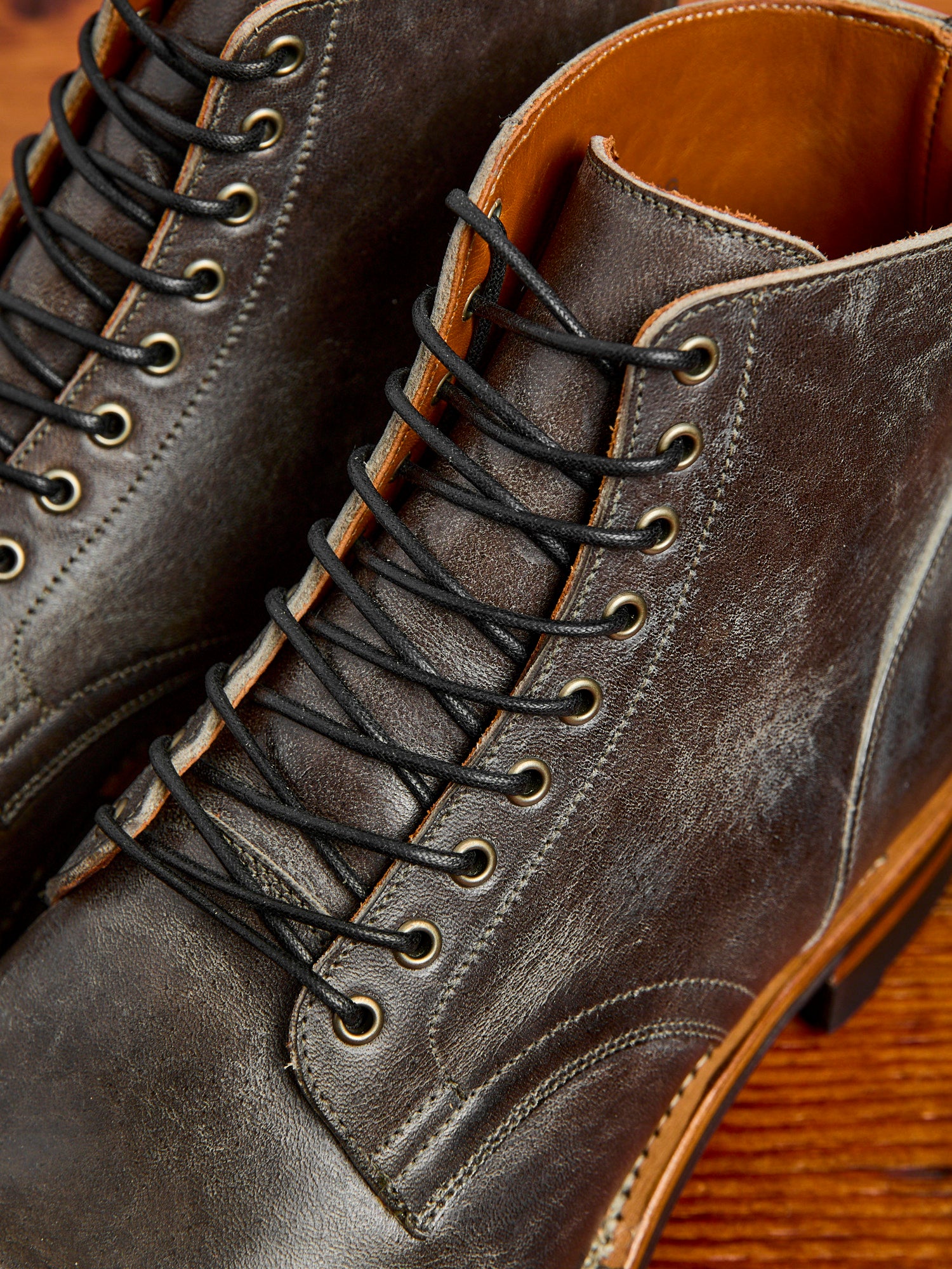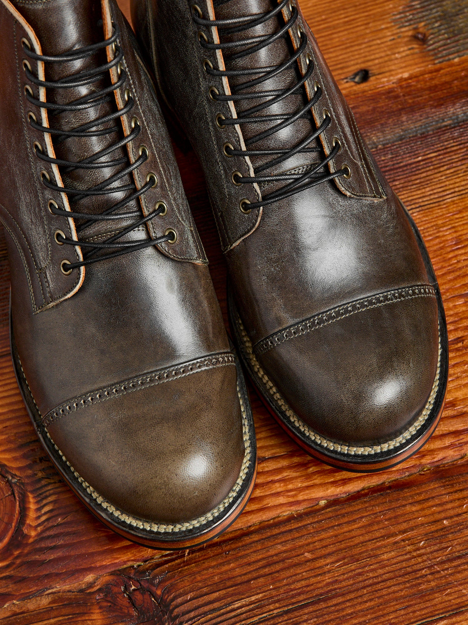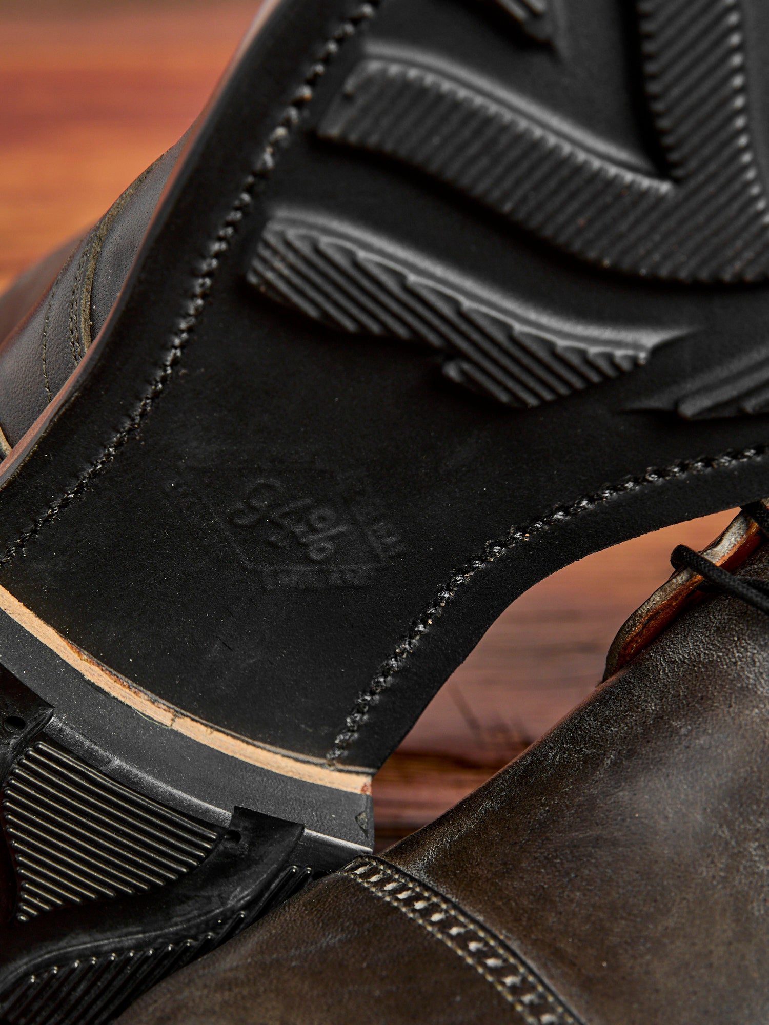 This iteration features a heavyweight, vegetable-tanned horsebutt leather courtesy of Italy’s Maryam Tannery. The "Asfalto" (Asphalt) Horsebutt is meticulously finished to preserve the hide's natural characteristics. Infused with oils and waxes that penetrate the shell portion, this leather offers a more flexible texture with a subtle luster. The boots are anchored with a Ridgeway sole fused together with Viberg's signature stitch-down construction. Finished with tonal stitching, branded leather insole, and metal eyelets.
