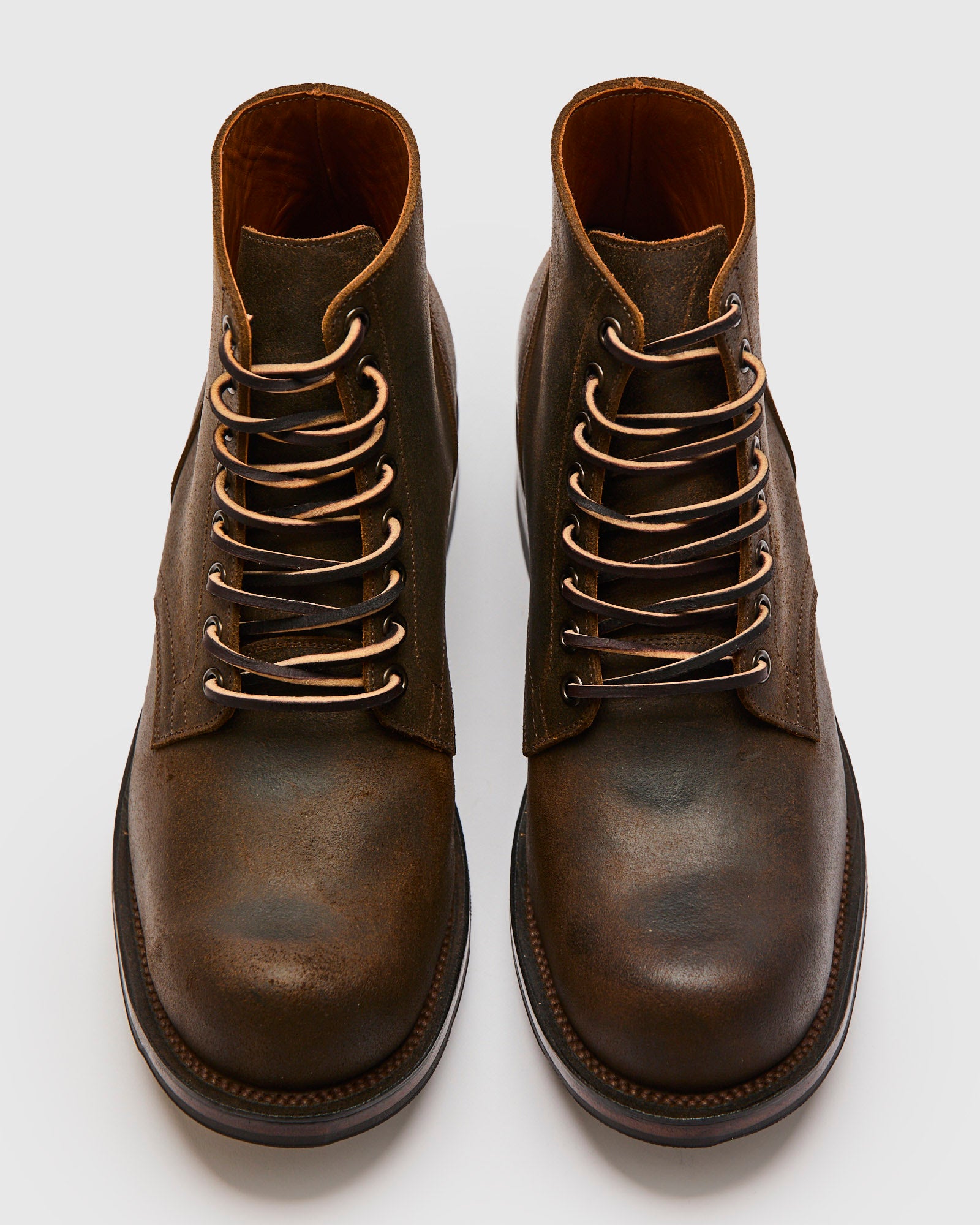 This iteration features C.F. Stead's rugged Waxy Commander tannage. The Commander leather is a heavyweight waxed suede that undergoes a special curing process to shrink and tighten the fiber structure, making it exceptionally tough, durable, and water-resistant. The leather's waxy finish and high pull-up allow for a slow, rich development. Fitted with English Dainite soles for extra grip and protection in wet weather environments.