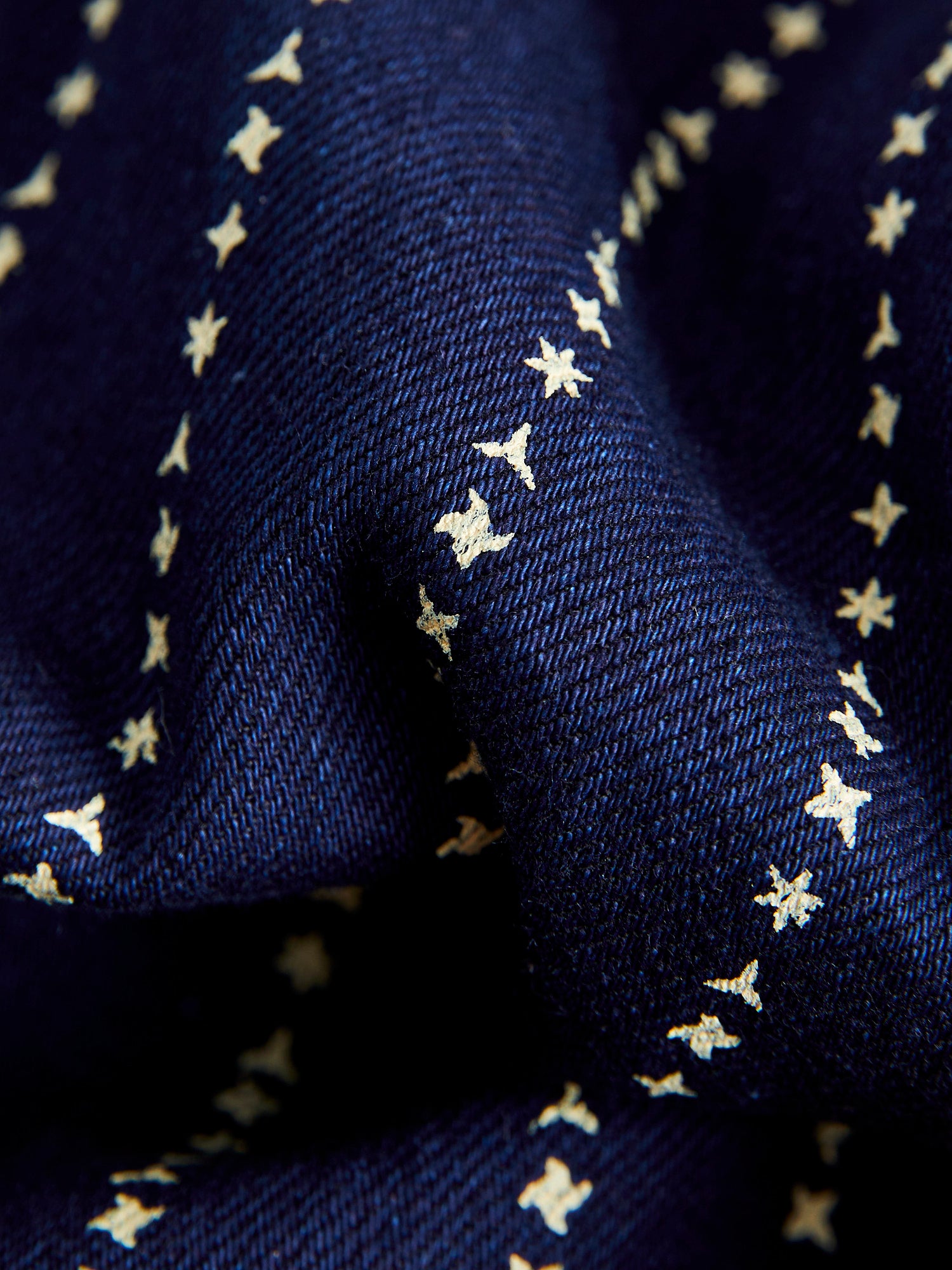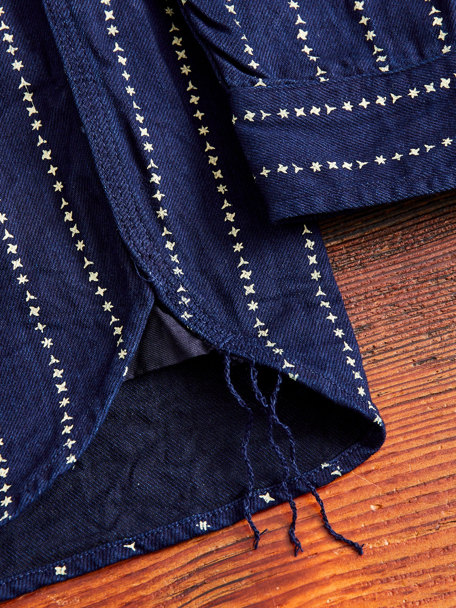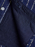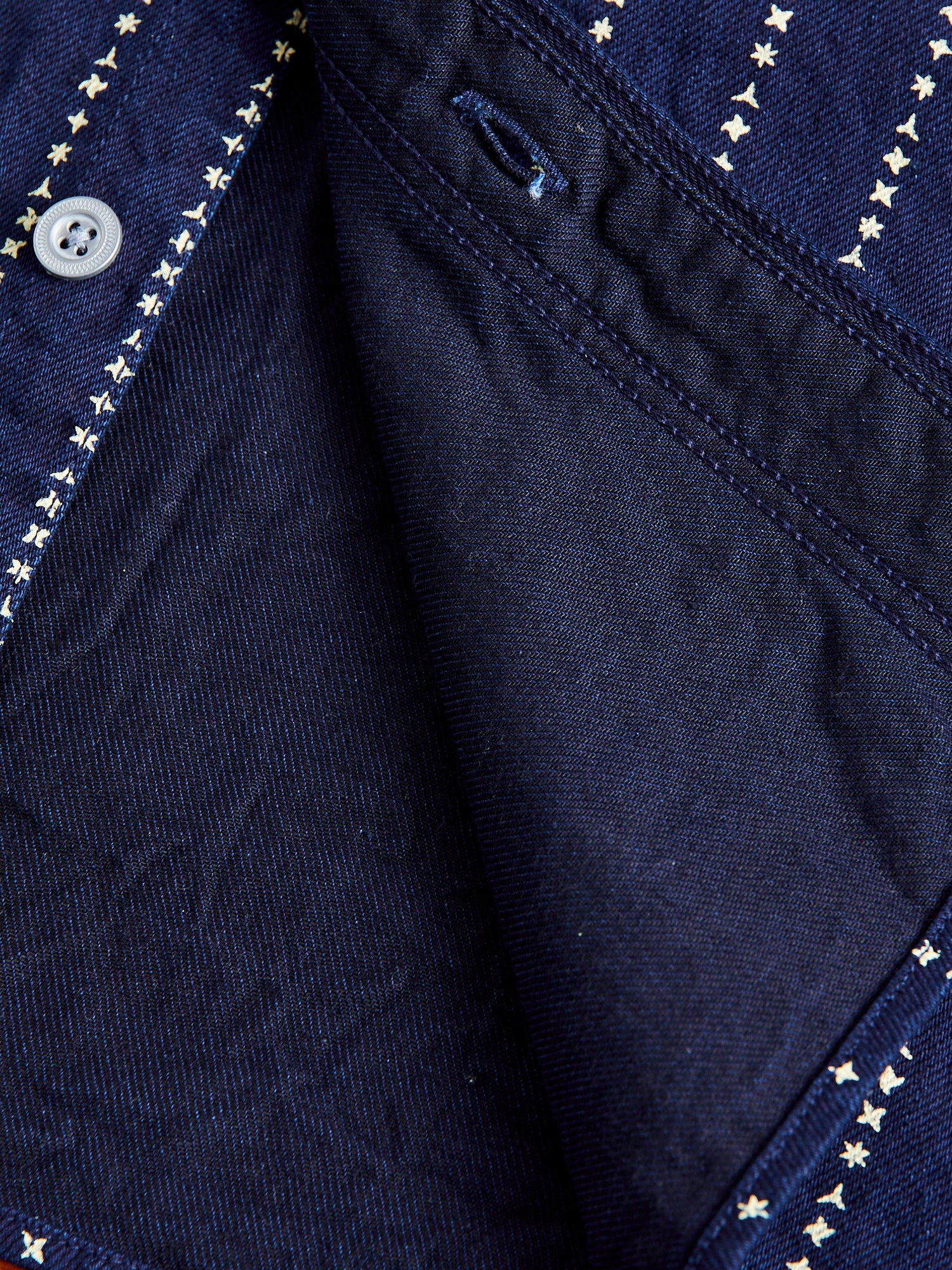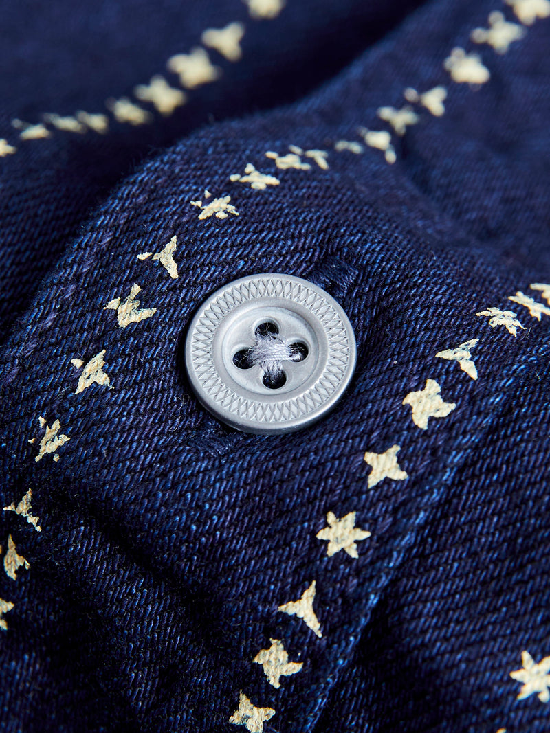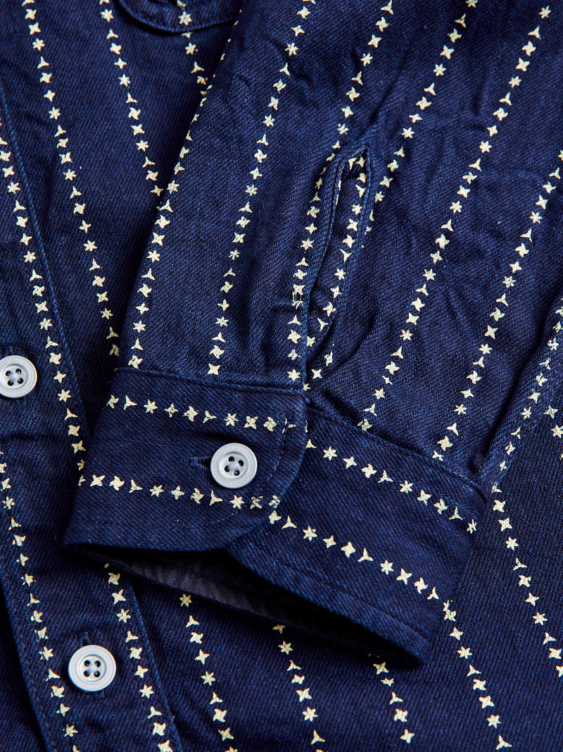 • Cherished for their beautiful fabrics and detail-oriented construction, Samurai's shirting is crafted with the same level of expertise as the brand's denim. This shirt is sewn using a lightweight wabash cloth resist dyed to represent shuriken throwing knives. The shirt features chain-stitched side seams, gusseted side vents, and custom detailing accentuating the brands uniquely Japanese ethos.